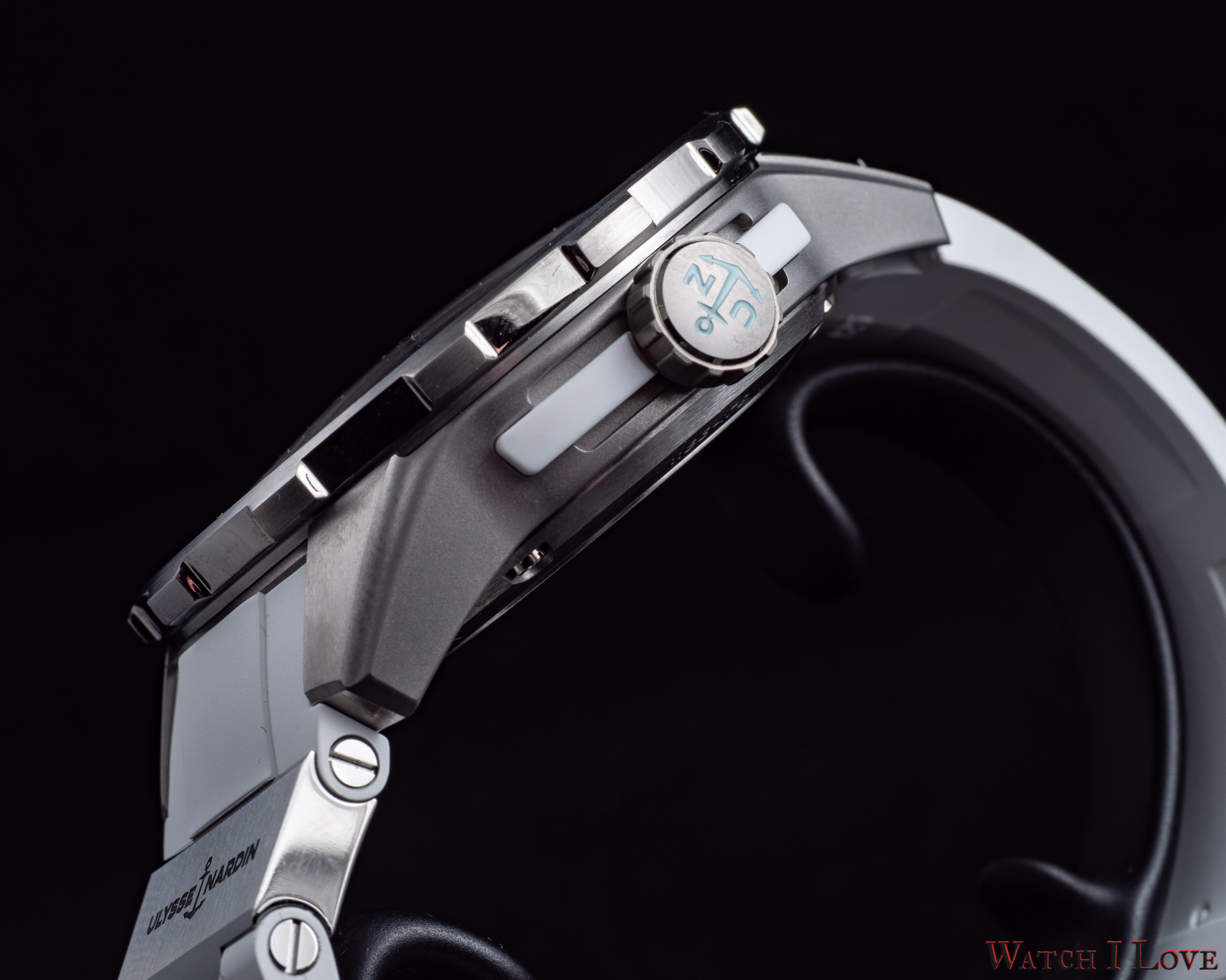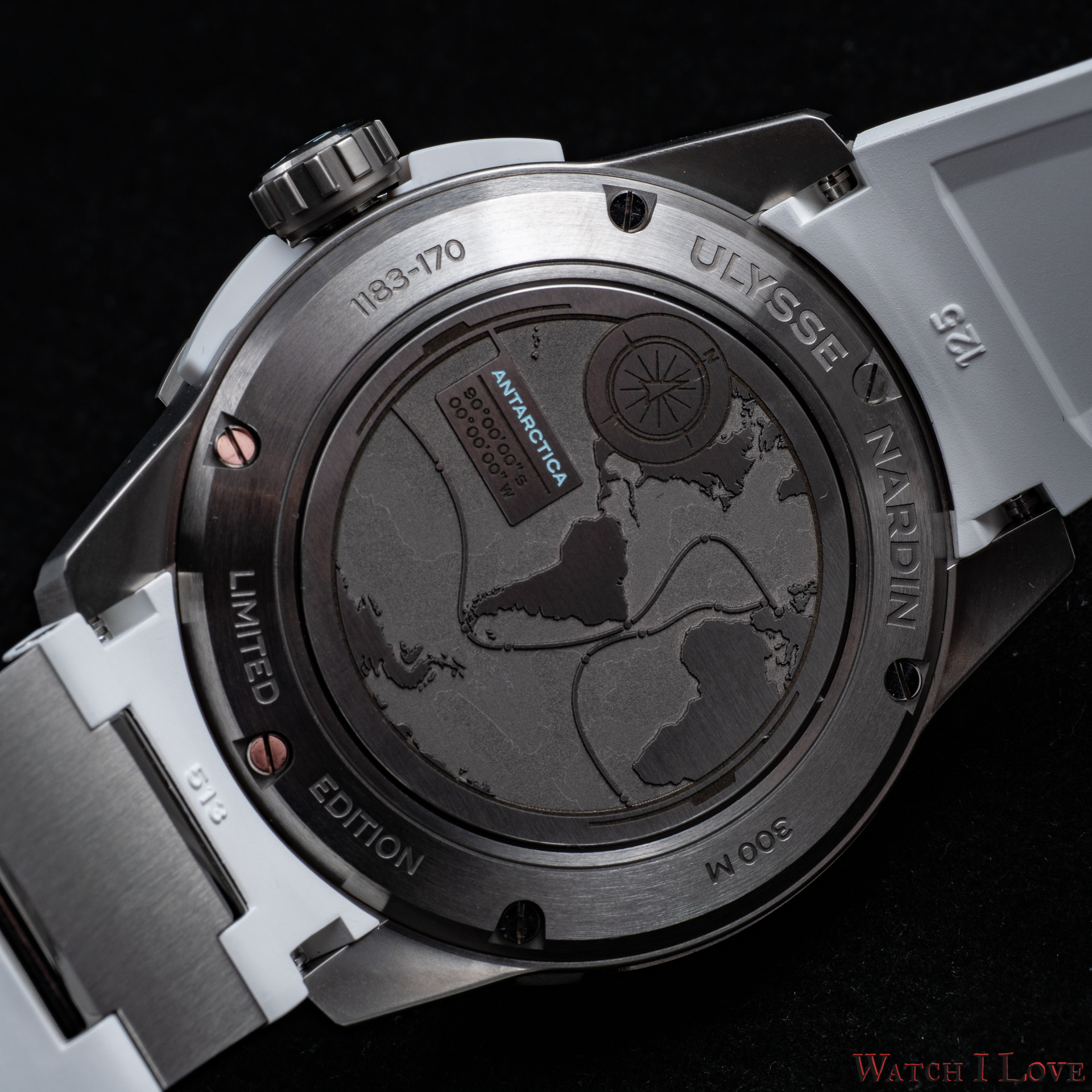 Diver X Antarctica comes in 44 mm titanium case. The top is covered by a titanium bezel with rubberised insert. The bezel’s timing displays a 20 minutes indication ( in comparison with the usual 15 minutes). The watch is accompanied by a white rubber strap with Ulysse Nardin metal link familiar from other UN models. The protected crown bears the UN logo with lacquered in light blue, the same shade found on different watch elements.