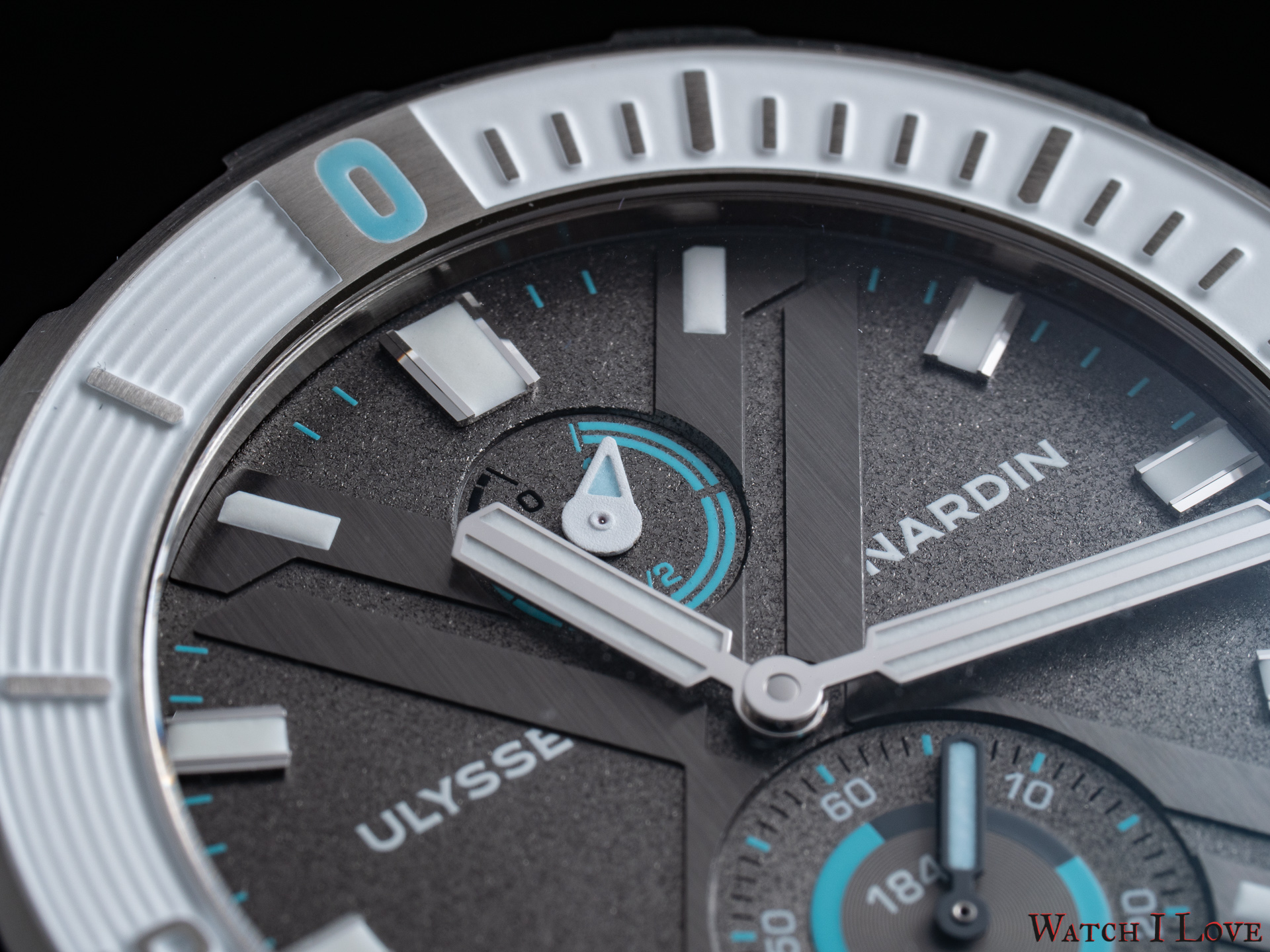 Ulysse Nardin Diver X Antarctica comes with a very interesting and textured composite dial. The watch face features the “X” that marks the “We are eXplorers” credo of the series. Huge luminescent indexes are accompanied by rather large hands, richly filled with luminescent assures good legibility in any light condition. The top of the dial holds the recessed dial of the power reserve indication – a piece of crucial information for the watch’s precision.
