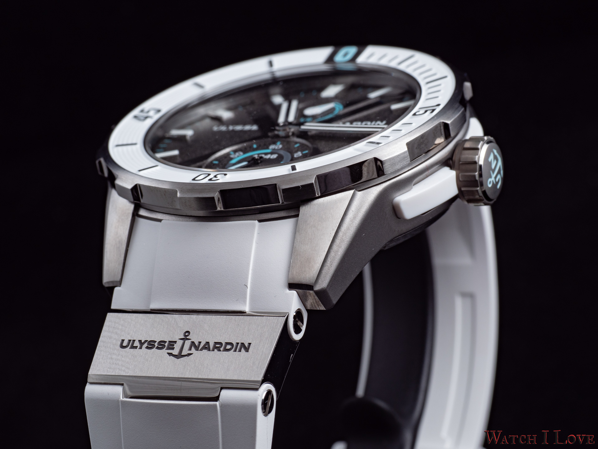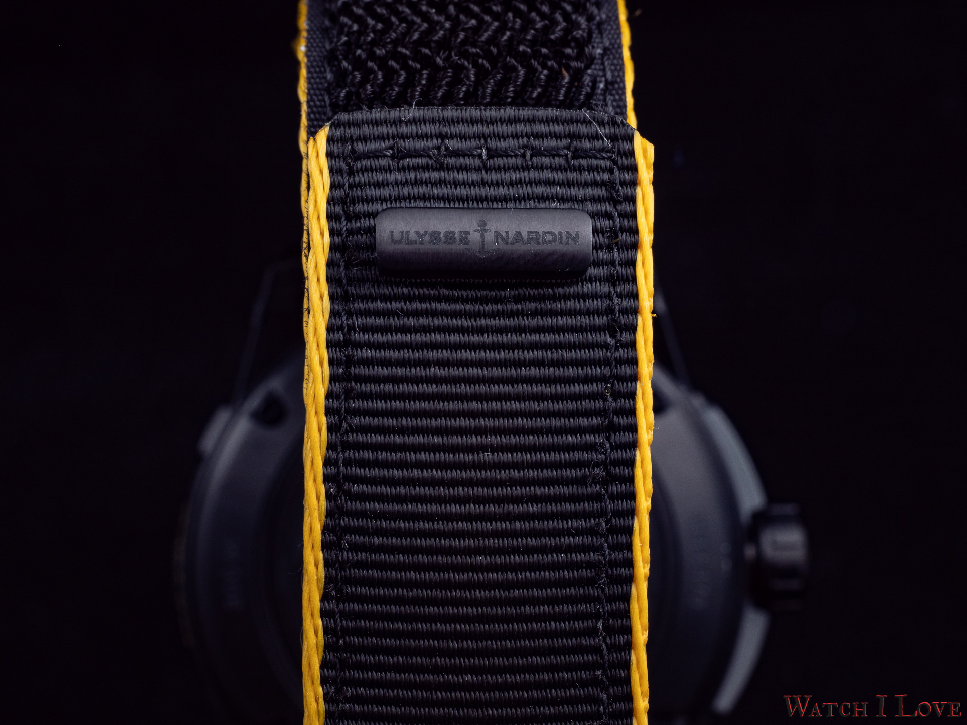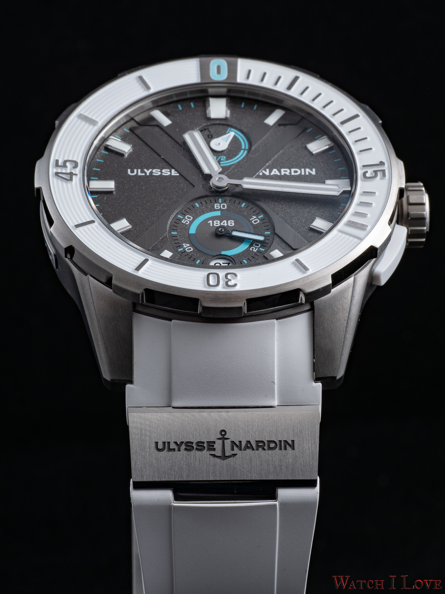 The watch is fitted with a classic titanium pin buckle with Ulysse Nardin engraving.