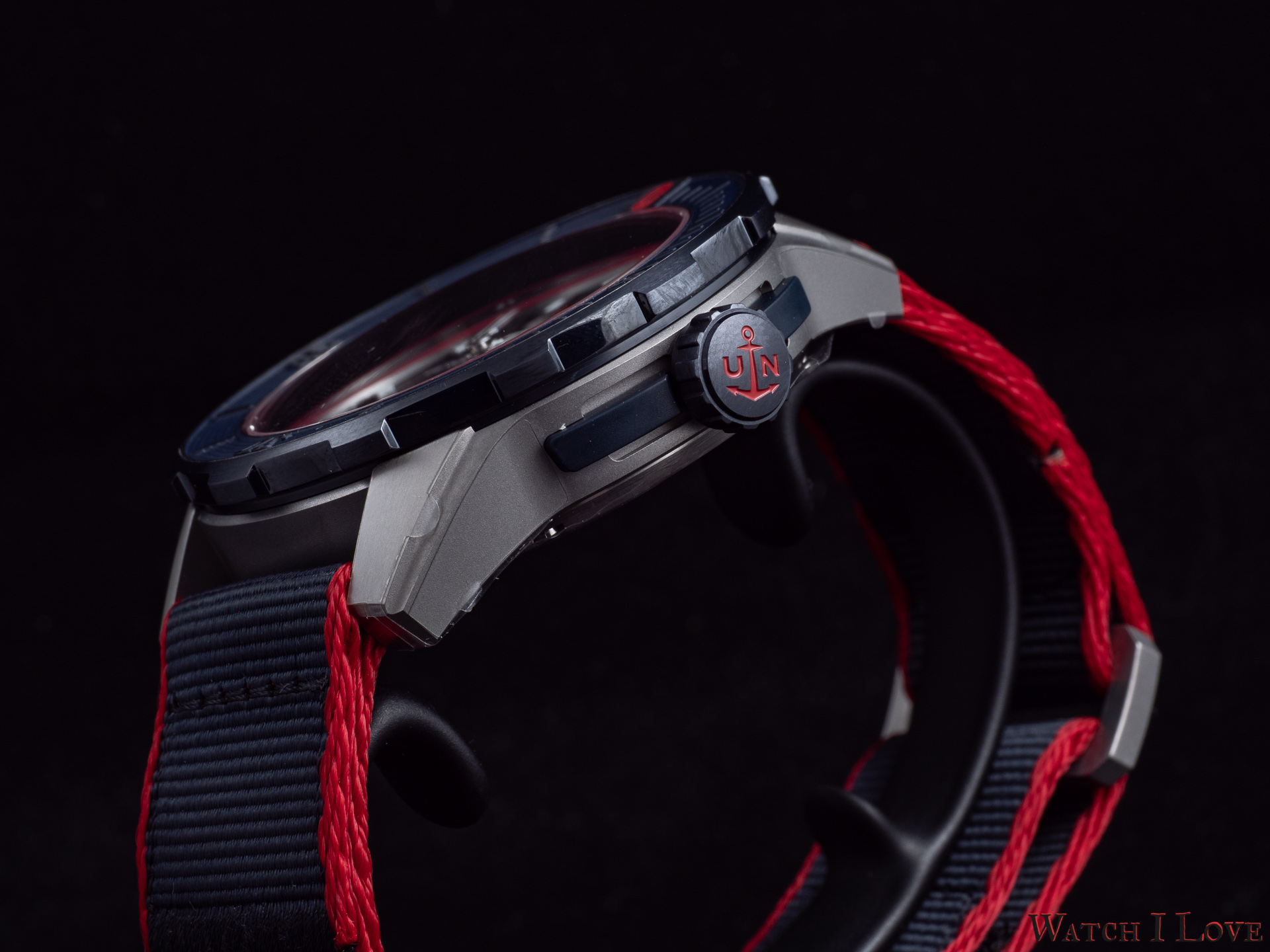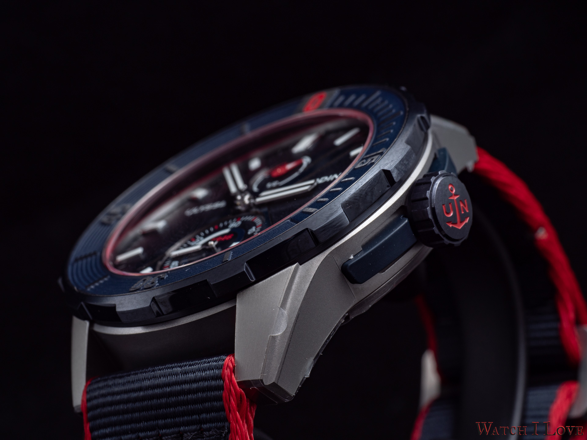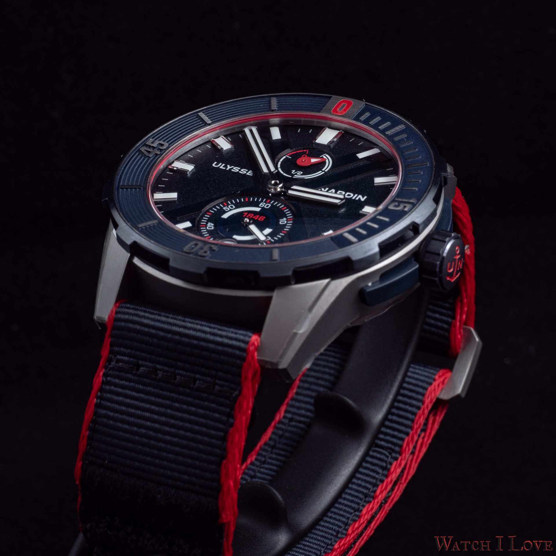 The watch is fitted with a classic titanium pin buckle with Ulysse Nardin engraving.