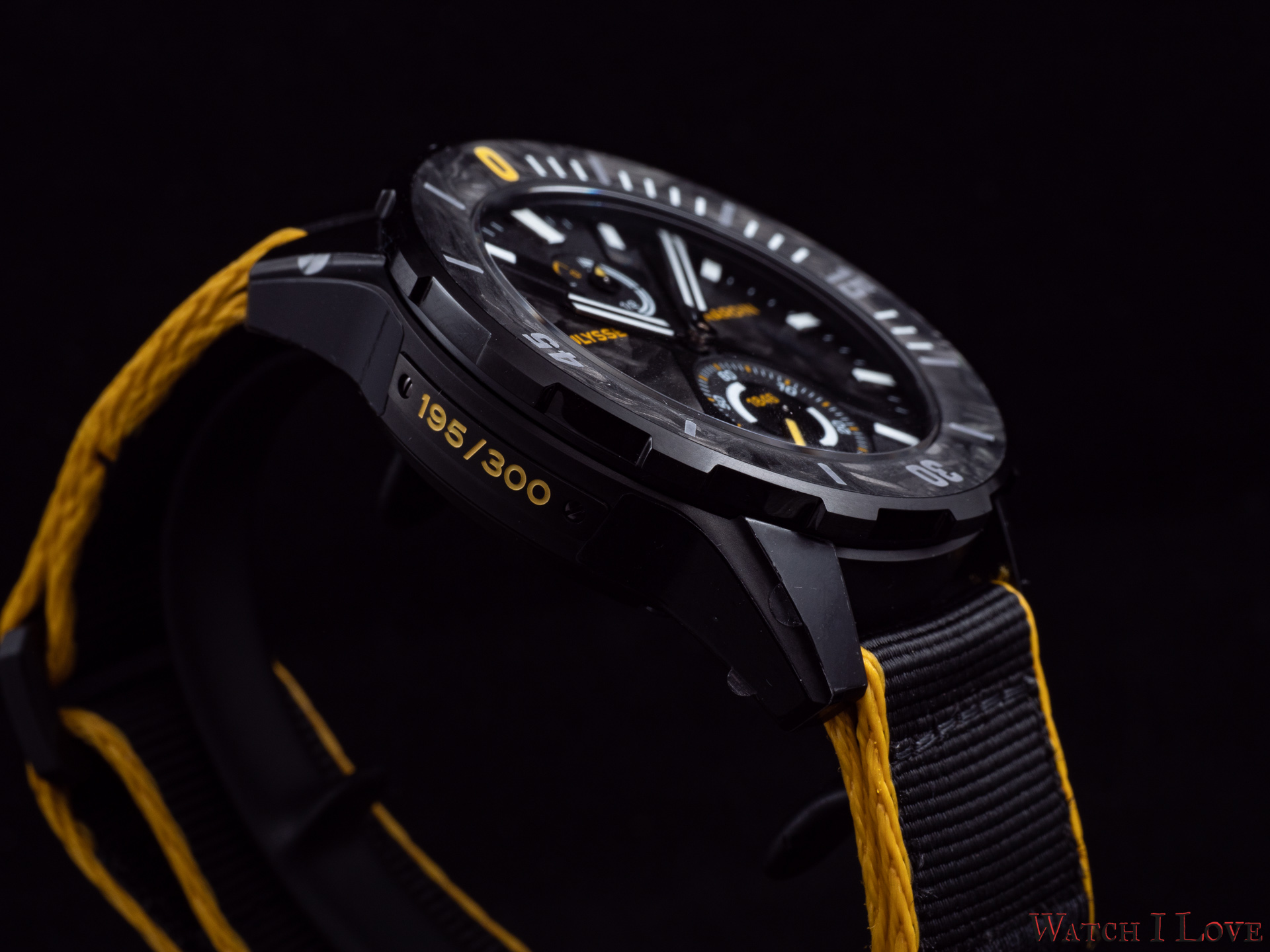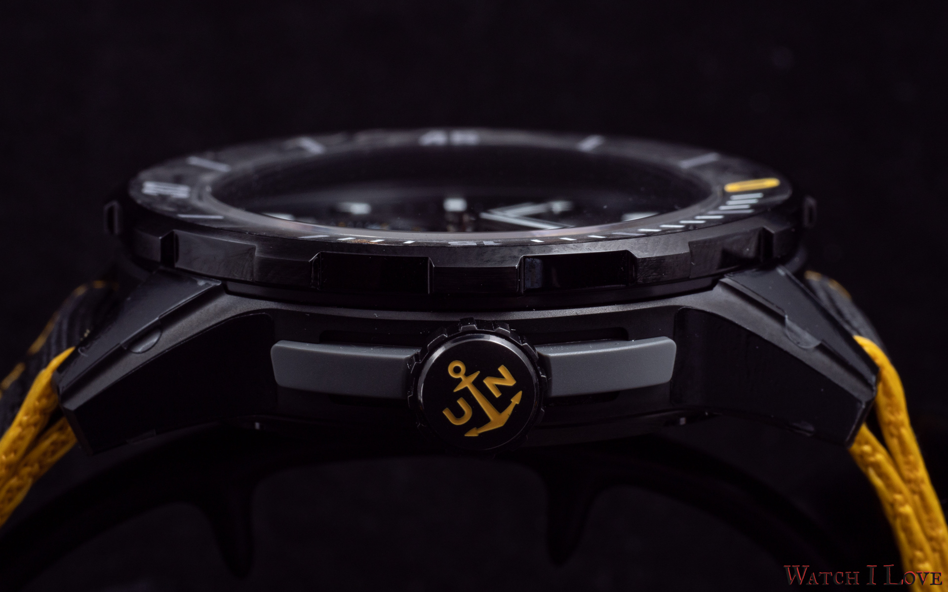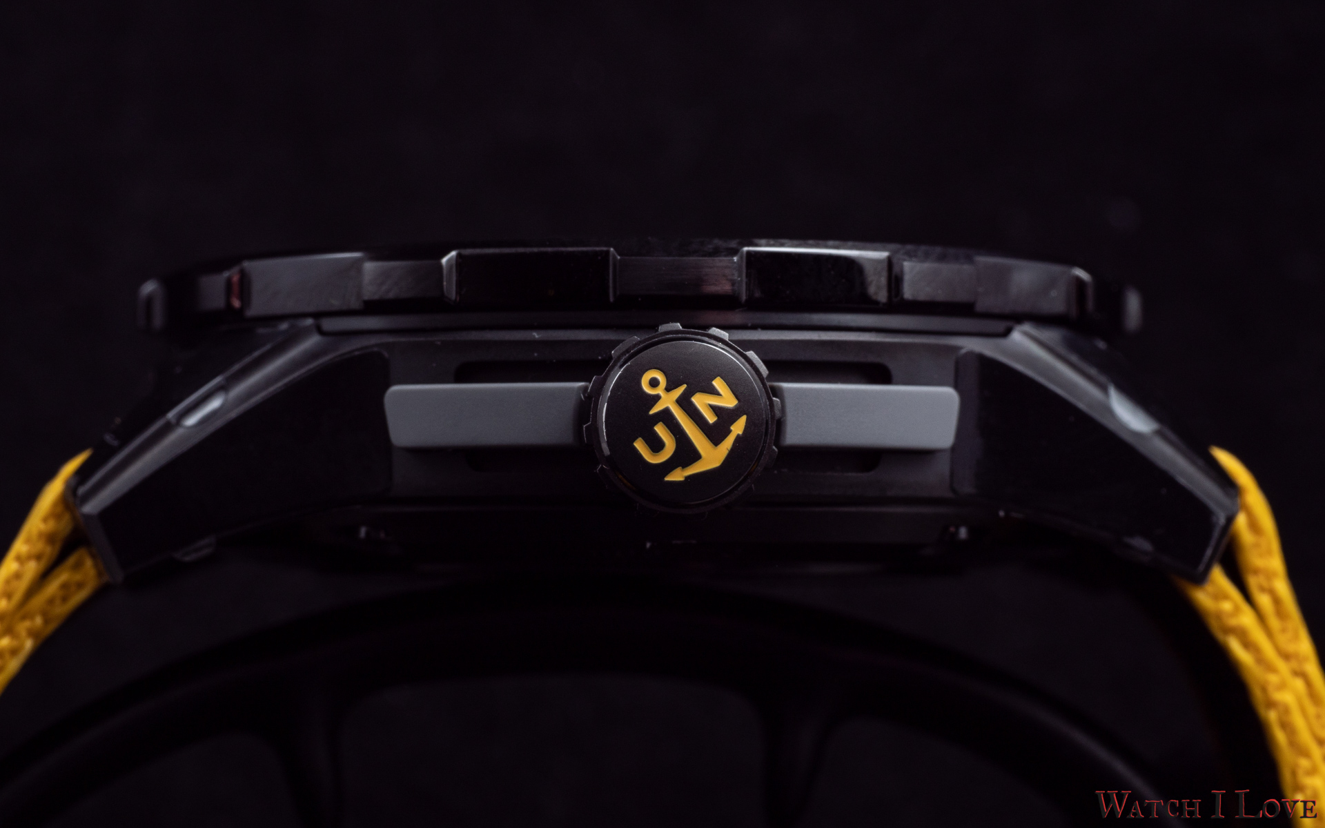 As its “brother” in the line reserved for the Vendée Globe, the Diver X Cape Horn comes with a titanium case, this time in black. The colour accents are now in yellow and offer an extremely good contrast but also a very pleasant look.