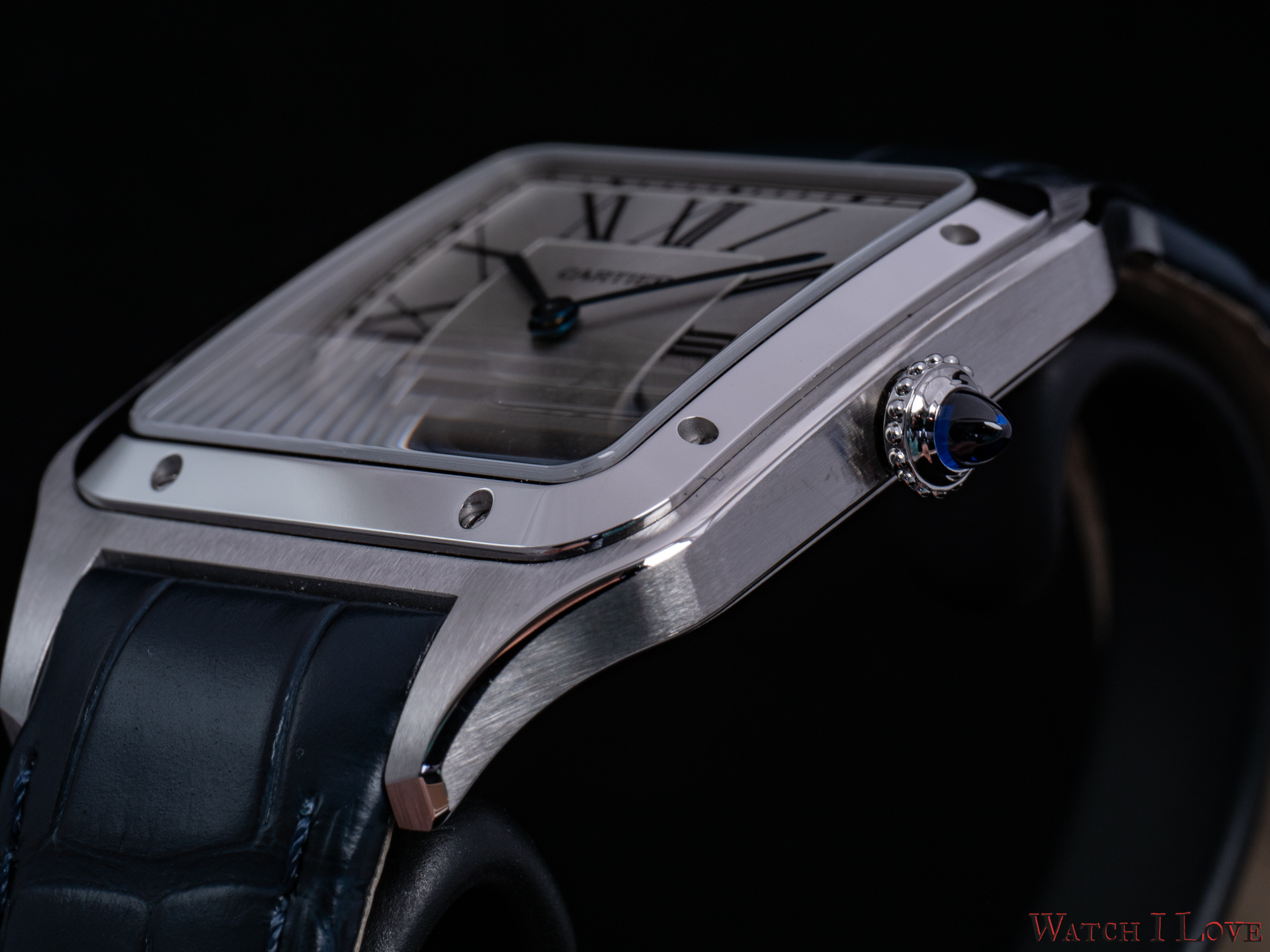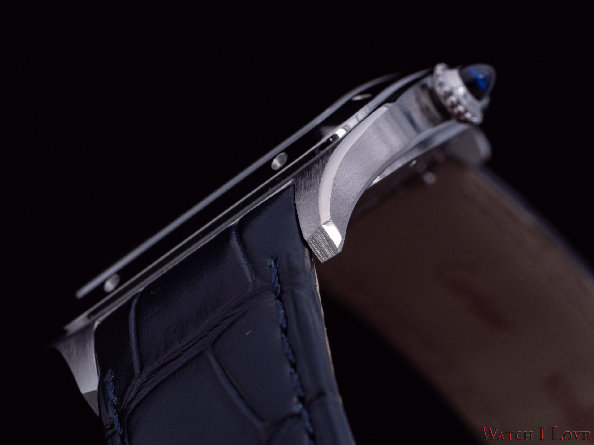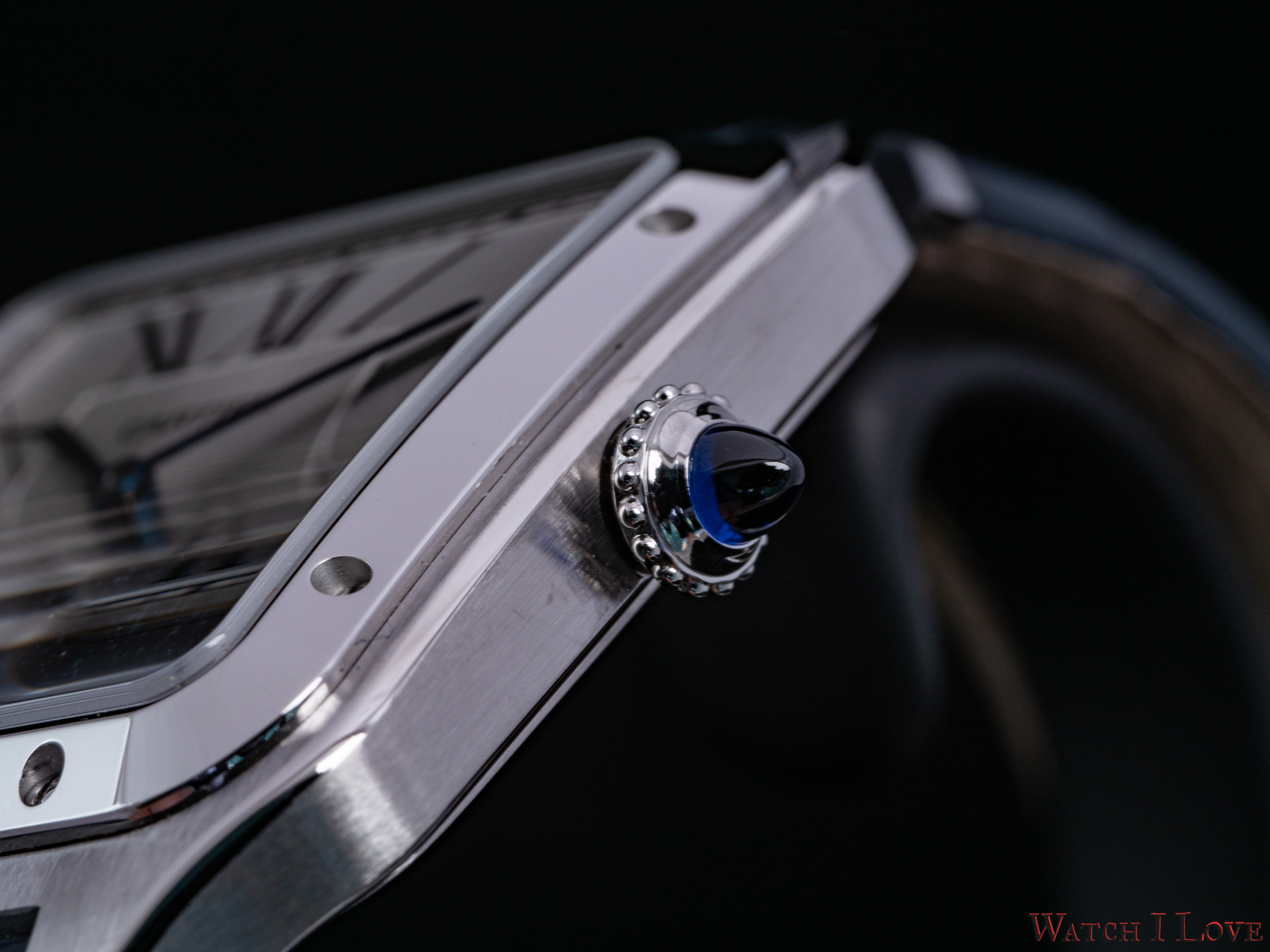 On the right, we can admire the gorgeous crown with blue cabochon – a shape and design also inspired by the 100 years old classic Santos. In comparison with the rest of this simple watch, the crown might seem flamboyant but it is the noblesse and the luxurious note of the collection. Moreover, it offers excellent behaviour on set and wind due to its good grip.