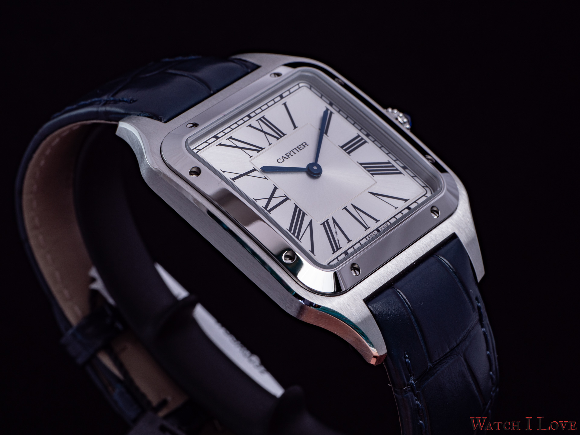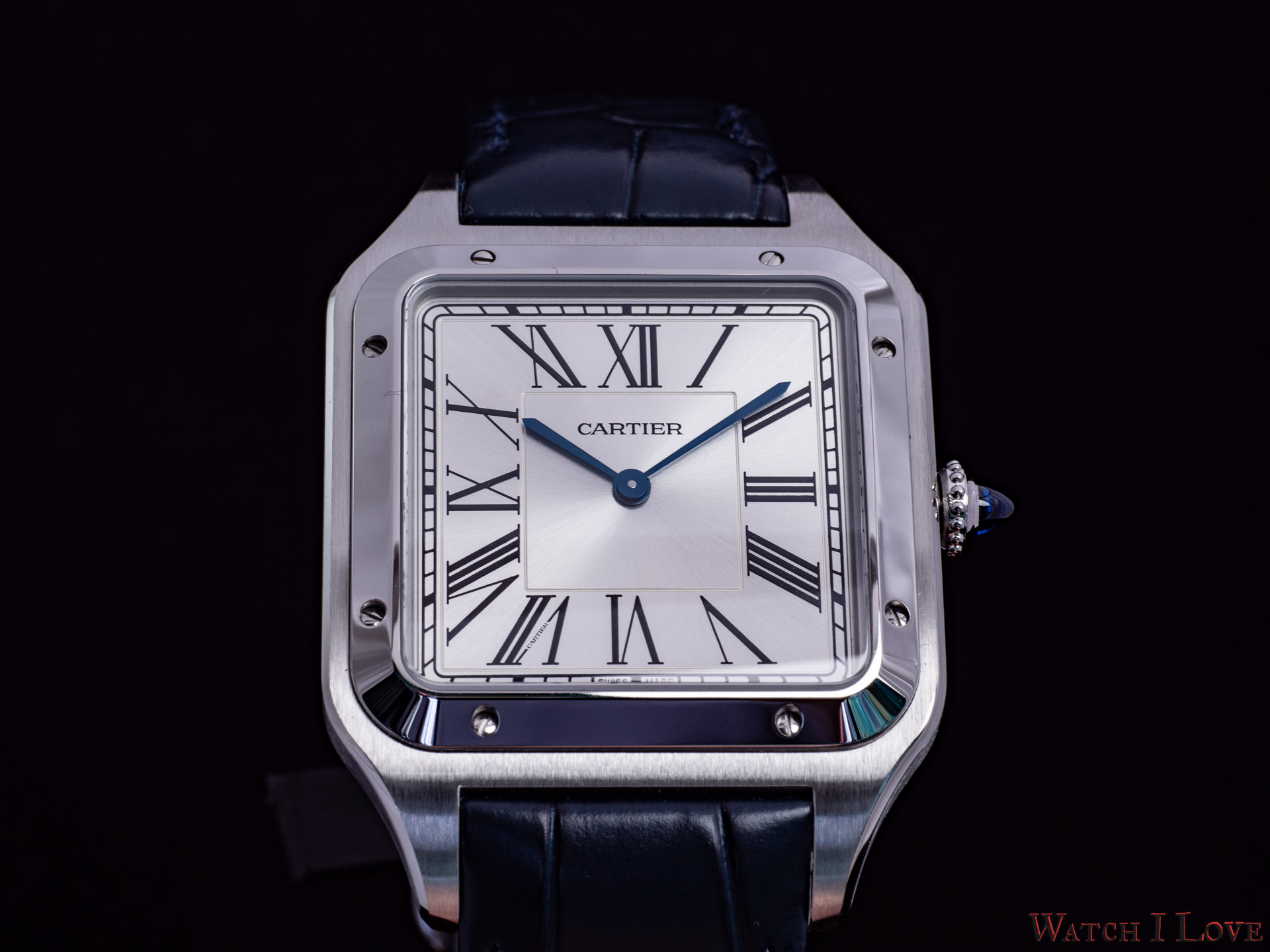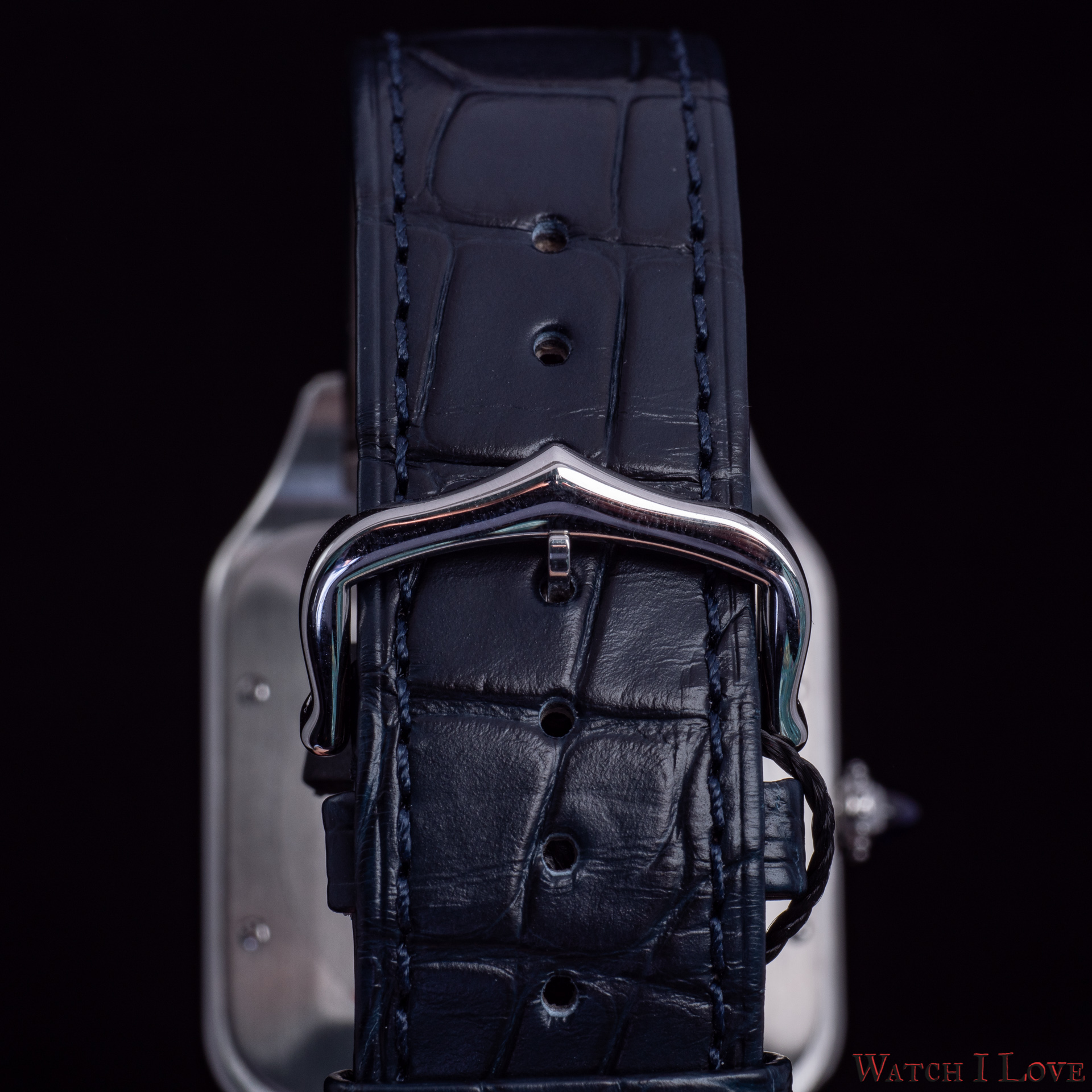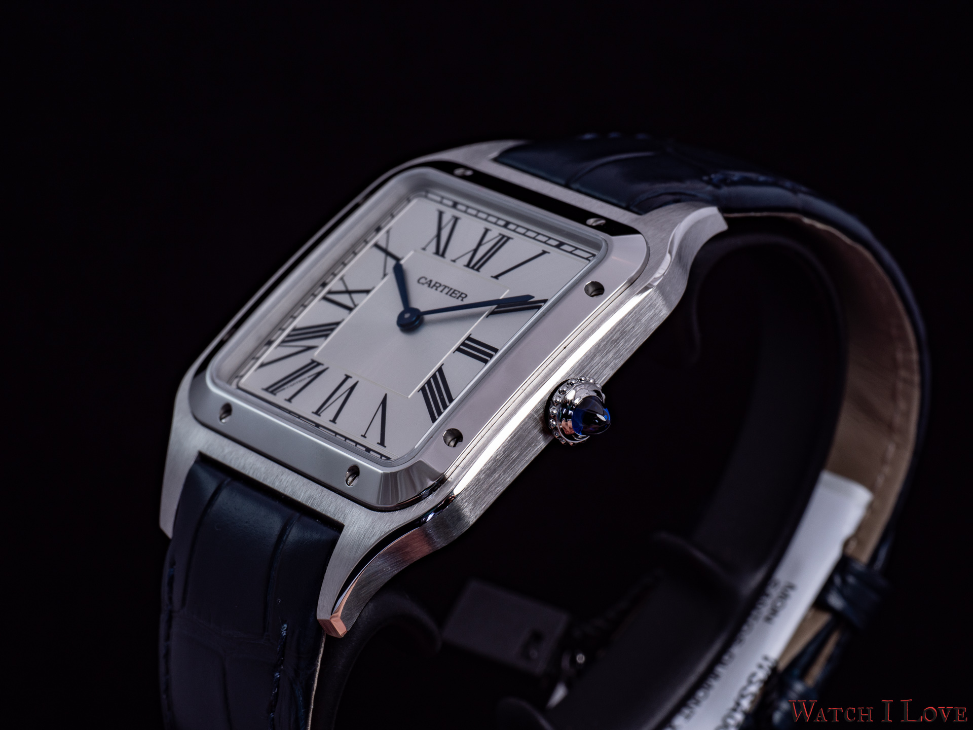 On the right, we can admire the gorgeous crown with blue cabochon – a shape and design also inspired by the 100 years old classic Santos. In comparison with the rest of this simple watch, the crown might seem flamboyant but it is the noblesse and the luxurious note of the collection. Moreover, it offers excellent behaviour on set and wind due to its good grip.