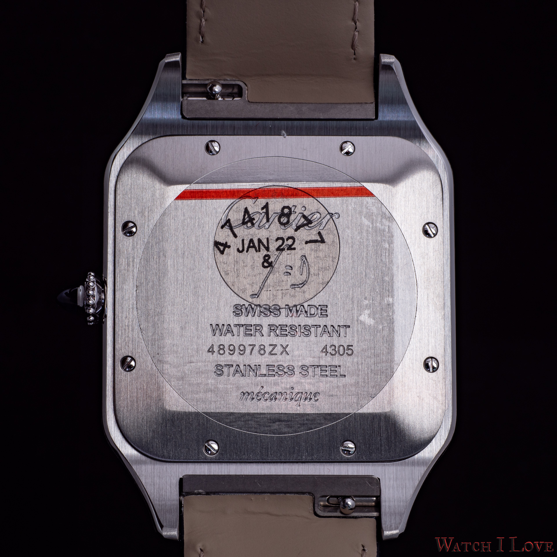 Cartier Santos Dumont XL Steel is powered by the Calibre 430MC. This movement produced by Piaget (base 430P) is a known calibre in several Cartier pieces (Ballon Bleu, Panthere Jewelry, Santos-Dumont, Ronde Louis Cartier, Tortue, Baignoire, Drive de Cartier and even the Tank). The hand-wound movement has a power reserve of 38 hours. It has proved, in time, its robustness and reliability. The 131 pieces movement has a relatively slow oscillator at 21,600vph. The small movement, of 20.50mm diameter, is not visible due to the closed metal back. But I have seen several in the wild and they are gorgeously decorated with “C” de Cartier.