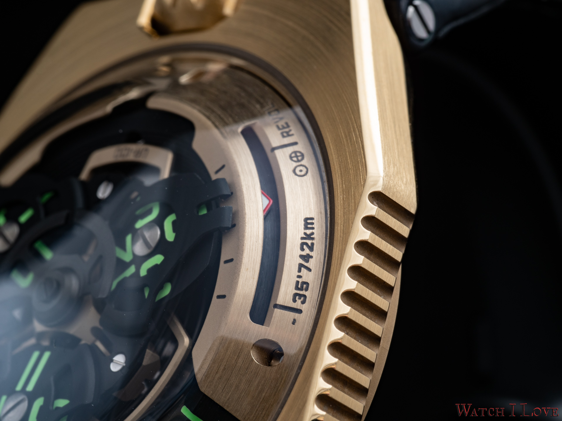 URWERK UR-100 Gold Edition displays under a highly domed sapphire crystal the brand’s planetary system. The complex system reveals three indications. At 10 o’clock, the watch reveals the distance in km that our planet travelled arround its axis.