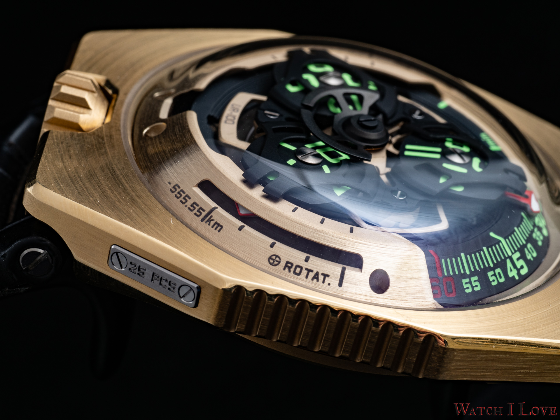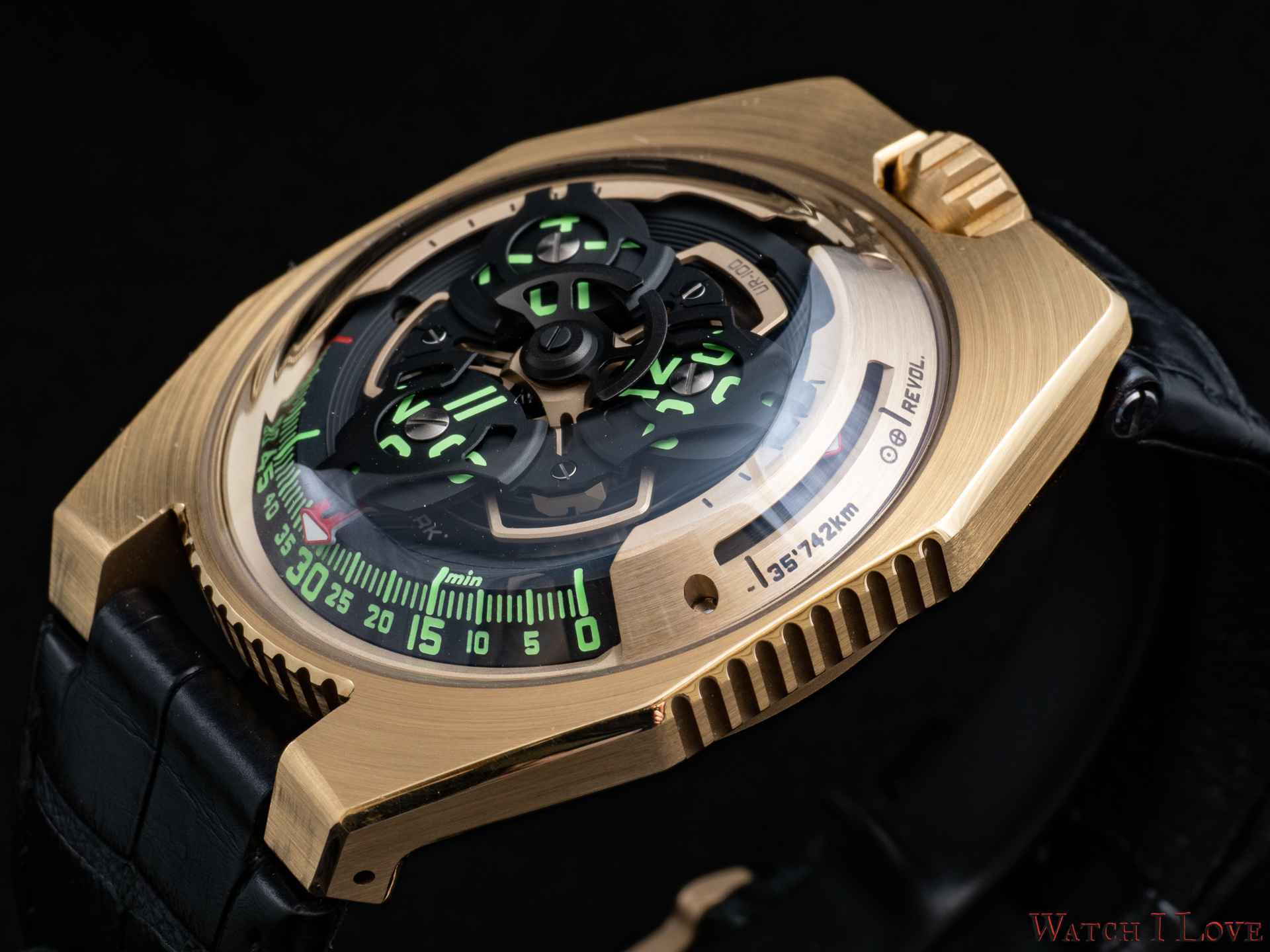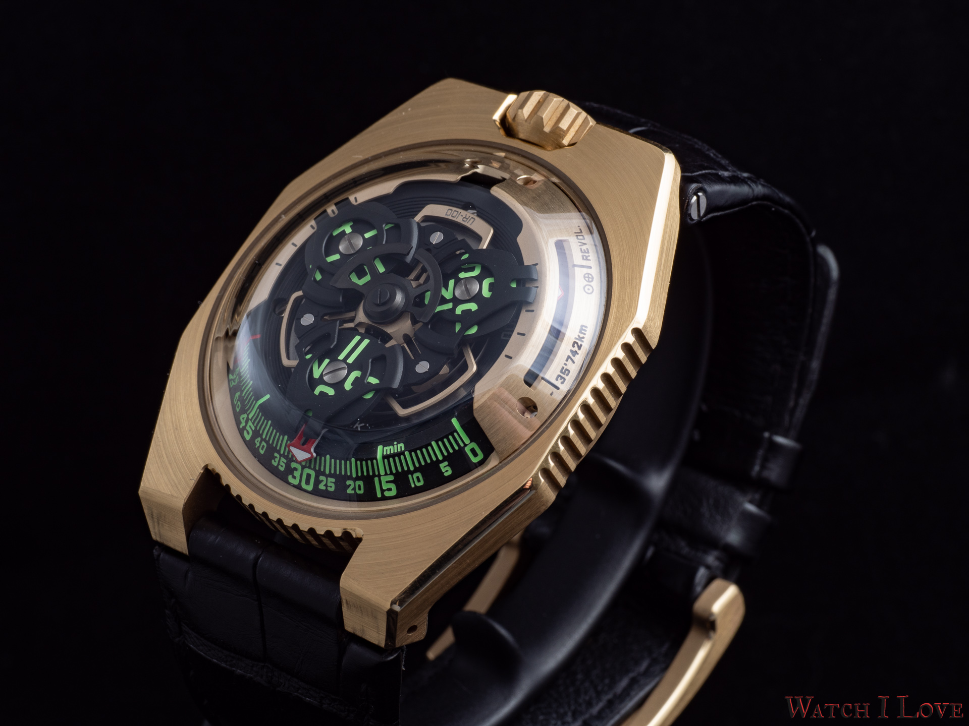 My first encounter (digital) with the brand was during my university years. A very small group of people trying to discover the world of watches were searching frenetically the Internet for the most interesting watches. In 2003 we discovered a brand using a very unusual satellites system that reveals the time with disks gliding above a minutes’ track – the UR103. The watch was exposed directly from parallel worlds since for us/me, this kind of watch was like a beautiful dream, like an exceptional Sci-Fi book. We never hoped to see such a watch live. So I am very grateful that, years later, this magical world embraced me and I am able to share with you my own, personal experience with one of the latest URWERK watches, the UR-100 Gold Edition.