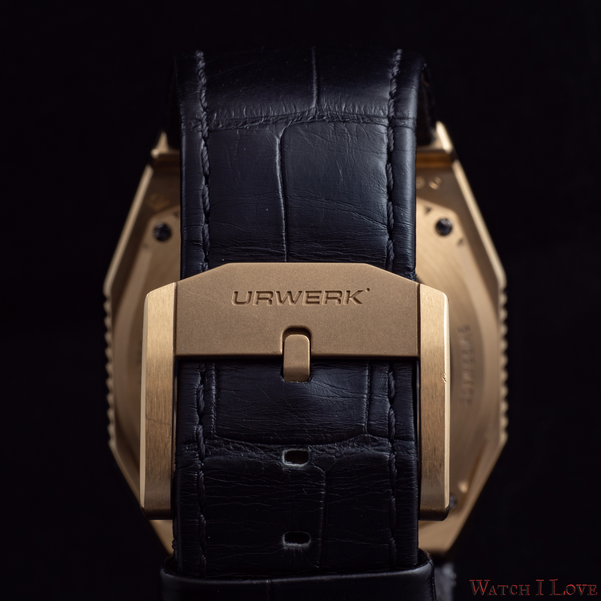 The caseback is fixed with URWERK proprietary screws. A sapphire crystal reveals the back of the Calibre UR 12.01. The watch is fitted with a leather strap with 2N pin Buckle with a brushed and sand-blasted finish. The name of the independent is engraved.