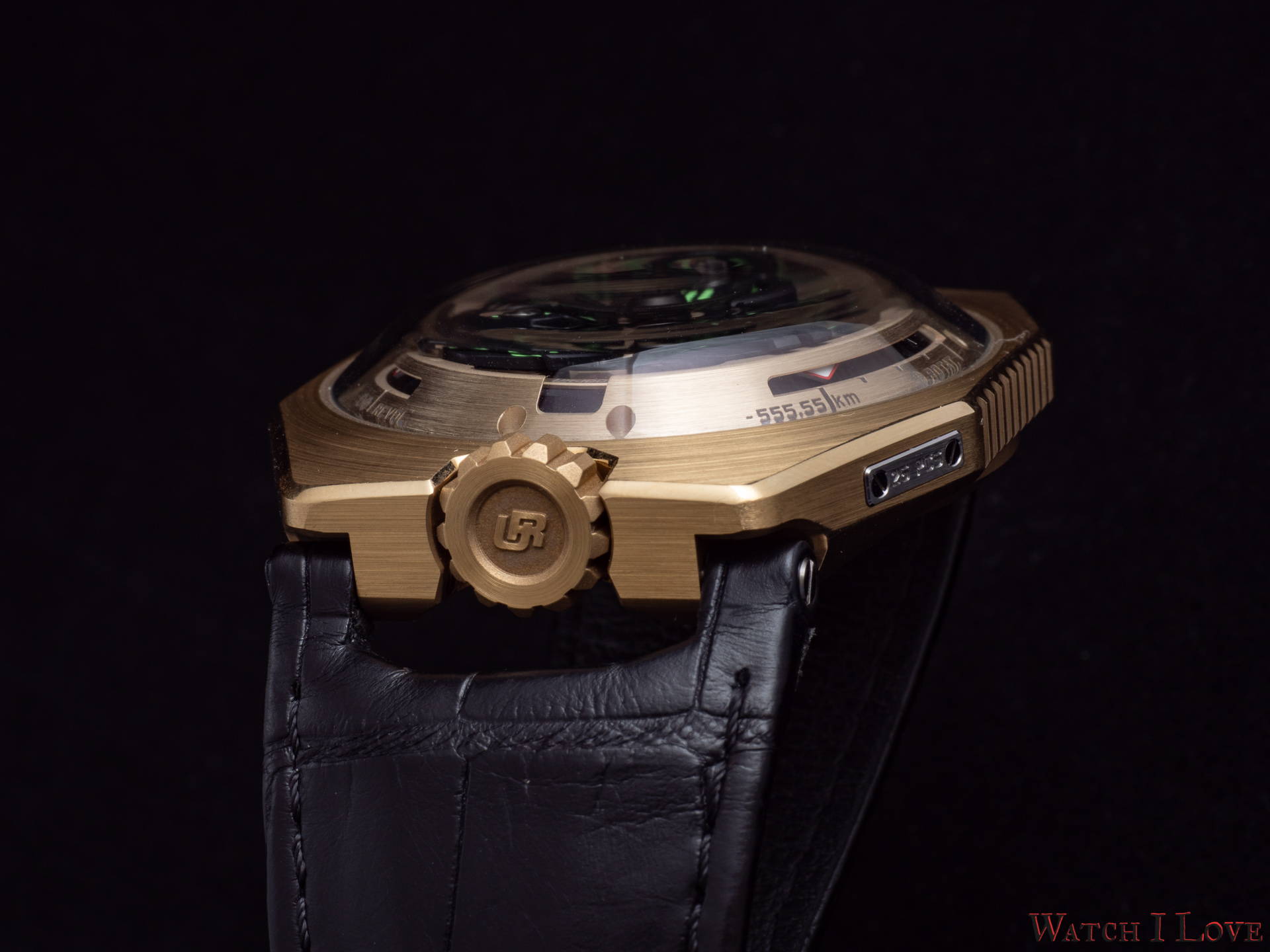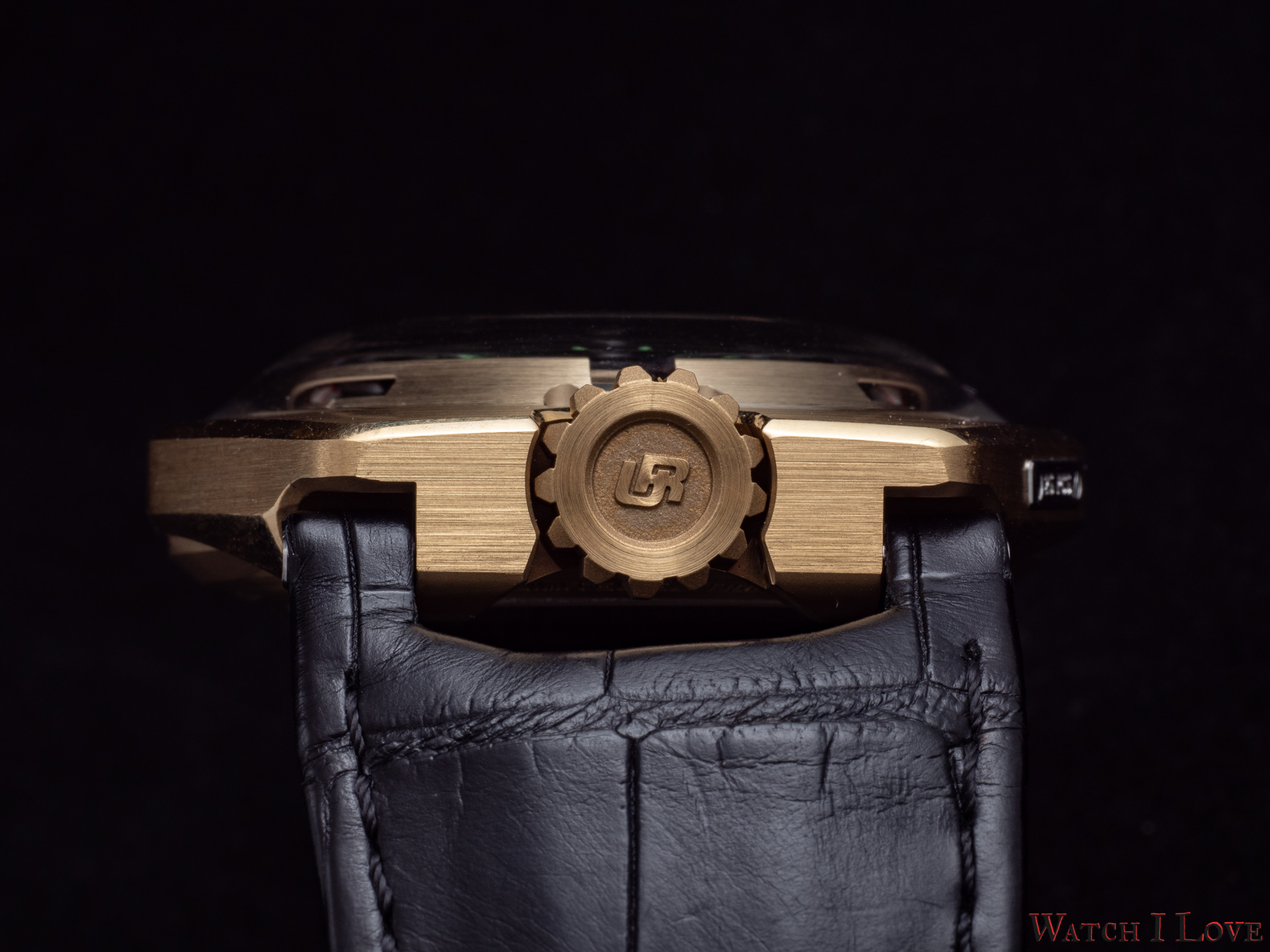 The case is manufactured in a very good looking 2N gold measuring 49.7mm in length and 41mm in width. Due to its smart lugs system, the URWERK UR-100 Gold Edition offers a very comfortable position on the wrist. Its construction makes it look good on a wide selection of wrist sizes. The case is finished with a matt brush, circular on top and horizontal on sides.