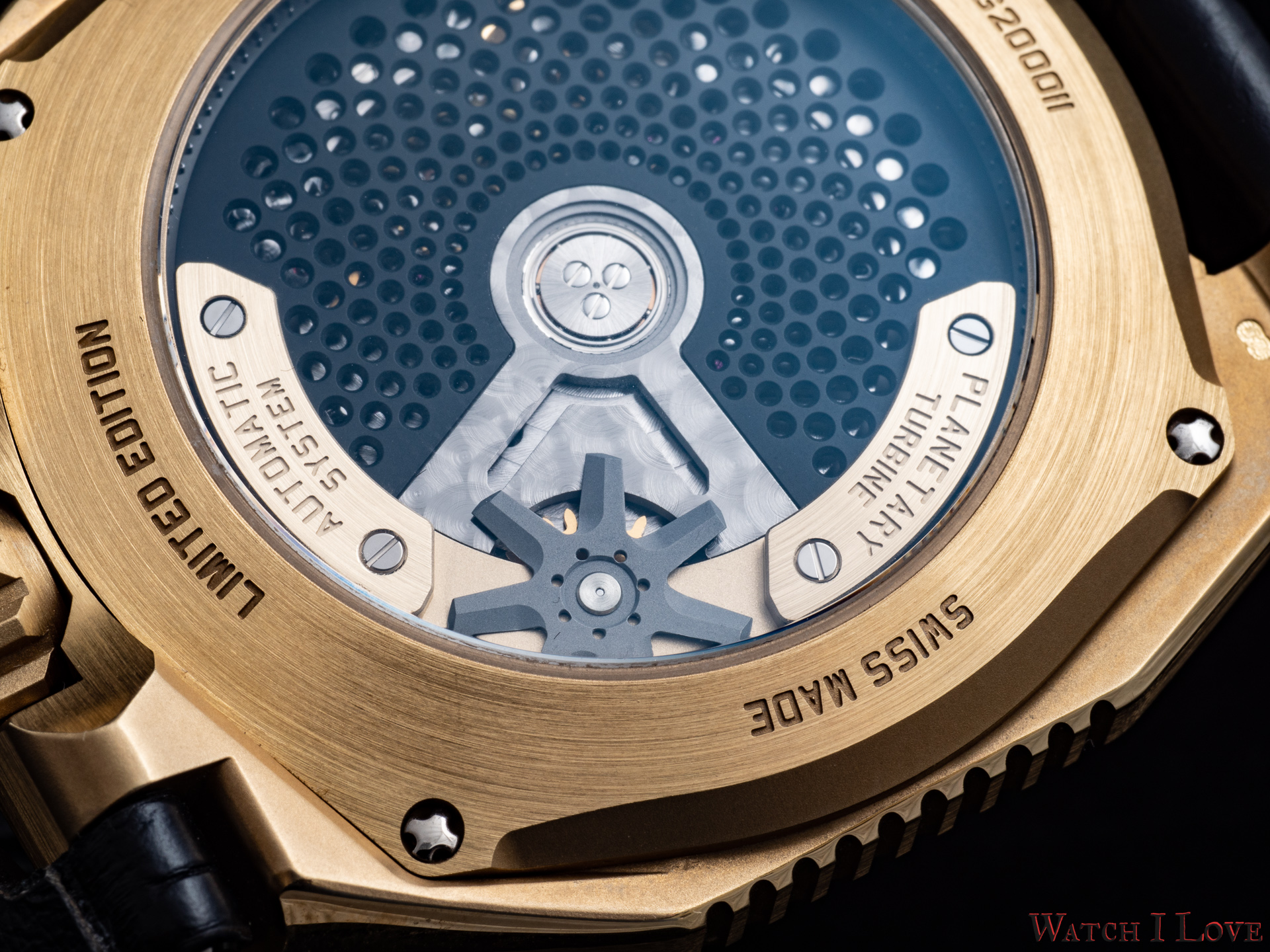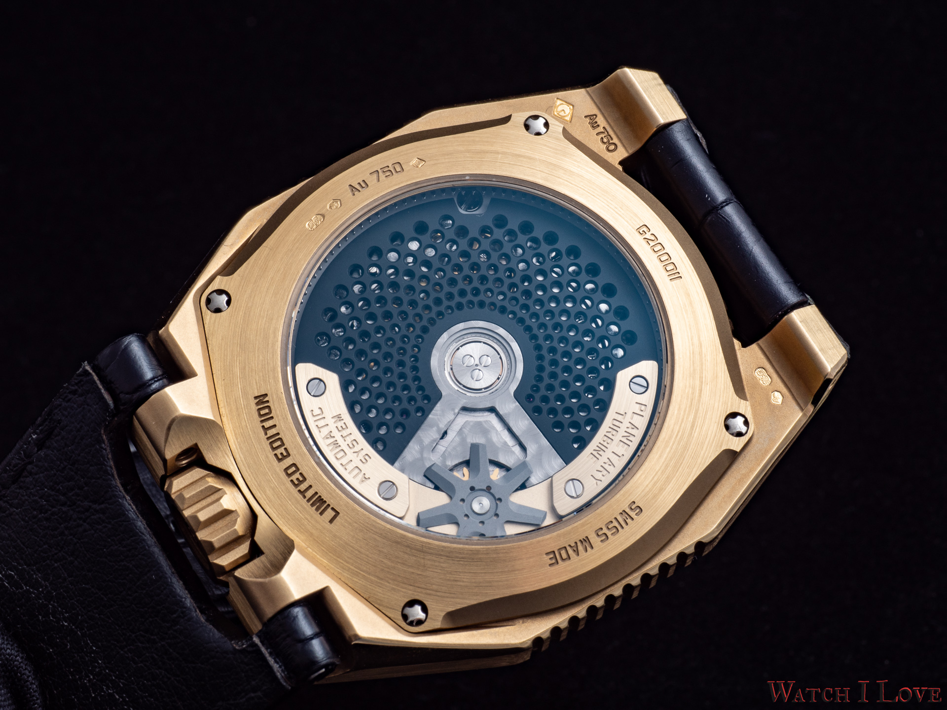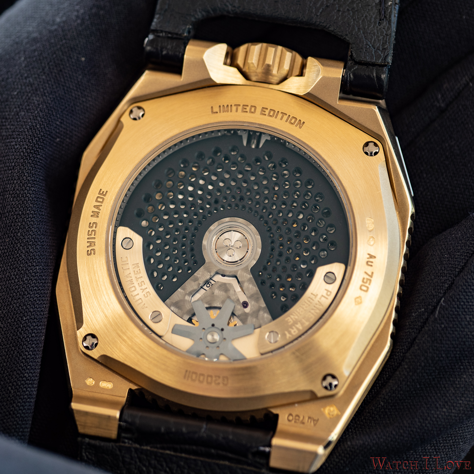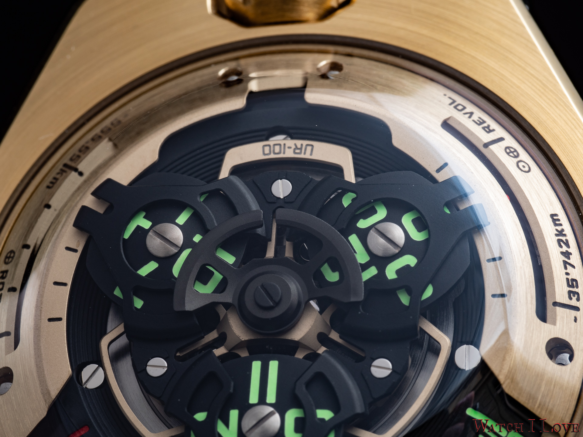 URWERK UR-100 Gold Edition is powered by the Calibre UR 12.01. While most of the technicalities are shown on the dial side in the form of the aluminium satellite hours on titanium Geneva crosses and Aluminium carousel, the back keeps the movement hidden behind the intriguing rotor weight – planetary turbine automatic system.