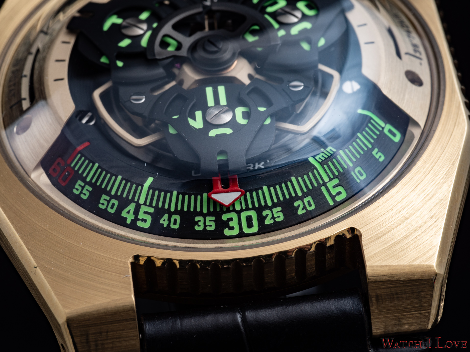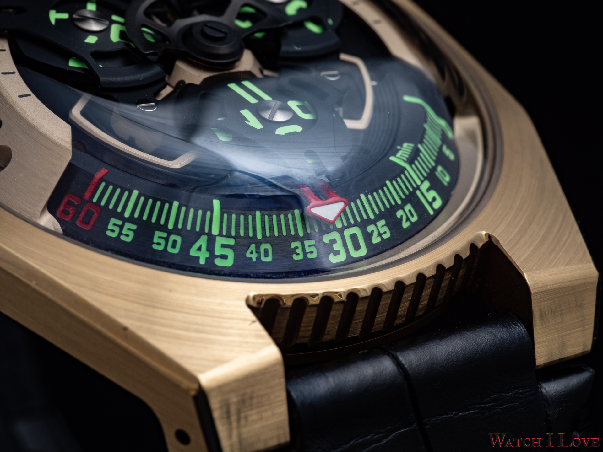 The time indication is a URWERK traditional style (as mentioned, traditional has in the case of URWERK a brand’s personal note) – a planetary revolving system that displays the hour on the rotating disk and the minutes in a curved track. The system is fairly easy to use, even for people from the digital time display, not used to the classic 12 hours round time arrangement. To note that all the indications are highlighted in the dark by a strong SuperLuminova, making the watch in the night a true UFO.