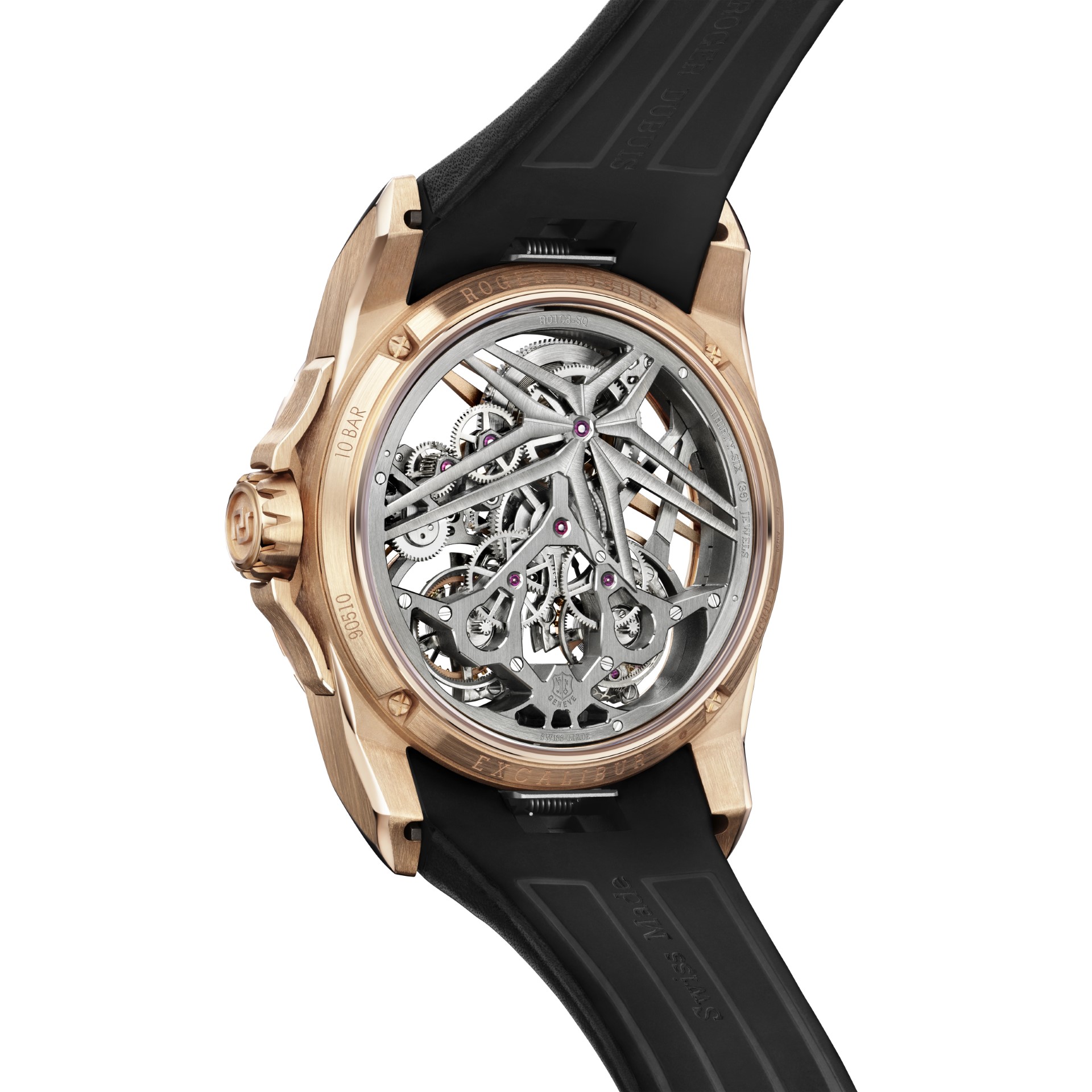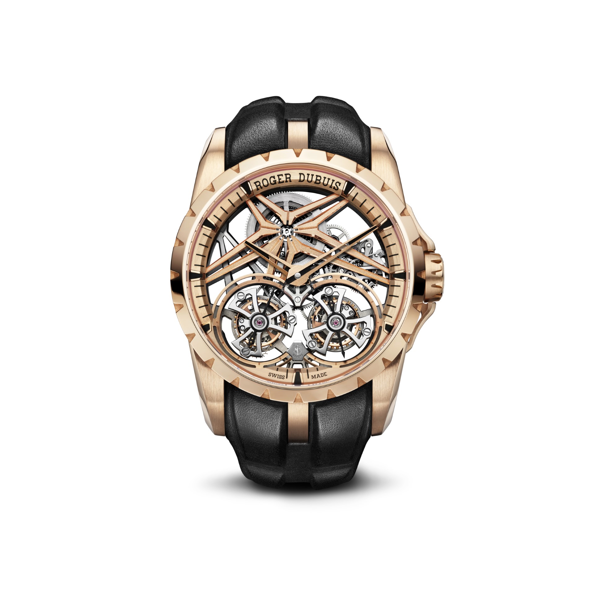 Roger Dubuis has consistently demonstrated its penchant for excess and extravagance. An inclination matched by a fearless determination to challenge the rules through a resolutely expressive and contemporary approach. This serial innovator mindset results from visionary engineers and incredible watchmakers combining radical expertise. It is nourished by a daily obsession for designing and creating the future of Haute Horlogerie. Serving aesthetics through technical skills, reinventing tradition by unleashing creativity to push all boundaries, Roger Dubuis proudly introduces the latest interpretation of its iconic Excalibur collection, reserved for an exclusive tribe – the Roger Dubuis Excalibur Double Flying Tourbillon.