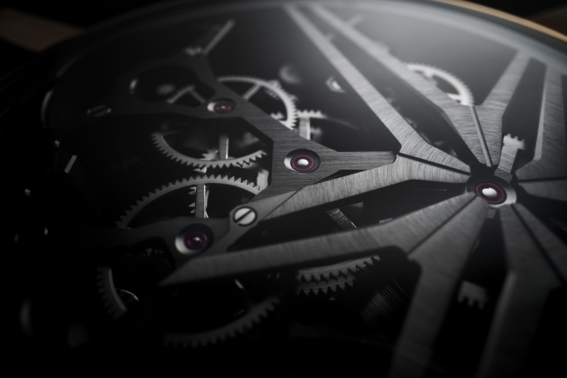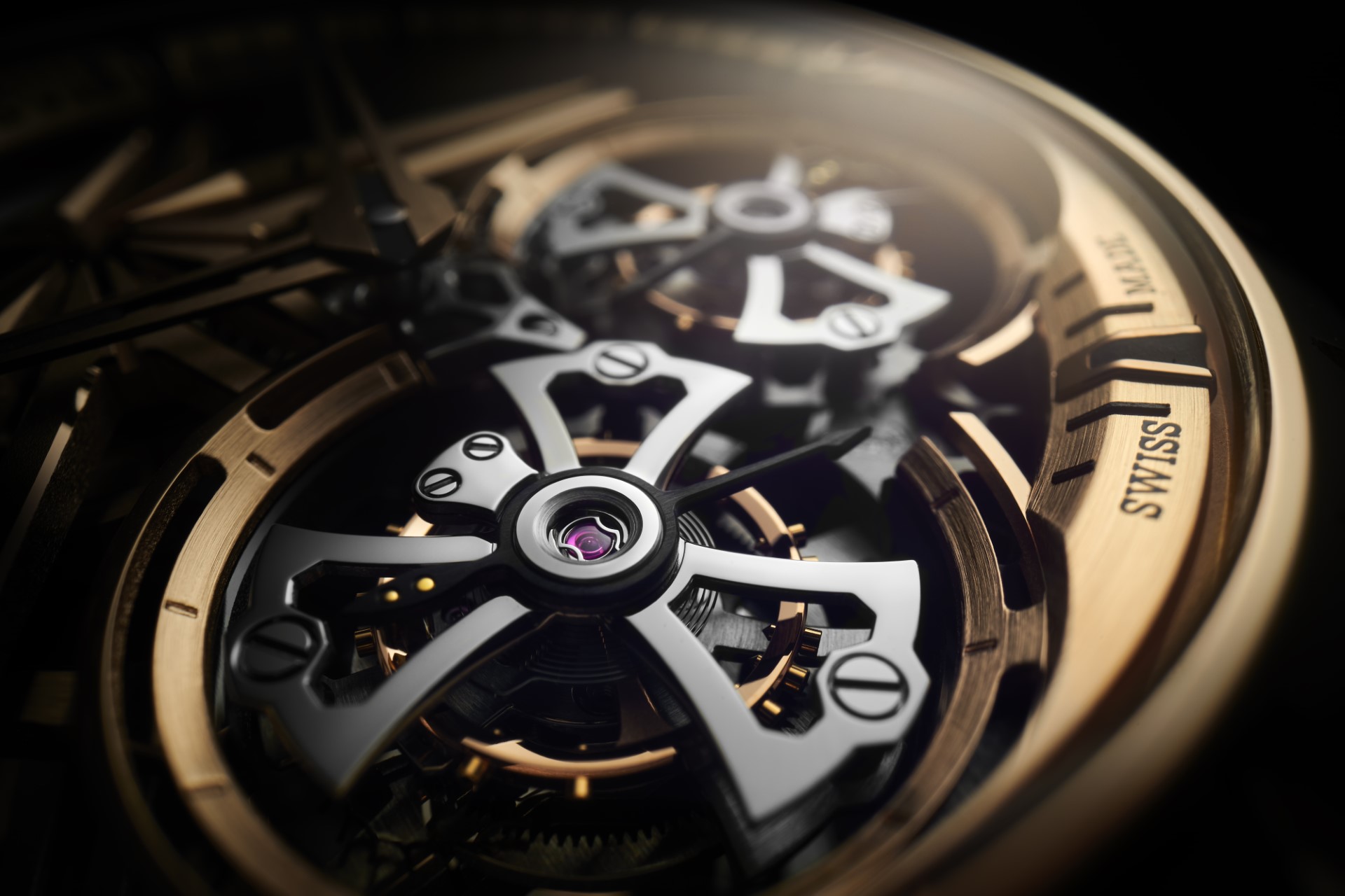 With the Excalibur Skeleton Double Flying Tourbillon, Roger Dubuis set itself the exciting challenge of changing perceptions. The skeleton structure concept has been pushed to its limit to provide a dynamic aesthetic. Clean-cut lines with polished angles create the impression of a thinner look and feel. This visual trick is implemented on every component, offering striking evidence of a modern interpretation. Entirely rebuilt in terms of volume, the movement inexorably heightens the sense of transparency and depth. The latter quality is boldly highlighted by the iconic Roger Dubuis star, released from its functional role within the movement base. Lodged between flange and plate, criss-crossing bridges placed on different levels, it now levitates freely above the barrel, to stunning effect. This dynamic aesthetic is amplified by the Hallmark of Geneva decorations, each carefully chosen to serve the movement’s aesthetic and technical aspects.