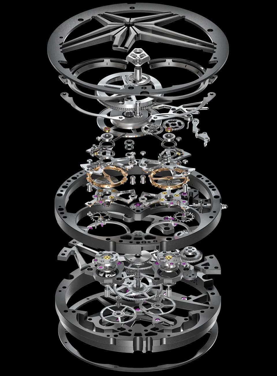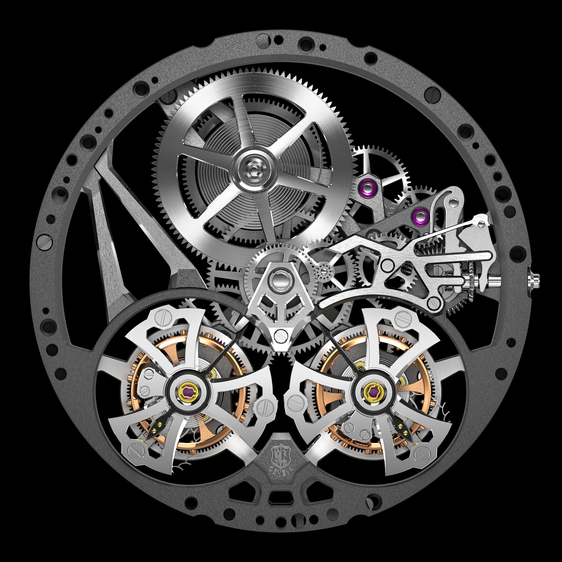 - Functions: Hours, Minutes, double flying tourbillon at 5 and 7 o’clock