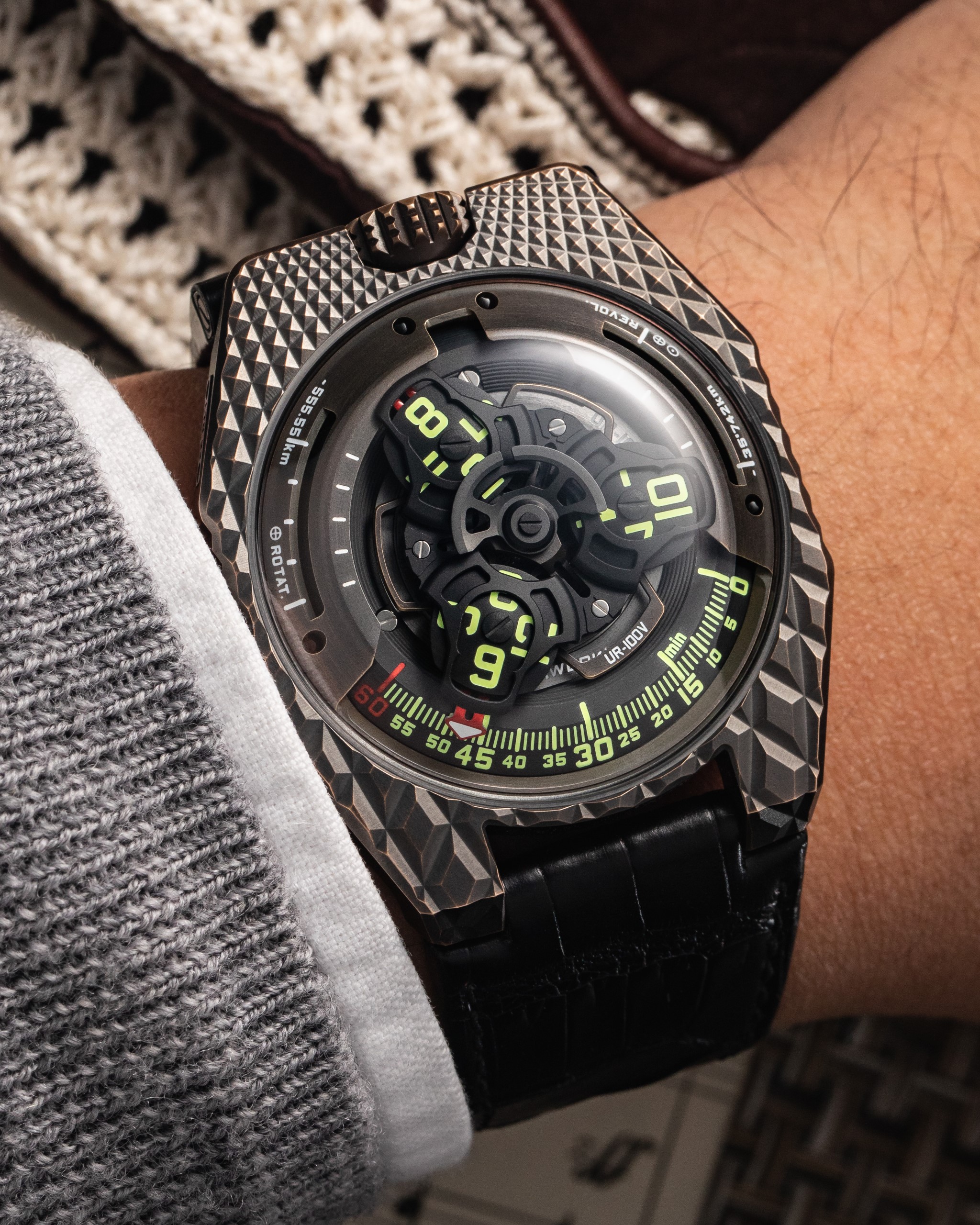 T-Rex is the name given to the latest iteration of Urwerk’s UR-100 collection. It carries both Urwerk’s genome in its satellite hours and that of its namesake in the primal texture of its reinforced hide of bronze. The UR-100V T-Rex is decidedly a creature you’ll want to tame.