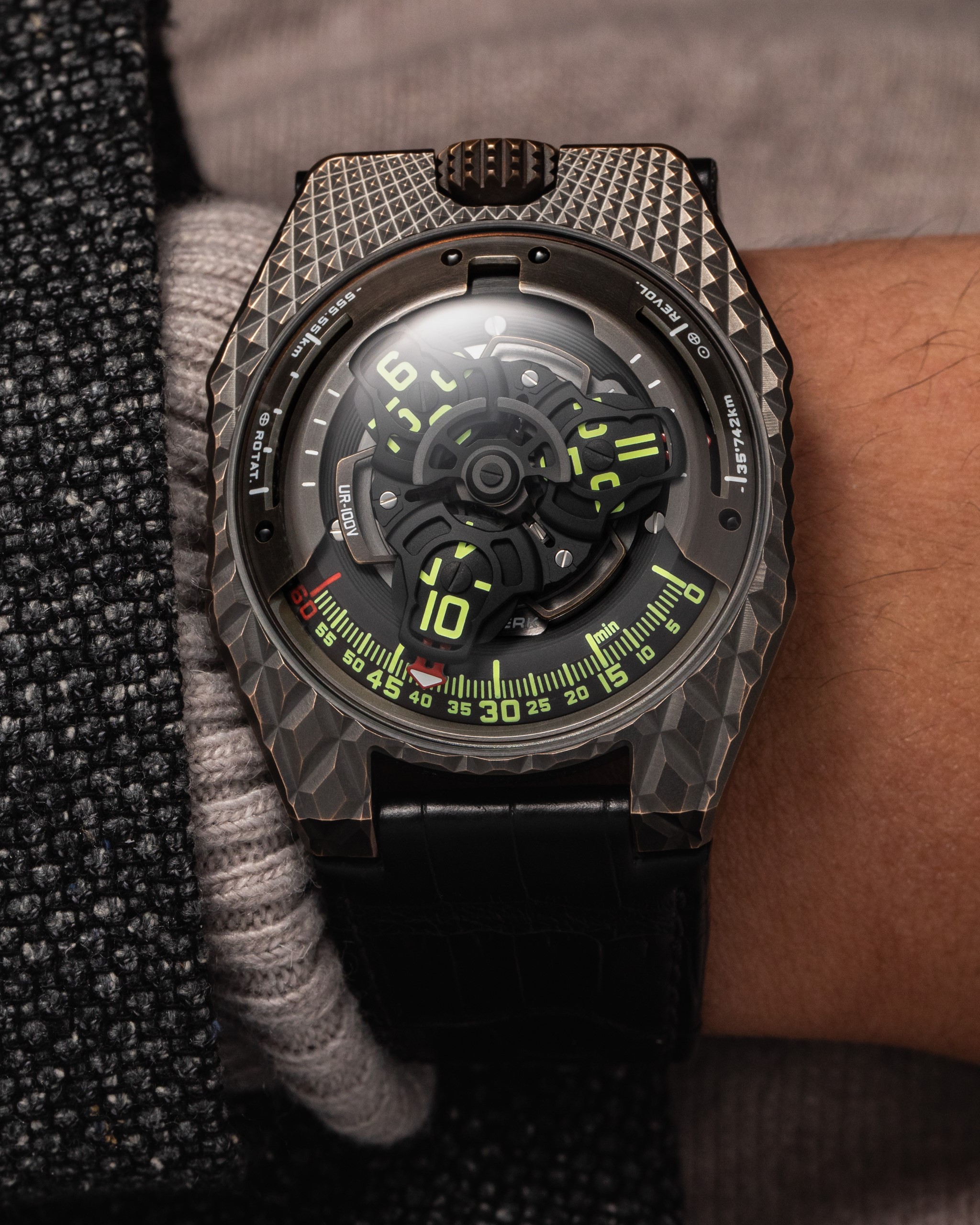 Finally, the UR-100V T-Rex has a feature that puts other watches into the dinosaur age. Once the red pointer of the satellite hours has completed its 60-minute journey, it reappears to show the distance travelled by our planet.