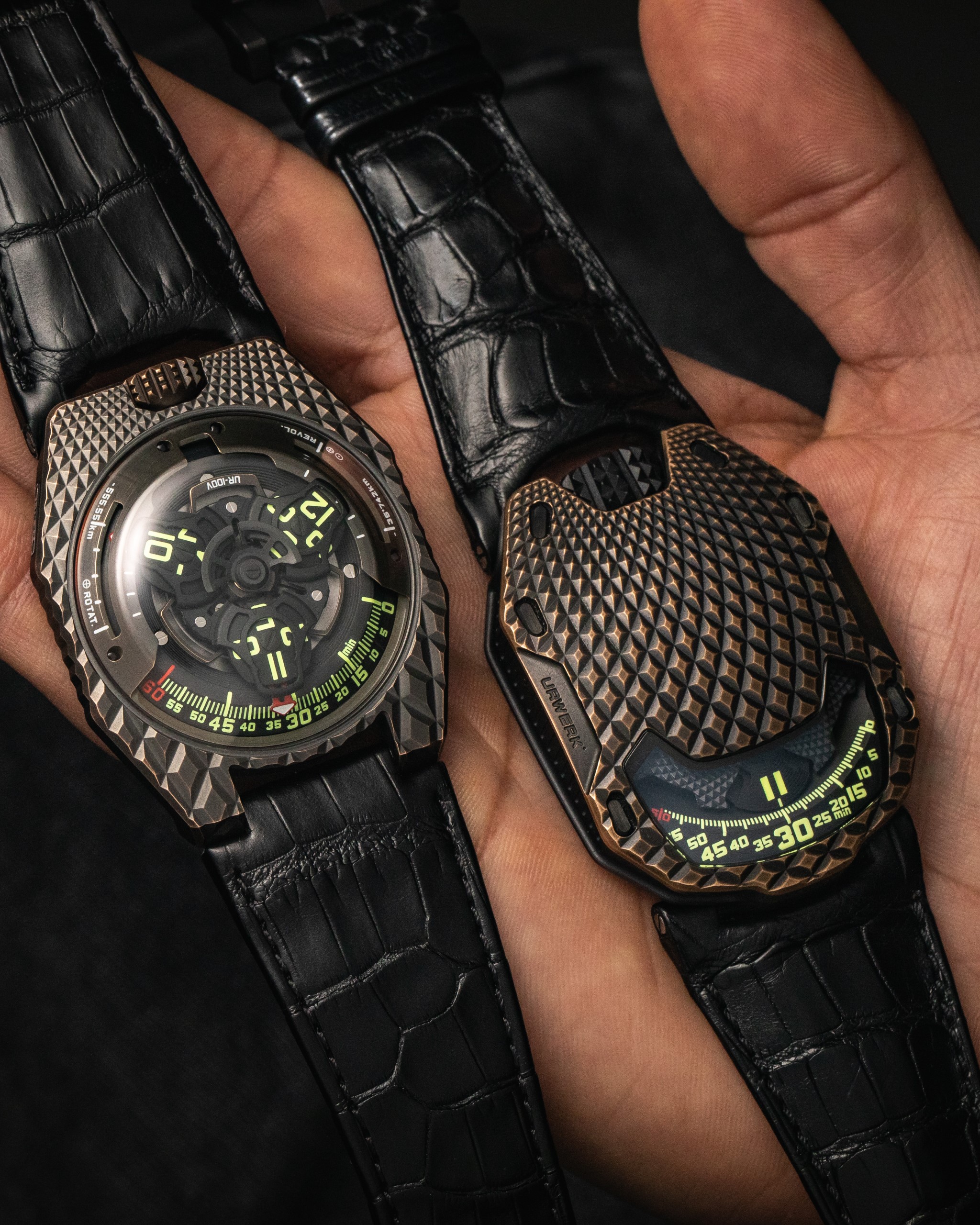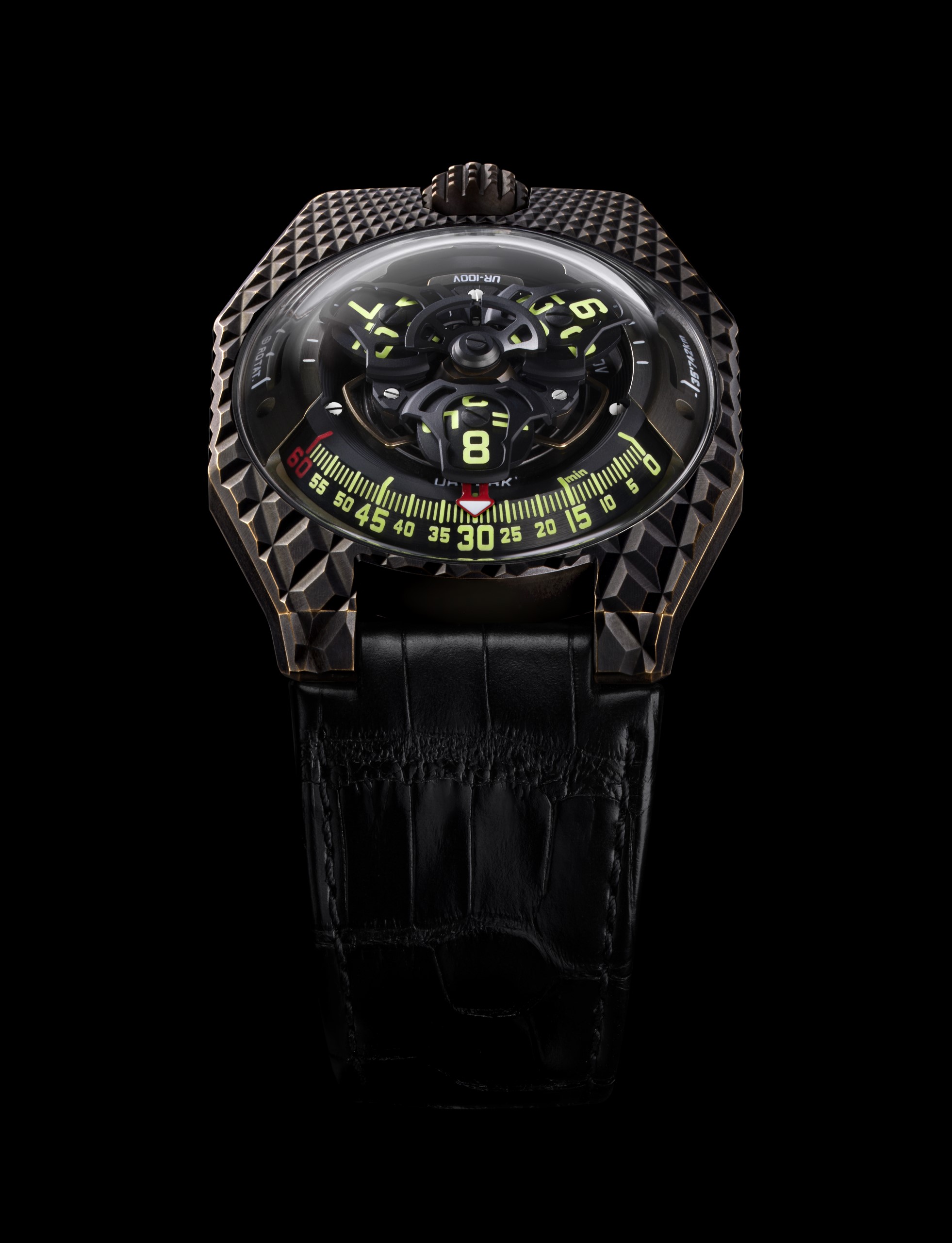 Its case is in solid bronze that has undergone three successive treatments. The first lies in the unusual composition of the alloy which results in a delicate patina. The bronze is then in the hands of a computer-controlled milling station that carves the pattern of scales on the top and sides of the case. The final processes, sand-blasting and Urwerk’s proprietary method of biochemical burnishing, give the watch its distinctive colour.