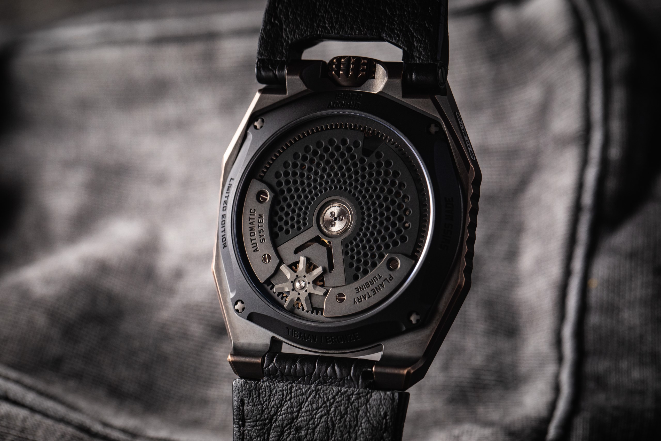 - Materials: Engraved caseband in bronze, caseback in black PVD-coated titanium.