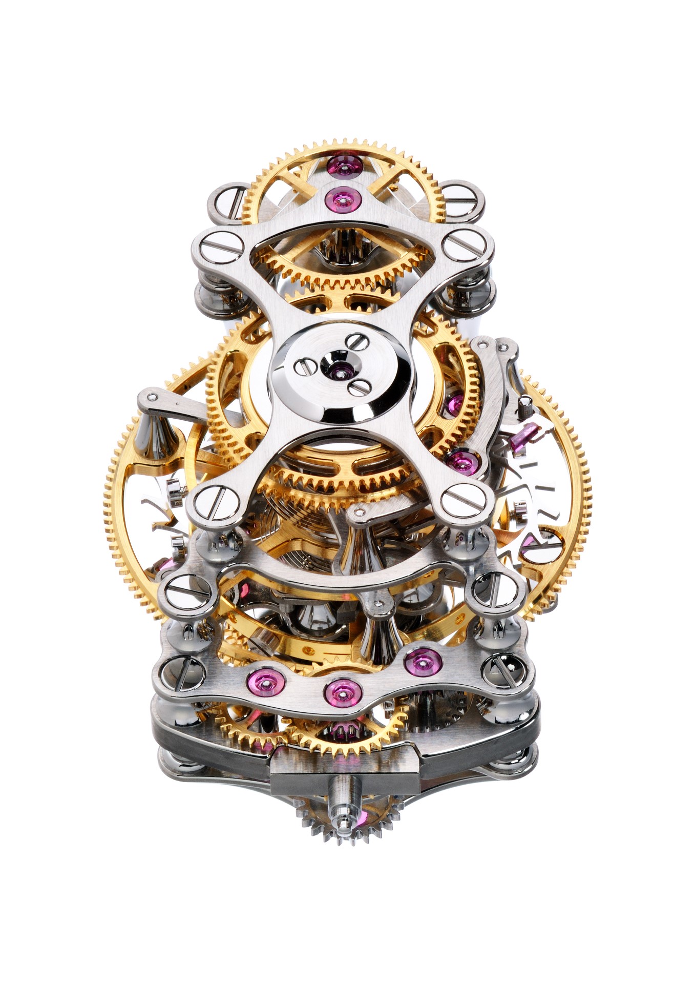 Thanks to the three axis rotation, every detail on the structure is visible. The complexity of the mechanism is highlighted by a unique and light architectural construction. The 42 polished curved pillars that hold the bridges are a testimony to Achille Benoît’s beautiful 1939 marine chronometer. Every part of the mechanism is traditionally decorated and refined by hand for a breathtaking effect. Despite the apparent complexity, the technological architecture was kept at the most simple and efficient. Nothing is superfluous.