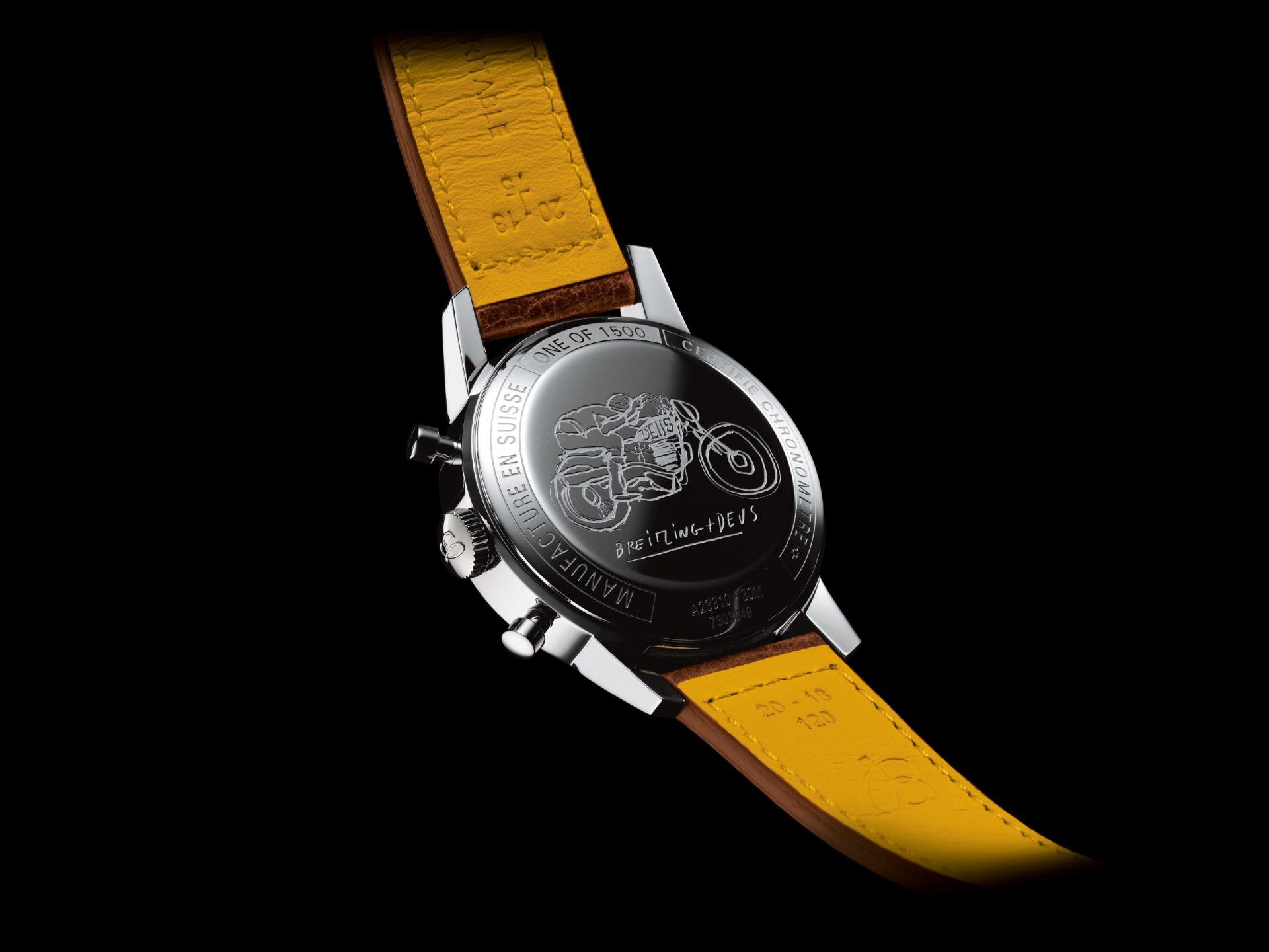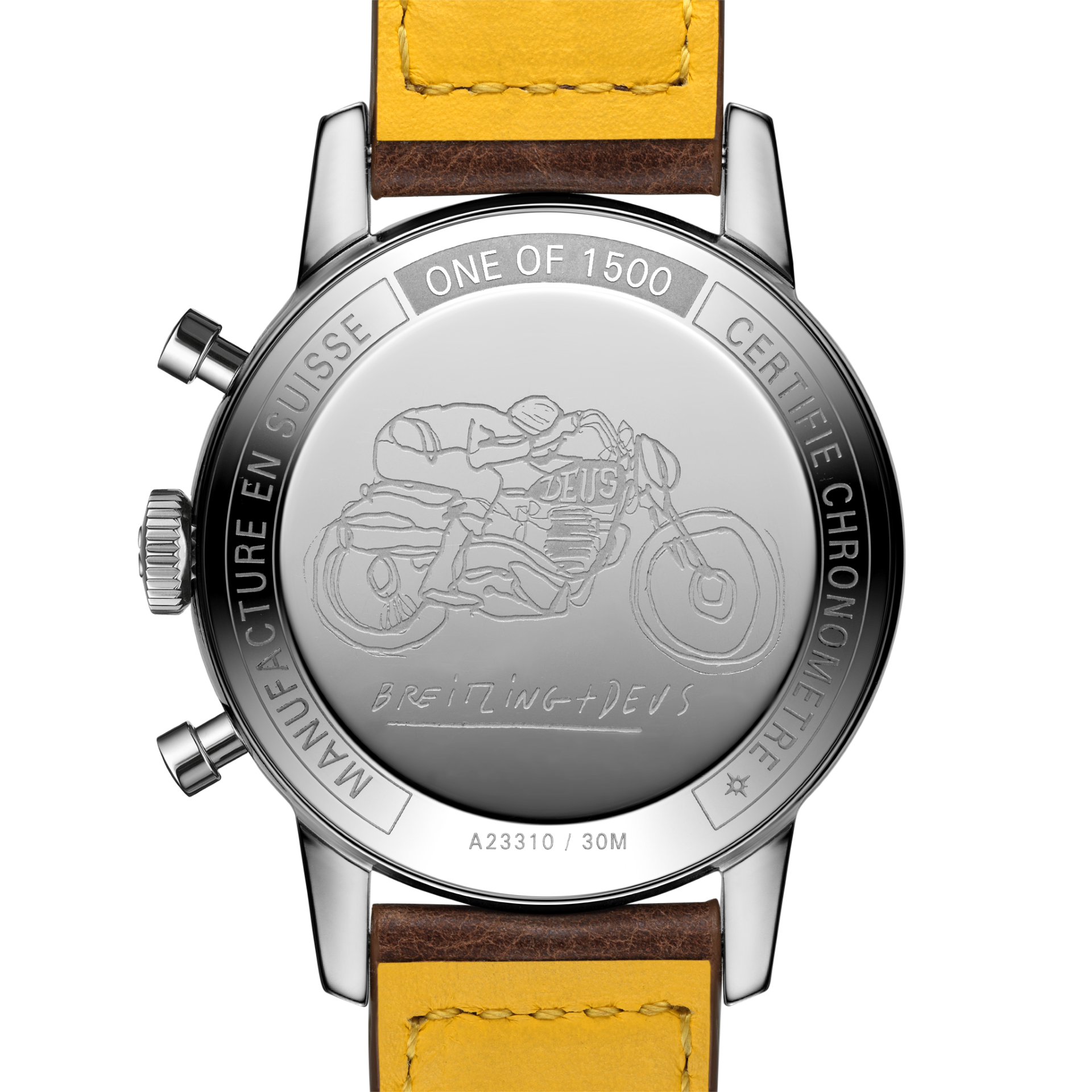 Bold yet classy, this new version sports a racing-themed calfskin leather strap. Its silver dial displays yellow and orange details, squircle-shaped chronograph counters, and the Deus logo and its adage “In benzin veritas” – offset in white on its black tachymeter scale. The back of its 41-millimetre stainless-steel case features the iconic Deus artwork of a retro-looking motorcyclist in full flight designed by Deus creative director Carby Tuckwell. It is powered by the Breitling Caliber 23, a COSC- certified chronometer with a power reserve of approximately 48 hours.