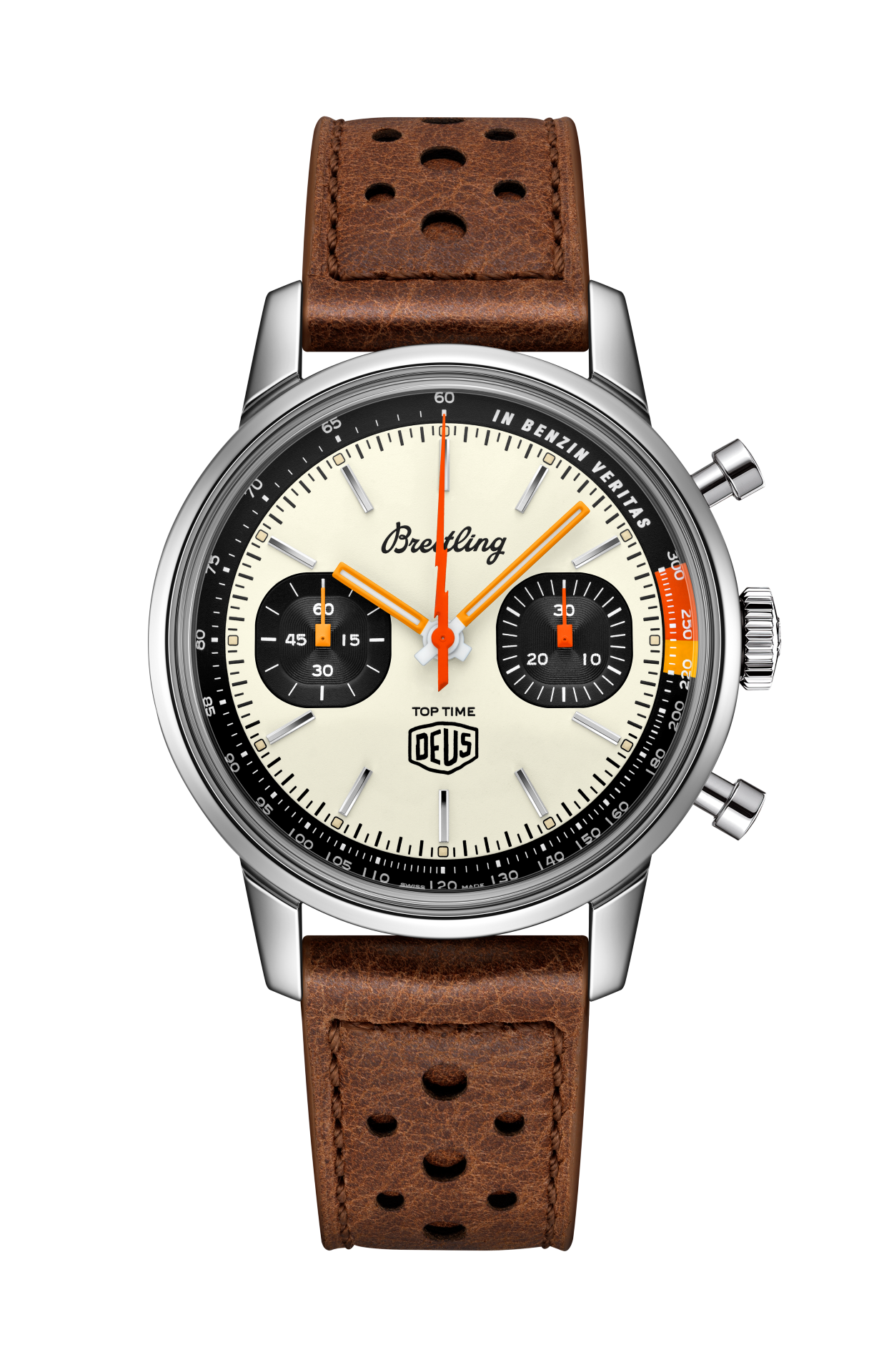 Co-designed with Deus Ex Machina, the Top Time Deus chronograph is a nod to Breitling’s original 1960s edition and a true tribute to the nomad spirit. The first Top Time had a clear mission – suiting the needs of “young and active professionals” with a range of “ultra-modern” chronographs. The retro vibe of today’s edition has an enduring appeal. It’s not about keeping time, but rather expanding it whenever adventure beckons.