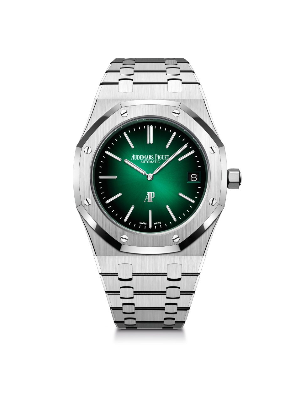 The 39mm “Jumbo” is presented with a full 950 platinum case and bracelet as well as a smoked green dial adorned with a sunburst pattern. This is the first time that this configuration has been employed within the 15202 collection. Just 8.1 mm in thickness, the case also confers a slender appearance.