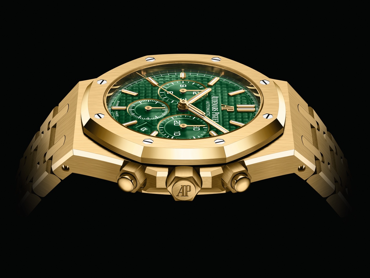 The Royal Oak Selfwinding Chronograph is offered in a new colourway, pairing an 18-carat yellow gold case with a green dial. The dial is adorned with a “Grande Tapisserie” pattern complemented with three snailed counters. The “Audemars Piguet” name on the dial is formed of 24-carat gold and realised using galvanic growth. The model is fitted with a solid caseback engraved with “Limited Edition” (125 pieces).