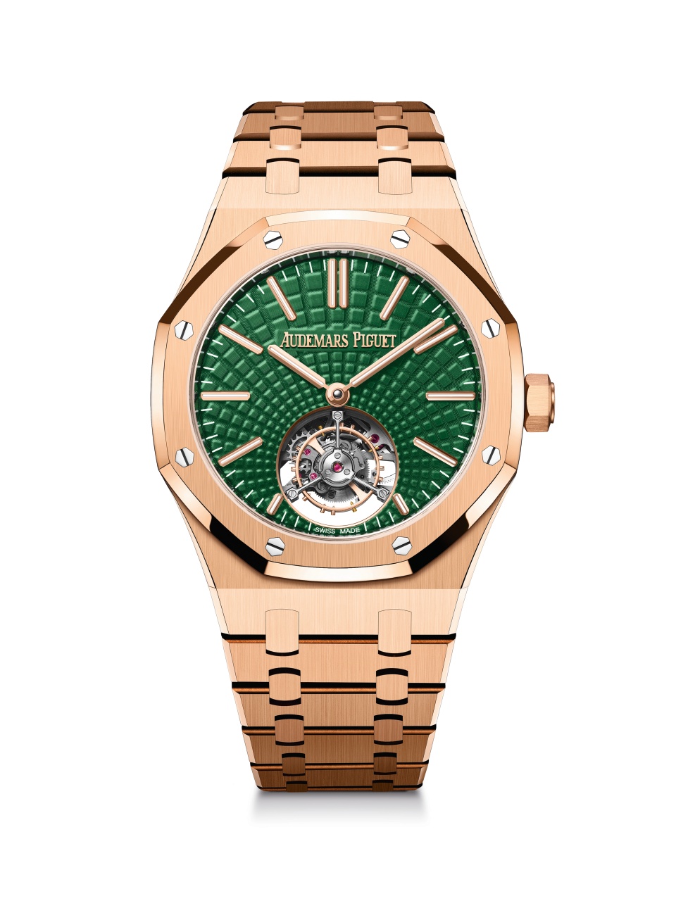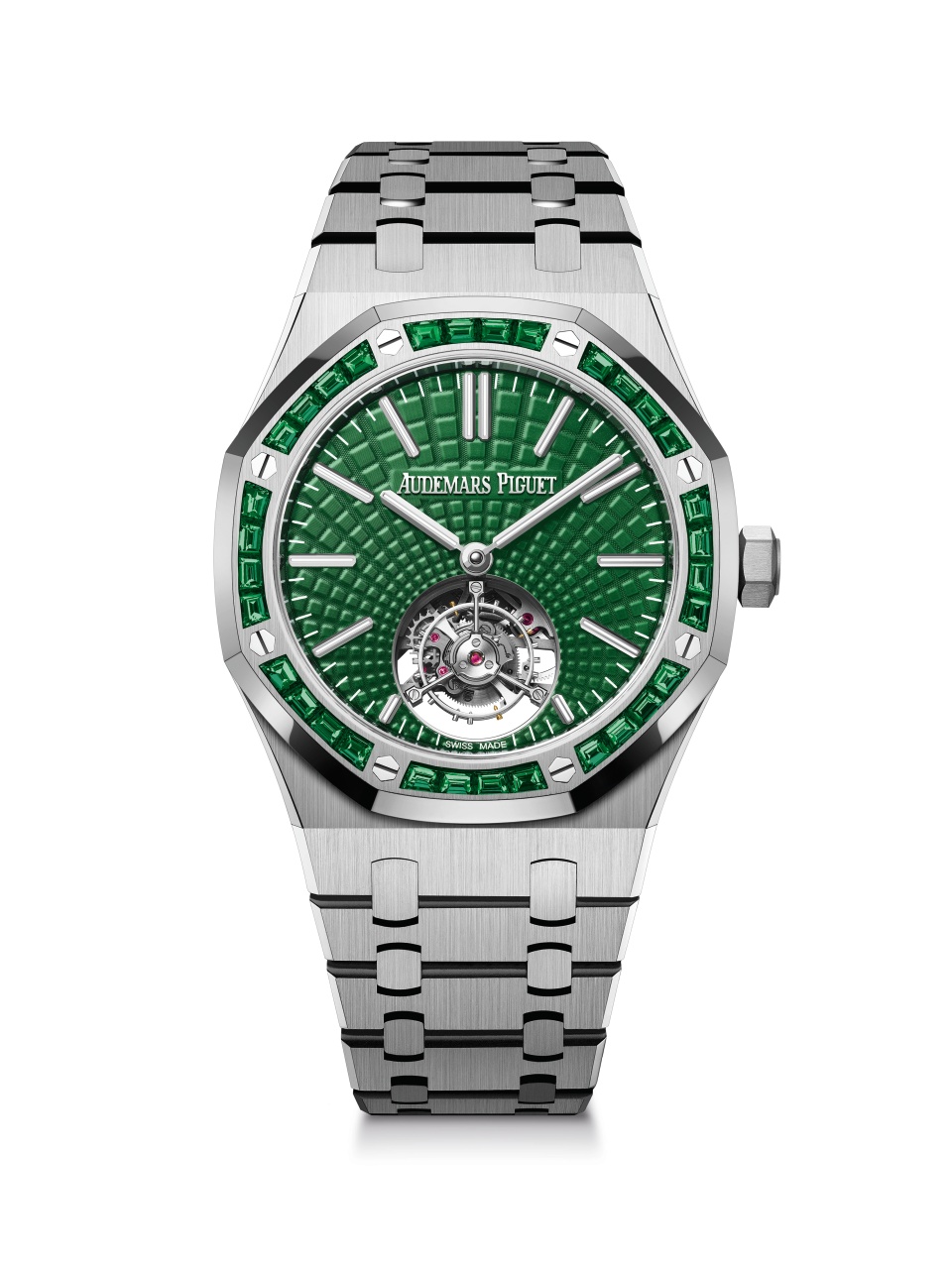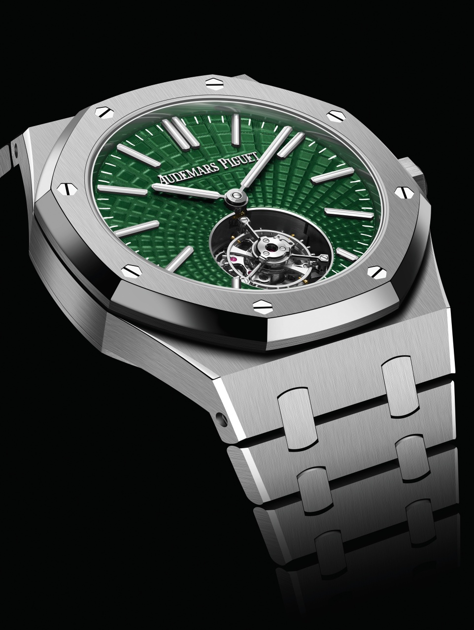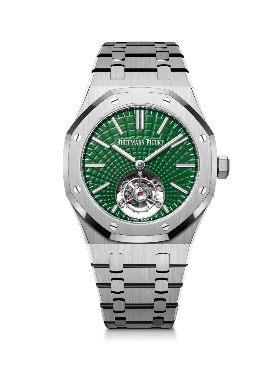 Swiss Haute Horlogerie manufacturer, Audemars Piguet, is pleased to unveil several new Royal Oak models enriched with green dials. The new offerings include a 950 platinum Royal Oak “Jumbo” Extra-Thin with a smoked green dial embellished with a sunburst pattern, as well as a limited-edition Royal Oak Selfwinding Chronograph with an 18-carat yellow gold case and a green “Grande Tapisserie” dial. Lastly, the Manufacture also presents three new Selfwinding Flying Tourbillon variants in pink gold or titanium, all of which incorporate green hues.