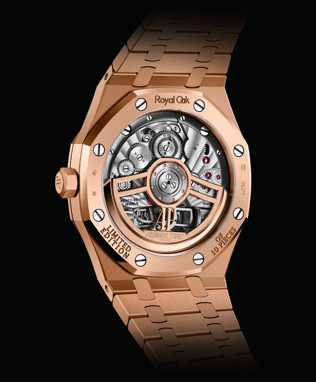 - pink gold applied hour-markers and Royal Oak hands with luminescent coating.