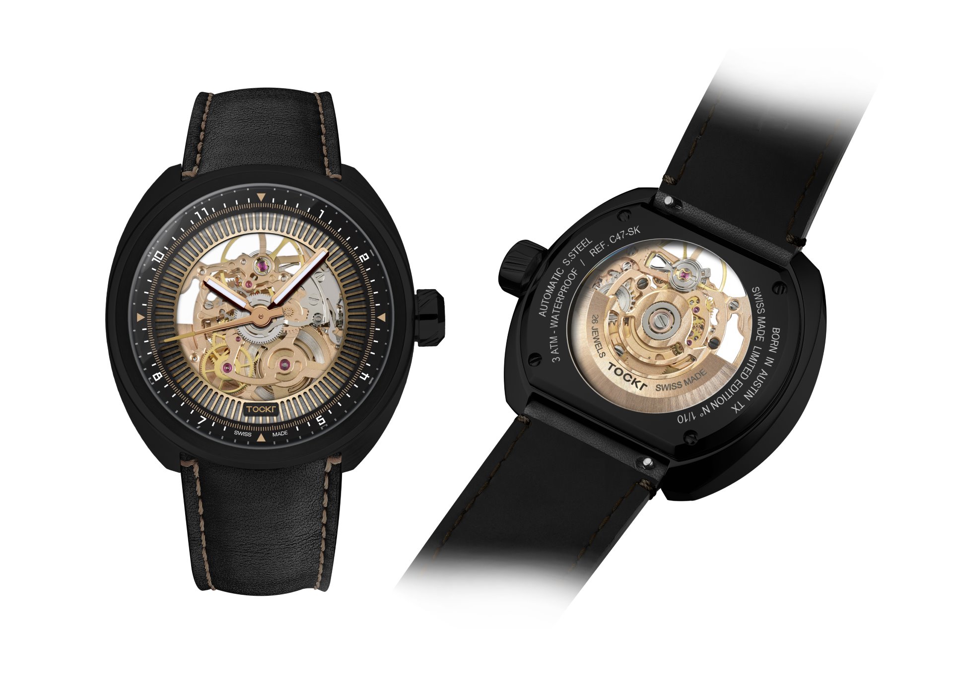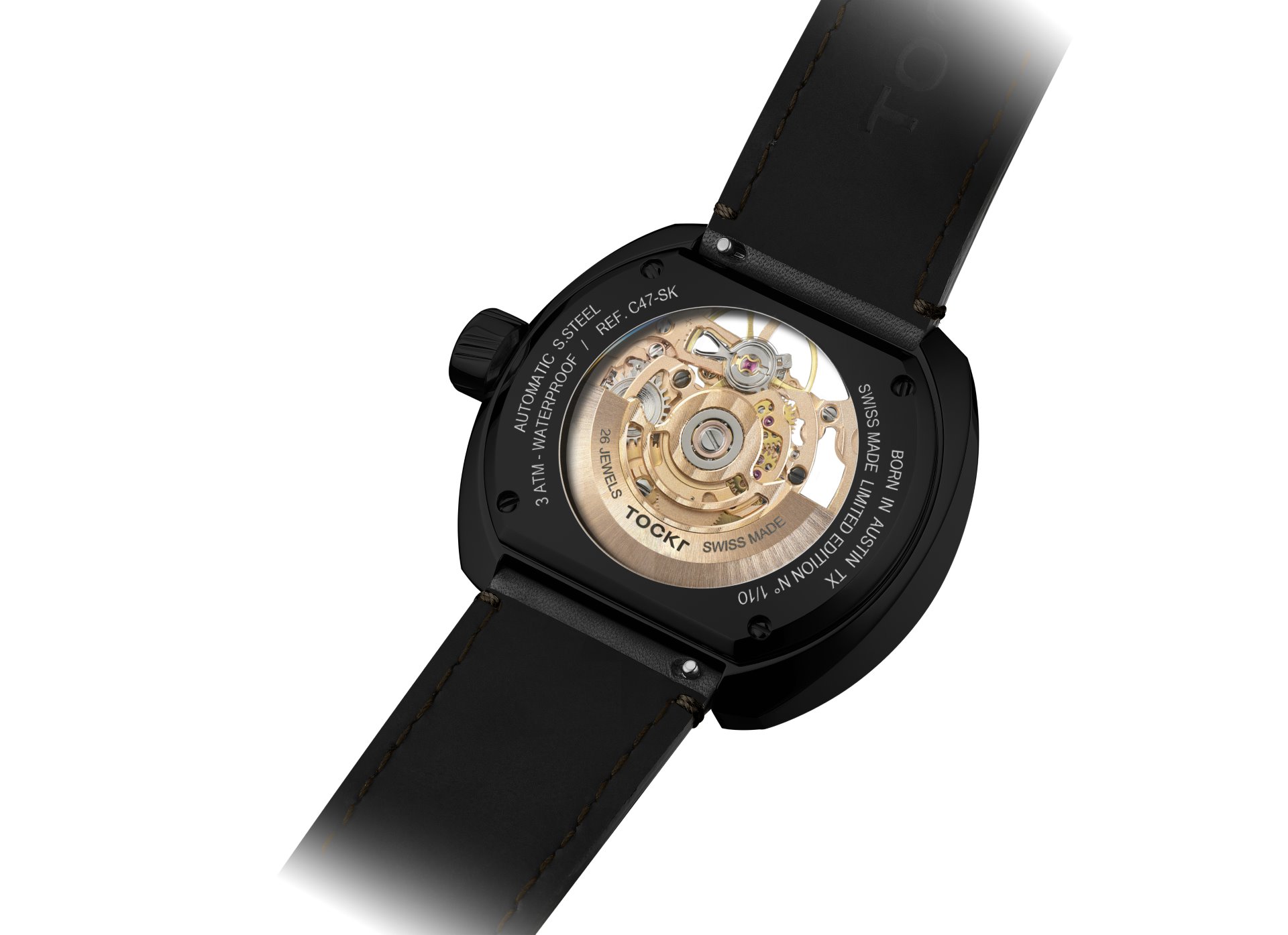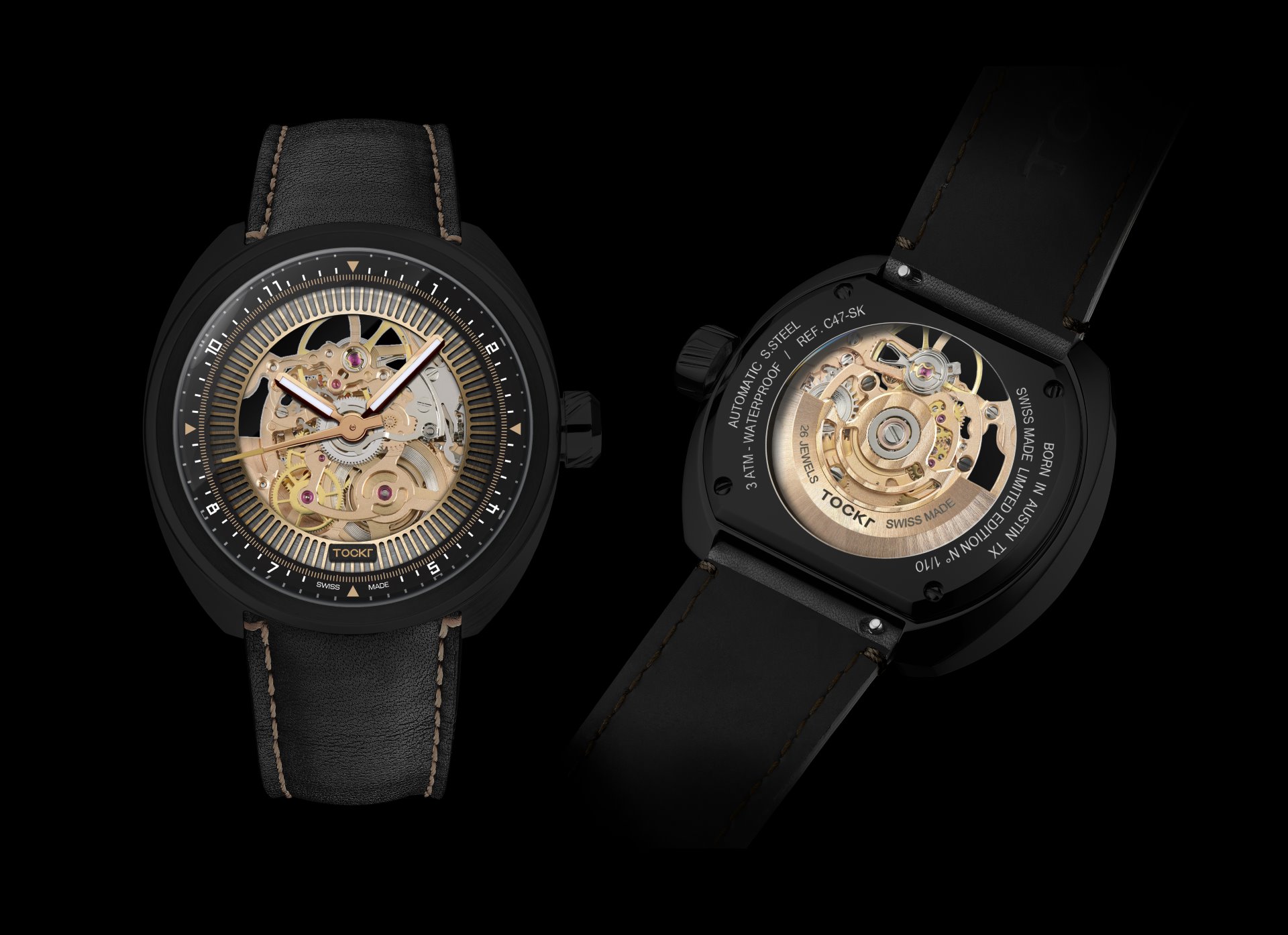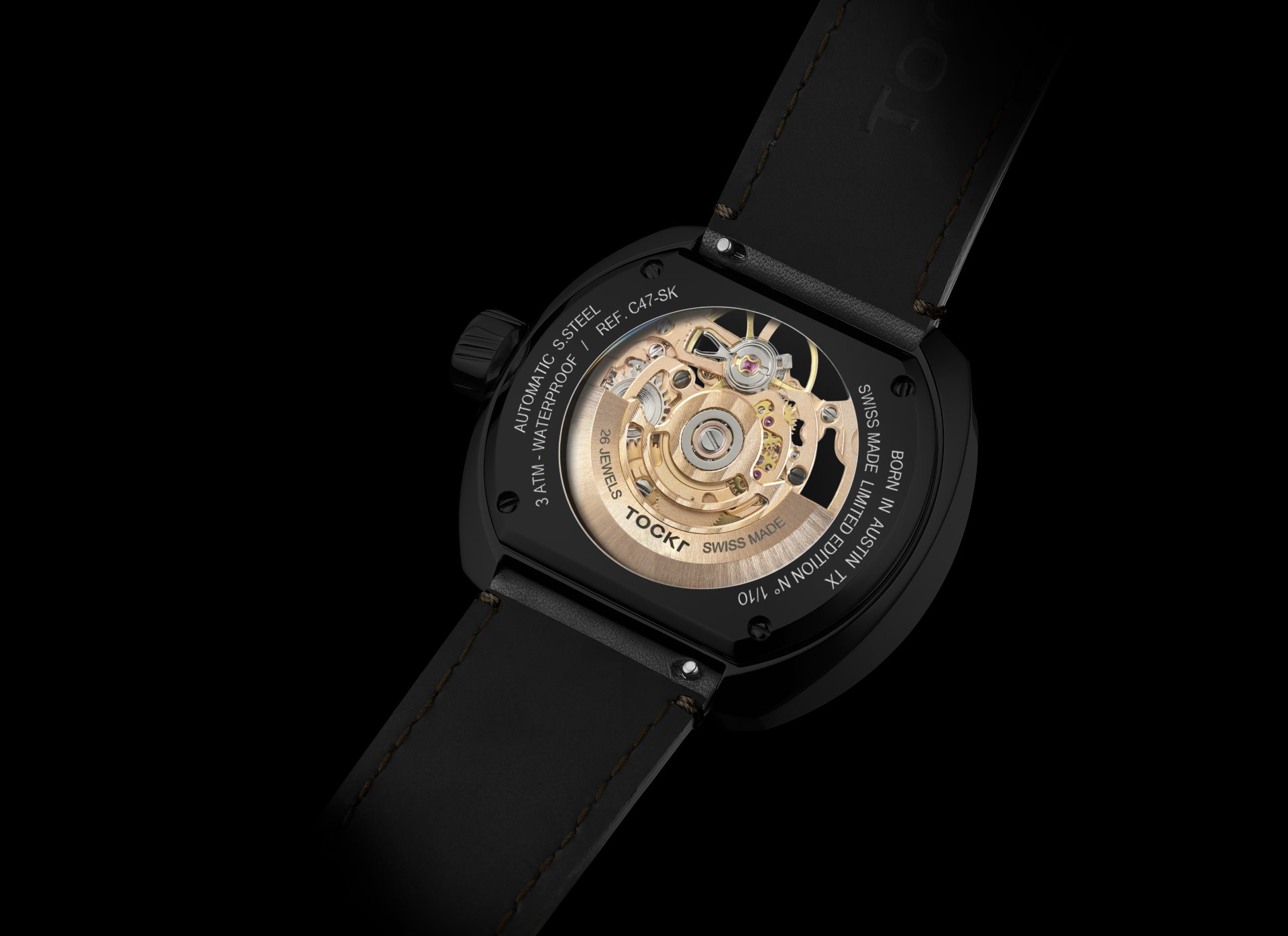 Dark Spirit feels appropriate for Tockr, a dark horse indie brand that has been fully self-funded from the start and has quietly won over watch purists, retailers, and the fashion world alike in only a few short years. Total independence for Tockr means unbridled creative freedom to produce provocative new designs like the C-47 Skeleton Dark Spirit, and in the process, to deliver sophistication and attainability without compromising quality. The brand’s conceptual dexterity, technical competence, and longstanding links to the world of aviation are on full display with this limited edition.