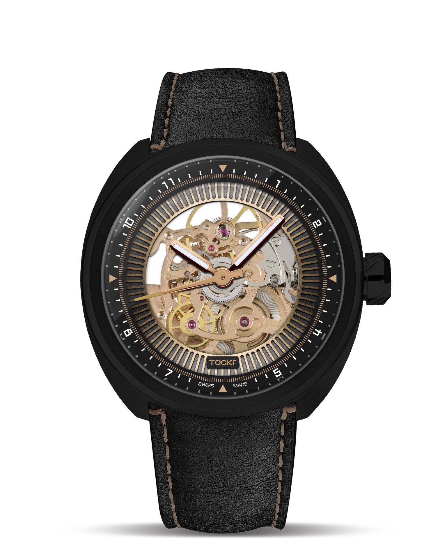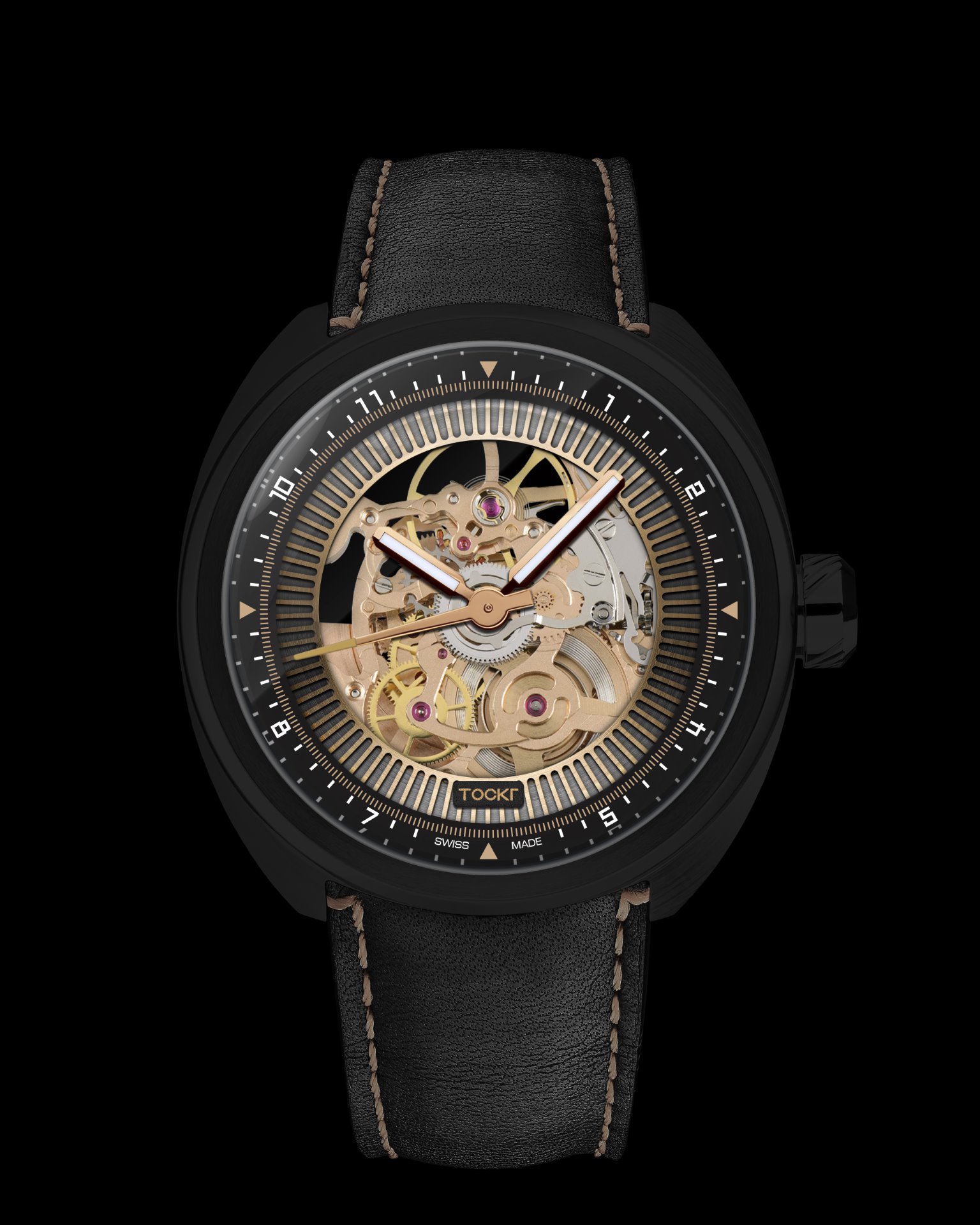 More than an engaging design object, this skeletonized timepiece is ready for action, with water-resistance up to 3 ATM and a hearty 44-hour power reserve. Dark Spirit comes delivered with two strap options that complete its dark persona, including a black calfskin strap and an extra black silicone band. Both straps feature a black PVD coated stainless steel 316L pin buckle engraved with the Tockr logo.