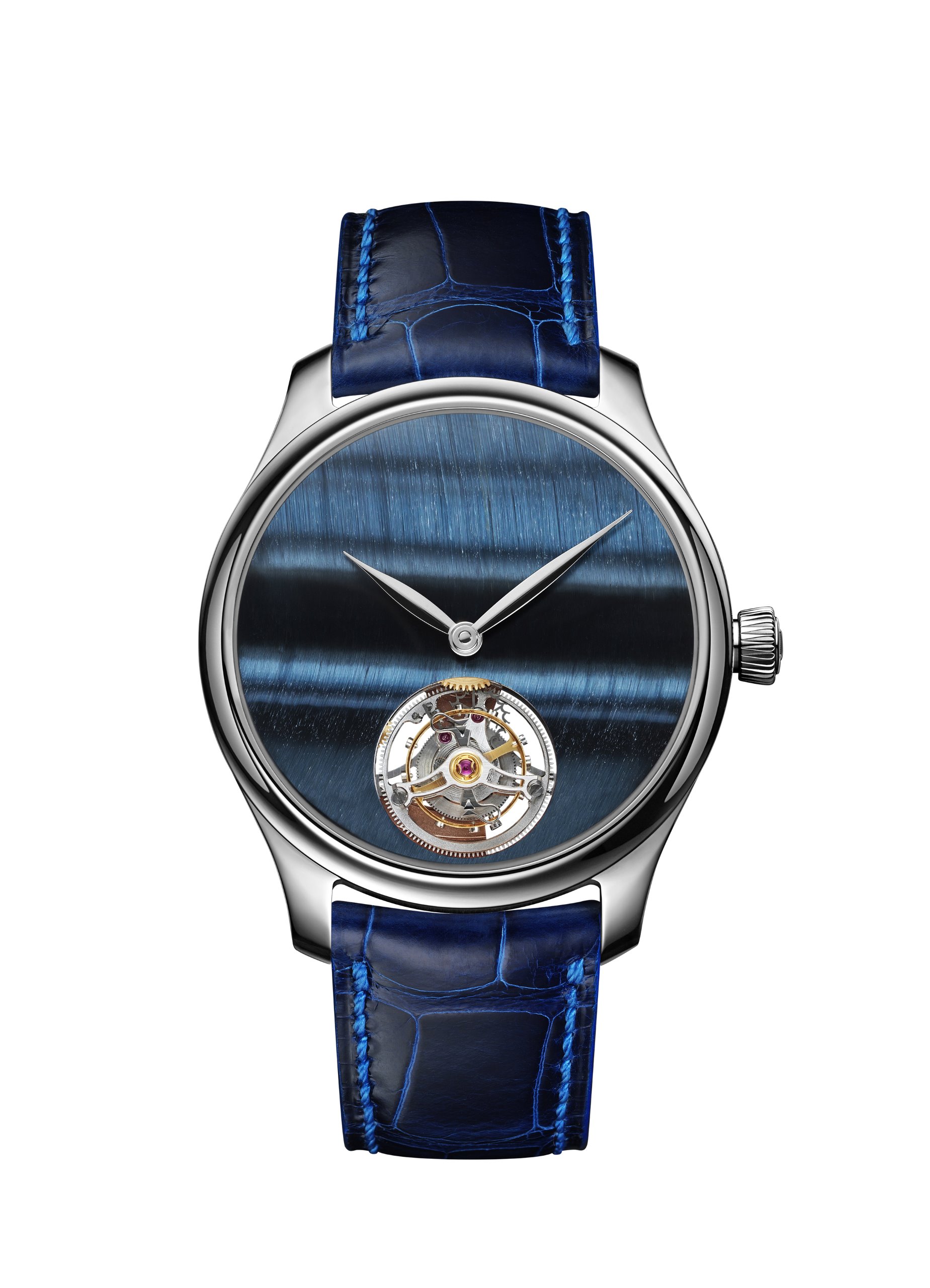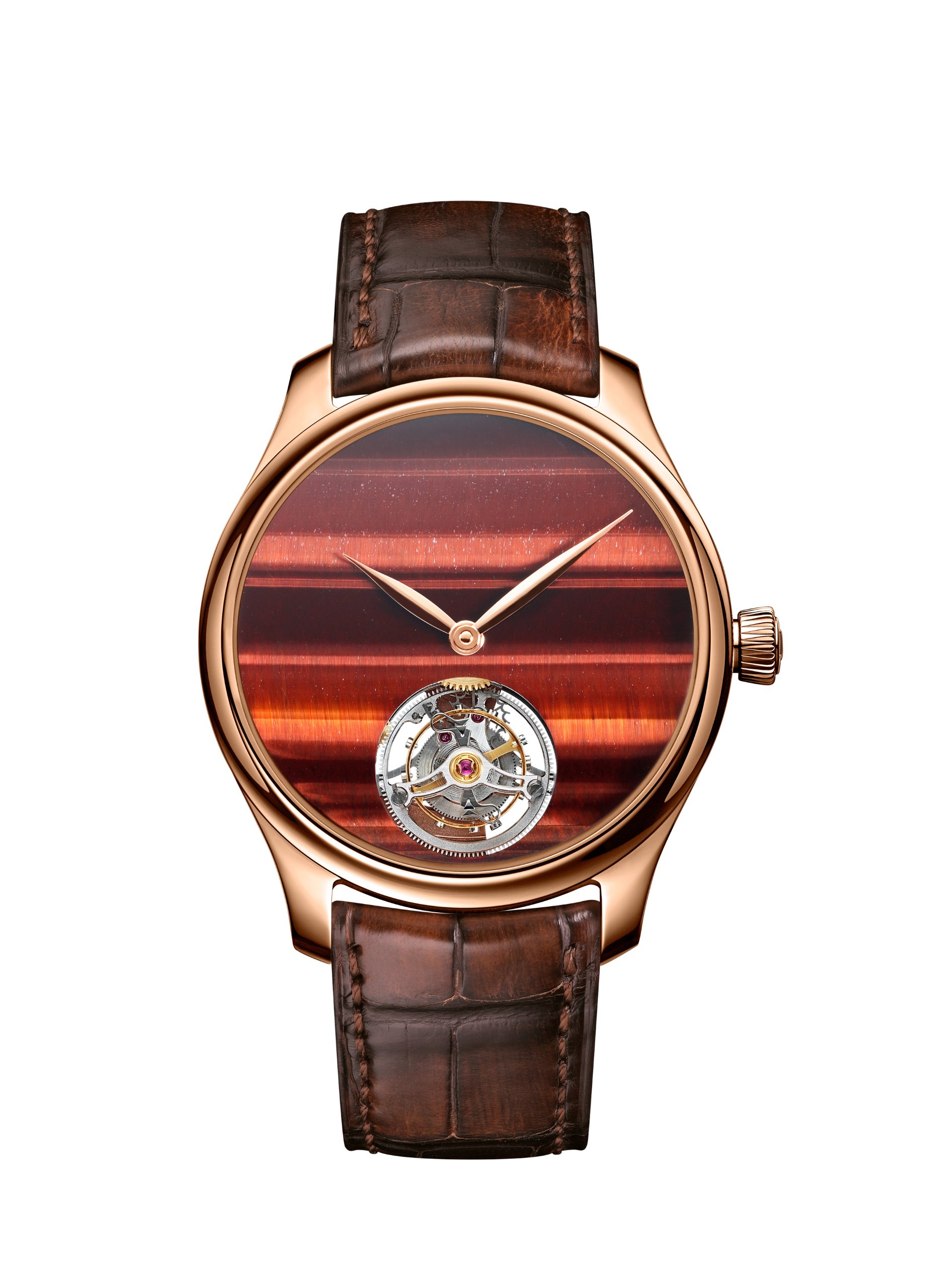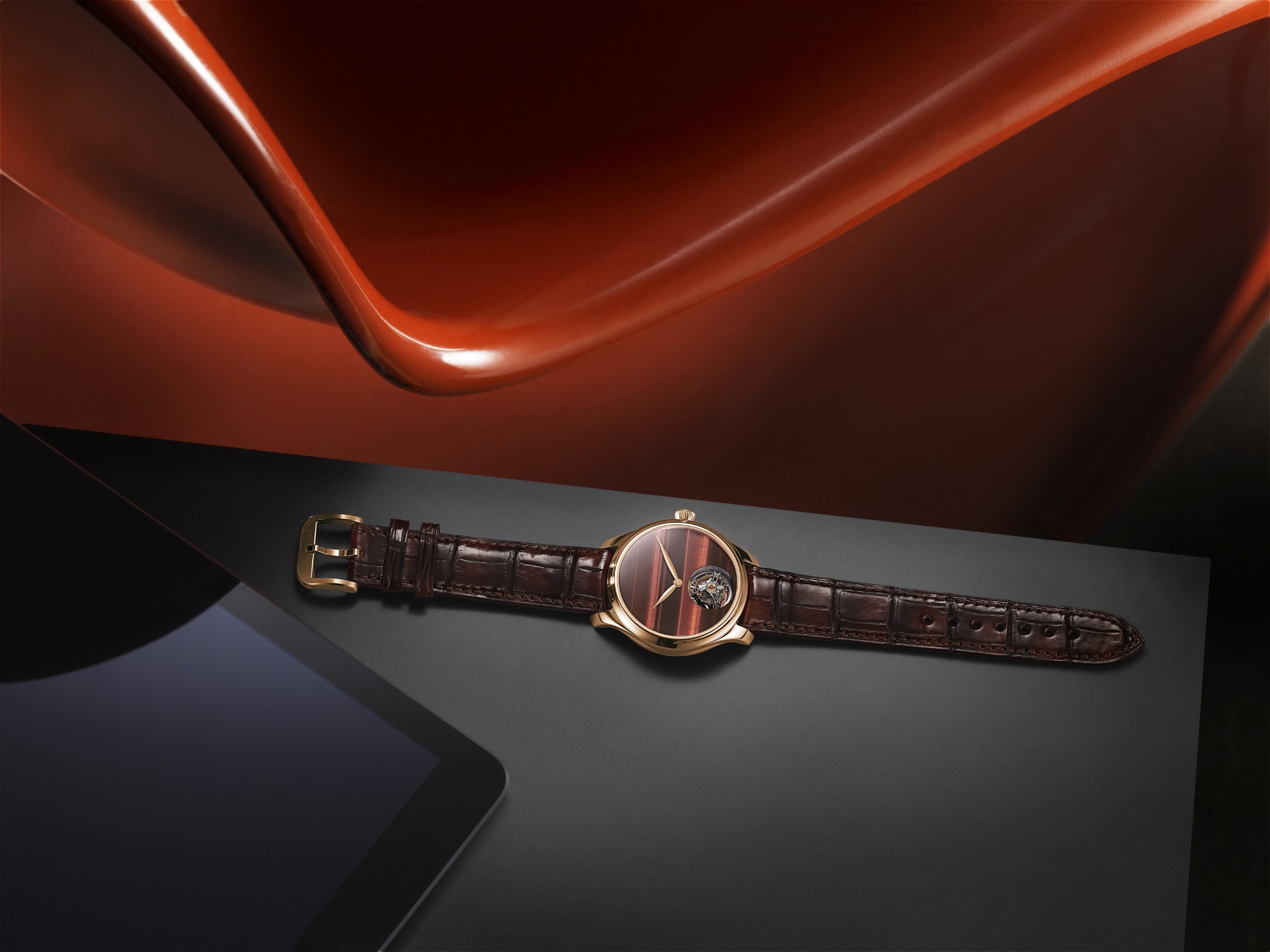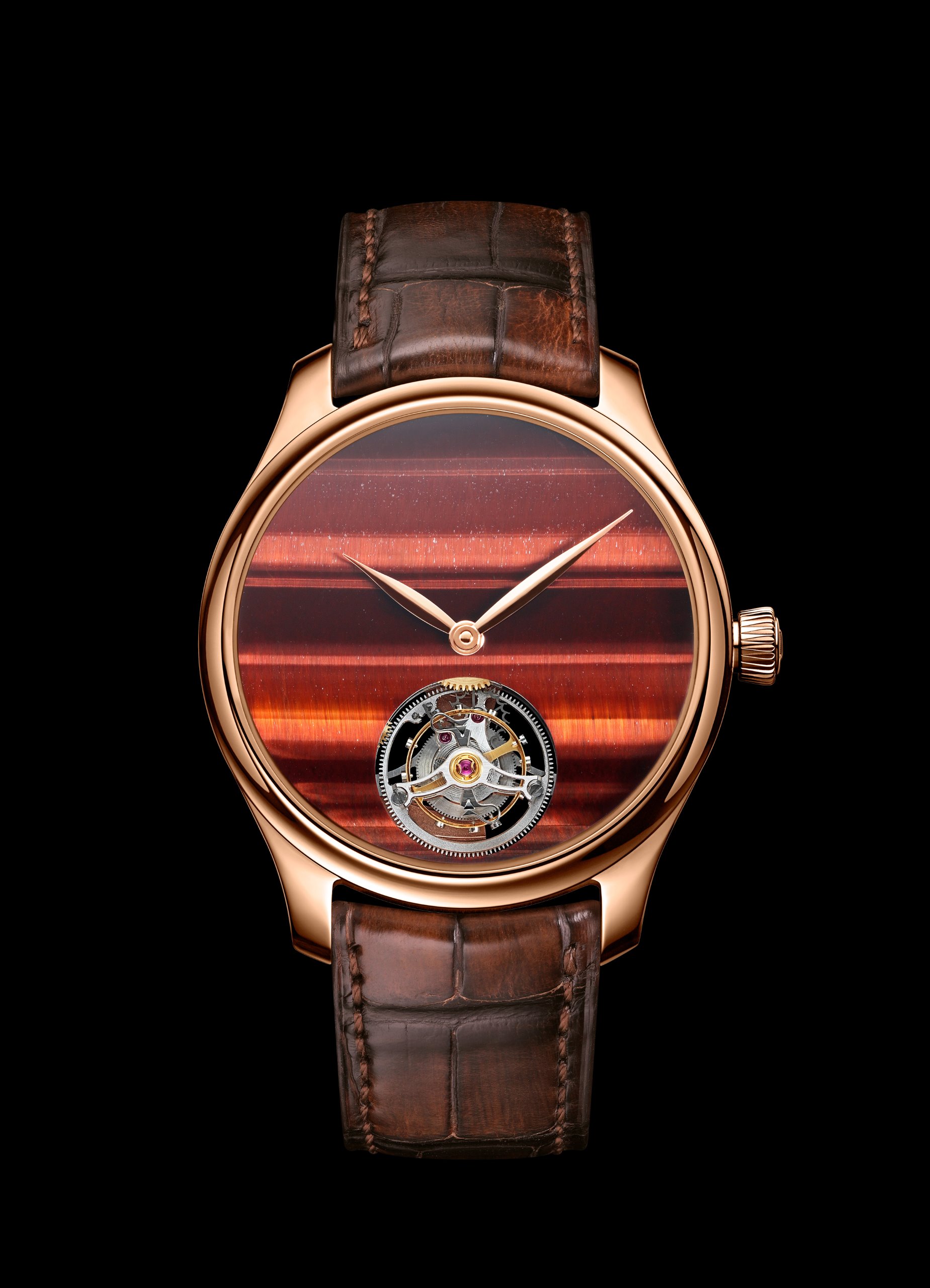 A fascinating solar mineral, Tiger’s Eye is believed to confer protection, and is a symbol of self-confidence and a guarantee of good health and prosperity. Countless esoteric properties have been attributed to it. Soldiers from the Roman Empire used to wear it around their necks to protect themselves in battle. In the dark times of the Middle Ages, it was thought to ward off evil. Beyond this symbolism, it is the aesthetic properties of the stone which attracted the attention of H. Moser & Cie., as CEO Edouard Meylan explains: “Tiger’s Eye is a natural reinterpretation of Moser fumé dials, which have been a key part of the brand’s success. Its horizontal lines lend it balance and symmetry. It is a dynamic stone which seems to come to life as it catches the light. The richness of its details are revealed gradually; it must be admired from different angles to fully appreciate its beauty. Just like a Moser timepiece. With the Endeavour Tourbillon Concept Tiger’s Eye model, we wanted to enhance the brilliance of the Tiger’s Eye using a highly contemporary approach. The 1970s has been a great source of inspiration for us in terms of design and aesthetic trends. Tiger’s Eye was very popular at this time, and it was showcased in a number of timepieces, with a look that was quite Baroque or Rococo in style. We have opted for a contrasting interpretation, minimalist and understated, with a Tiger’s Eye dial featuring no logo or indices, adorned with only the flying tourbillon at 6 o’clock“.