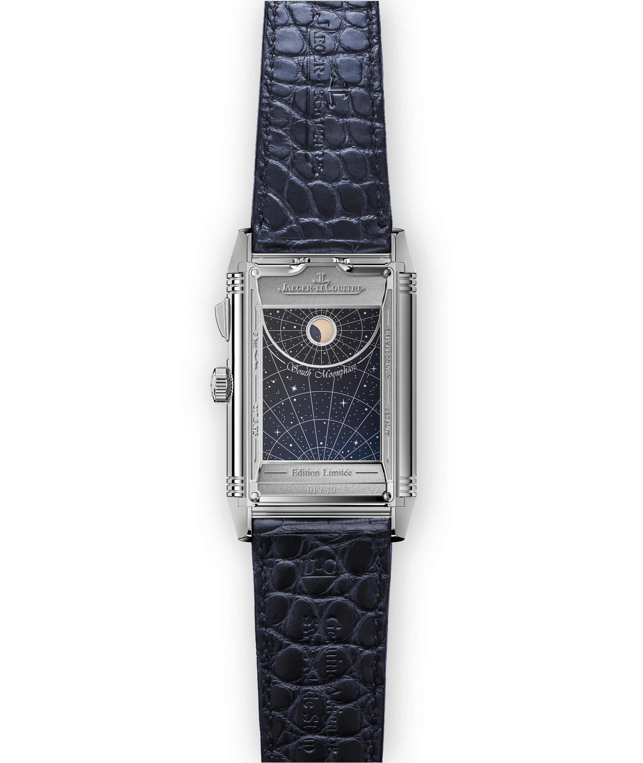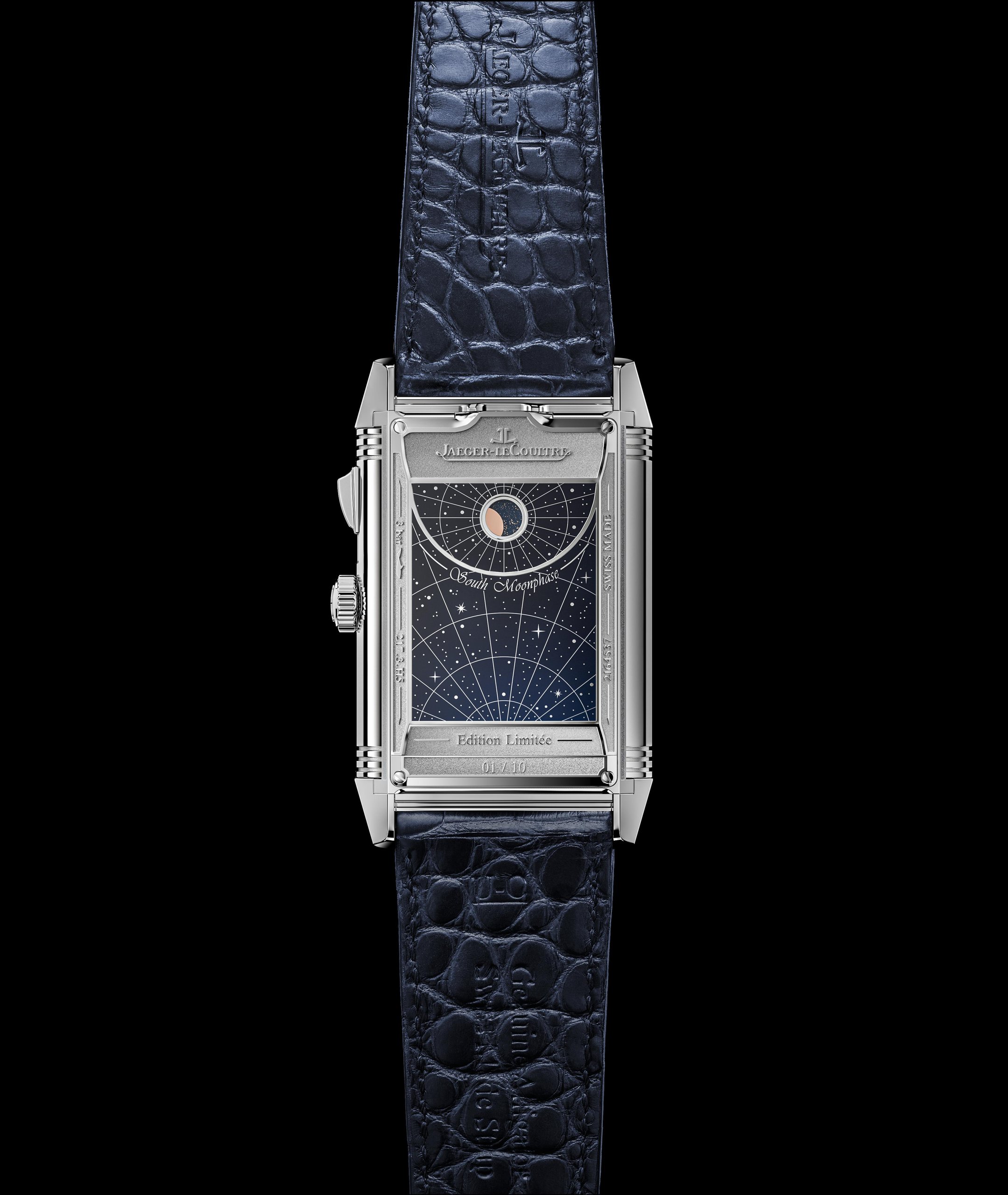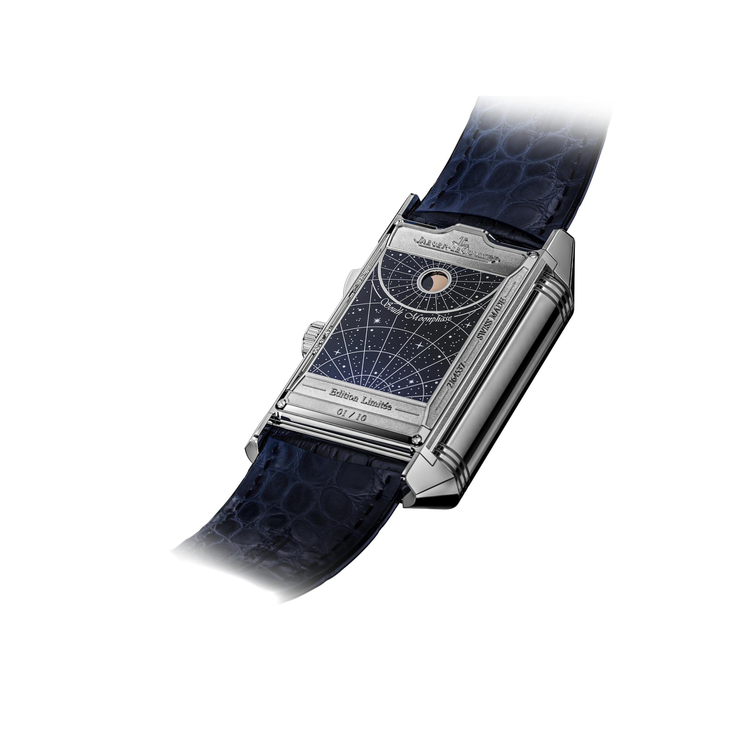 Occupying the top half of the interior face of the cradle of the Reverso Quadriptyque is a massive representation of the phases of the moon in the Northern Hemisphere. A laser-engraved moon is progressively covered and revealed by a mobile blue lacquer disc with gold glitter décor, corresponding to the age of the moon in the synodic cycle. While conventional displays of the moon phase accumulate one day of error after 32.5 months, the moon phase display of the Quadriptyque requires only one adjustment after 1,111 years.