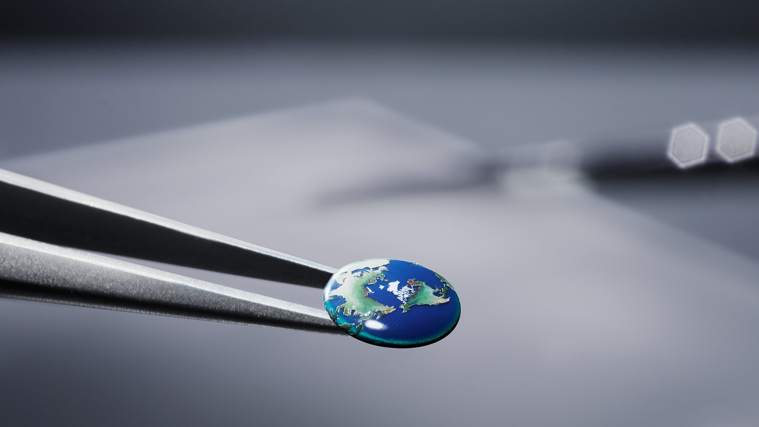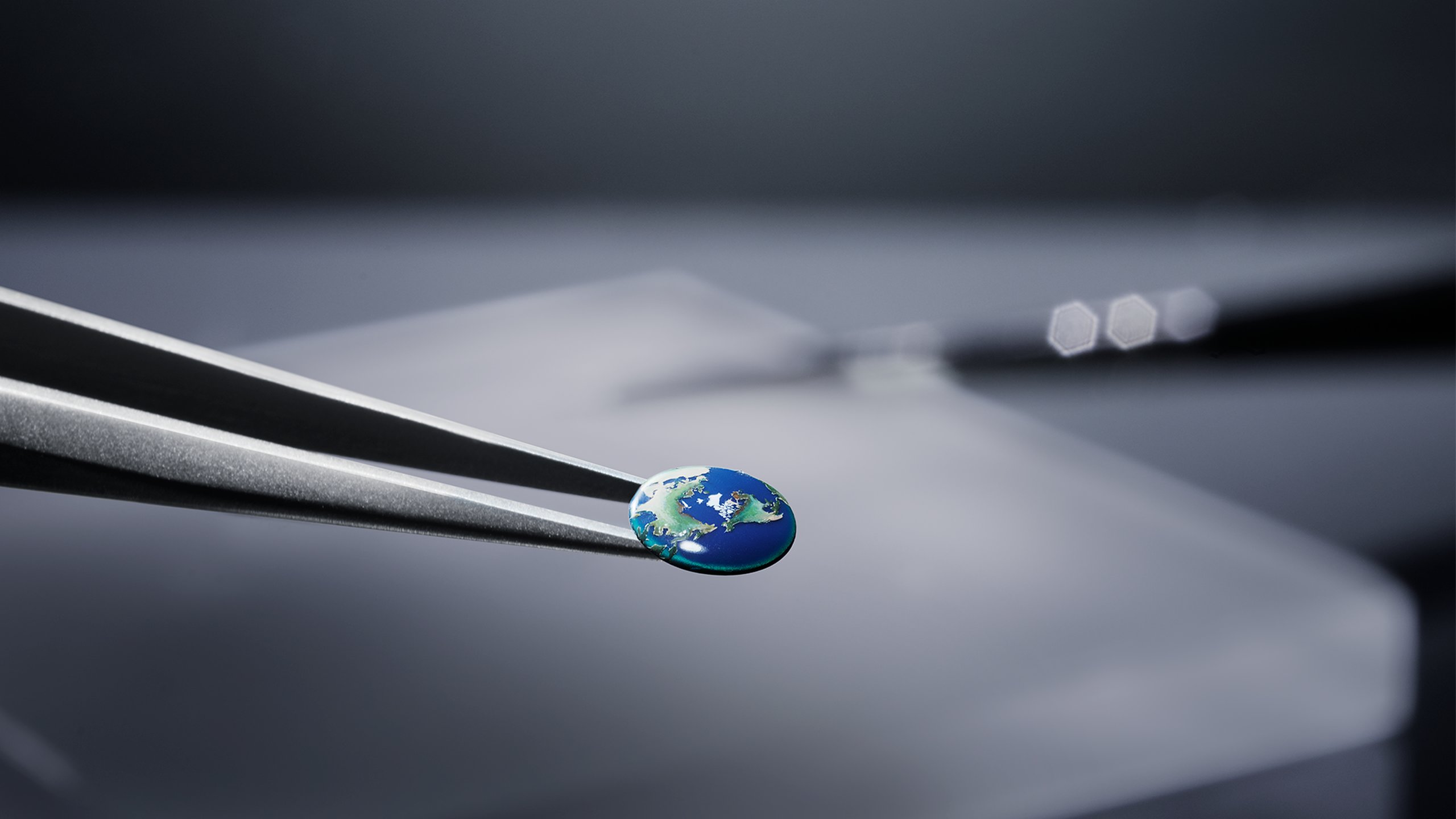 To the right of the draconic cycle counter is a domed representation of the Earth, micro-painted in enamel, with a hemispherical moon in eccentric orbit around it. This counter represents the anomalistic cycle, showing the varying distance between the Earth and Moon. At its apogee, the Moon is at its furthest distance from the Earth and is closest at its perigee. When the Moon is in its full phase near or at the perigee, an event known as a supermoon occurs, in which the Moon can appear to be up to 14 percent larger than usual in the sky.