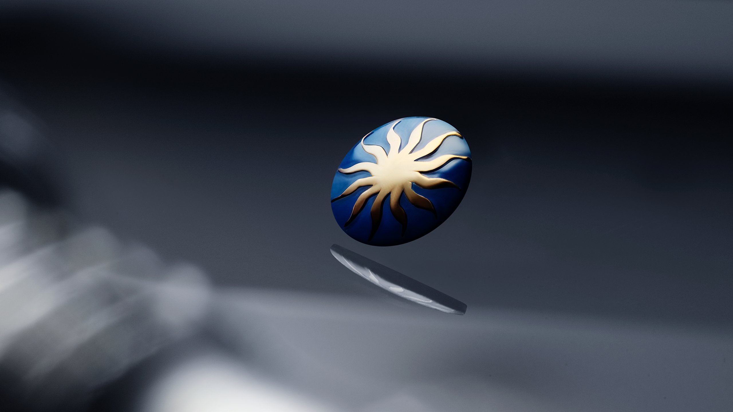 Just below the moon phase display, on the left, is a counter with a three-dimensional micro-sculpted pink-gold sun orbited by a tiny hemispherical moon. This counter shows the draconic cycle, showing when the path of the Moon intersects with the orbit of the Earth around the Sun (known as the ecliptic). Such an intersection takes place twice in each cycle, indicated by the horizontal alignment on the counter of the moon and the sun. At this time, the Moon, Earth and Sun are all on the same plane; however, they may not be aligned. For them to be aligned, a phenomenon known as syzygy, an additional condition must be fulfilled — the Moon must be either in its new or full phase. When that happens, an eclipse event happens on Earth, either a lunar eclipse if the Moon is in its full phase, or a solar eclipse if the Moon is in its new phase. However, the actual visibility of the eclipse is dependent on various factors such as the geographical position of the viewer.