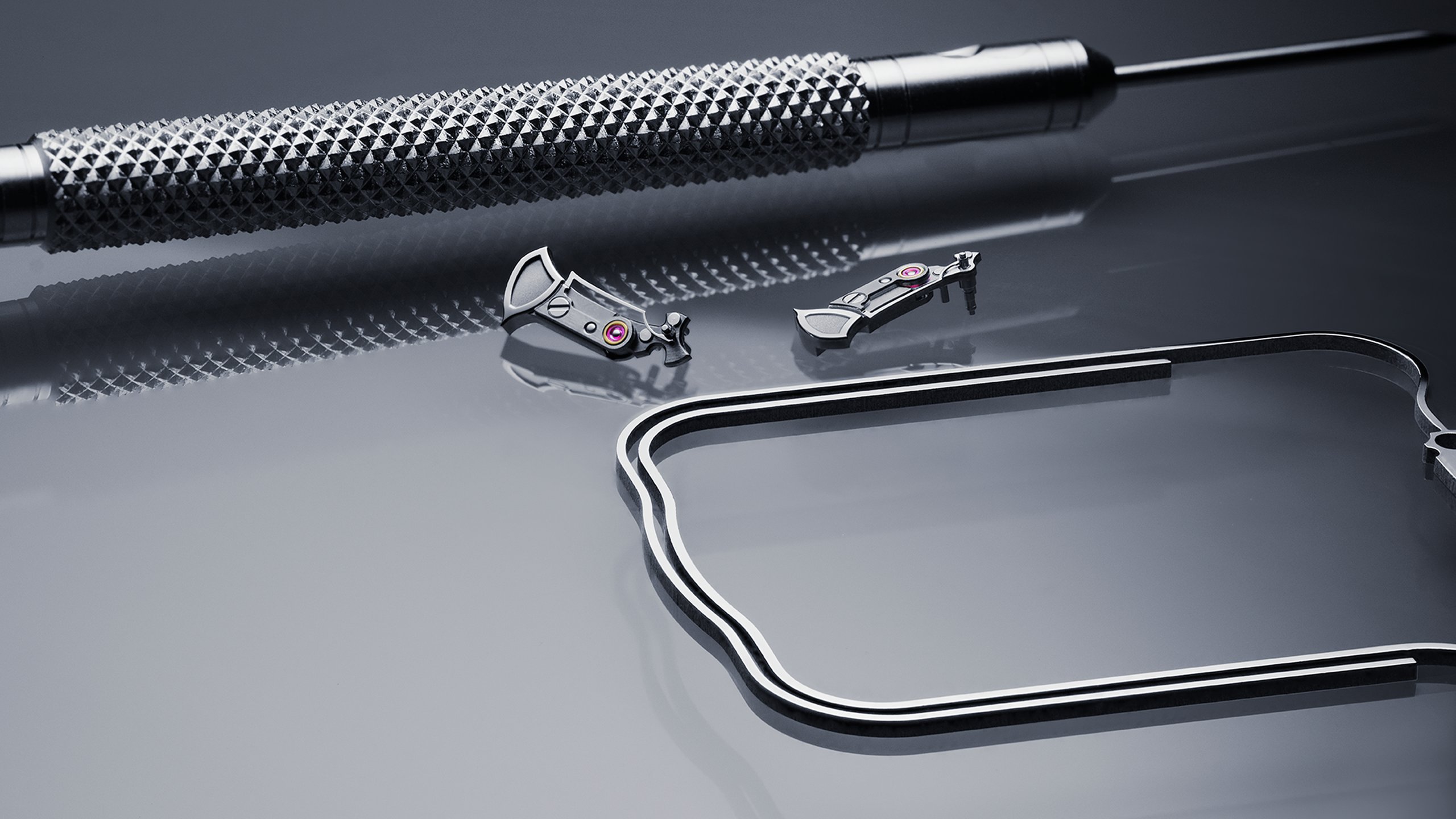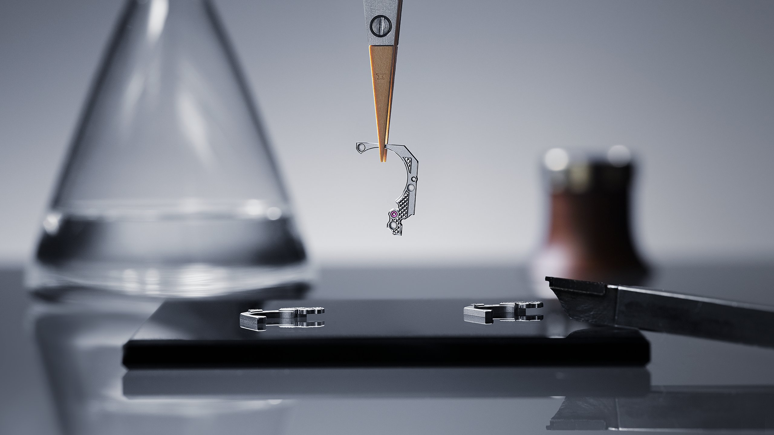 Visible through apertures on the movement plate hand-decorated with the guillochage motif known as clous de Paris are elements of the chiming mechanism uniquely associated with the sonnerie expertise of Jaeger-LeCoultre. These include the silent chime governor, patented by the manufacture in 1895 to eliminate the buzzing noise created by the older anchor system. More recent in-house innovations showcased in the Quadriptyque are the crystal gongs (first seen in the Master Minute Repeater Antoine LeCoultre of 2005) that attach the repeater gongs directly to the sapphire crystal to exploit the material’s optimal acoustic properties, the square cross-sectional profile of the gongs themselves that maximise contact and energy transmission between the hammers and gongs (a mainstay of Jaeger-LeCoultre’s repeating watches since 2006), and the articulated trebuchet hammers (developed for the 2009 Hybris Mechanica Duomètre à Grande Sonnerie) that deliver a clean and strong strike to the gongs. In totality, these innovations allow Jaeger-LeCoultre minute repeaters to produce some of the loudest and clearest chiming wristwatches today.