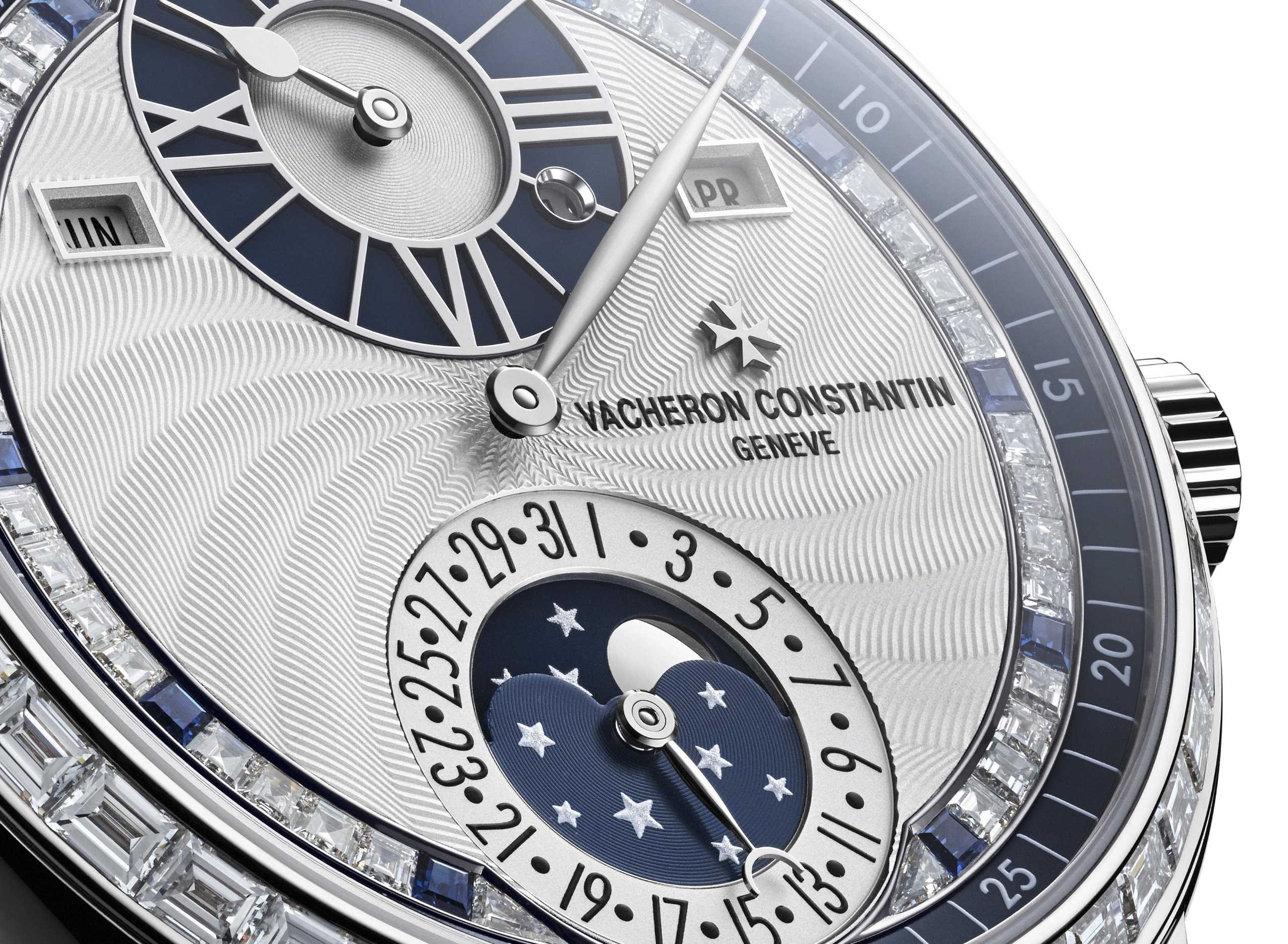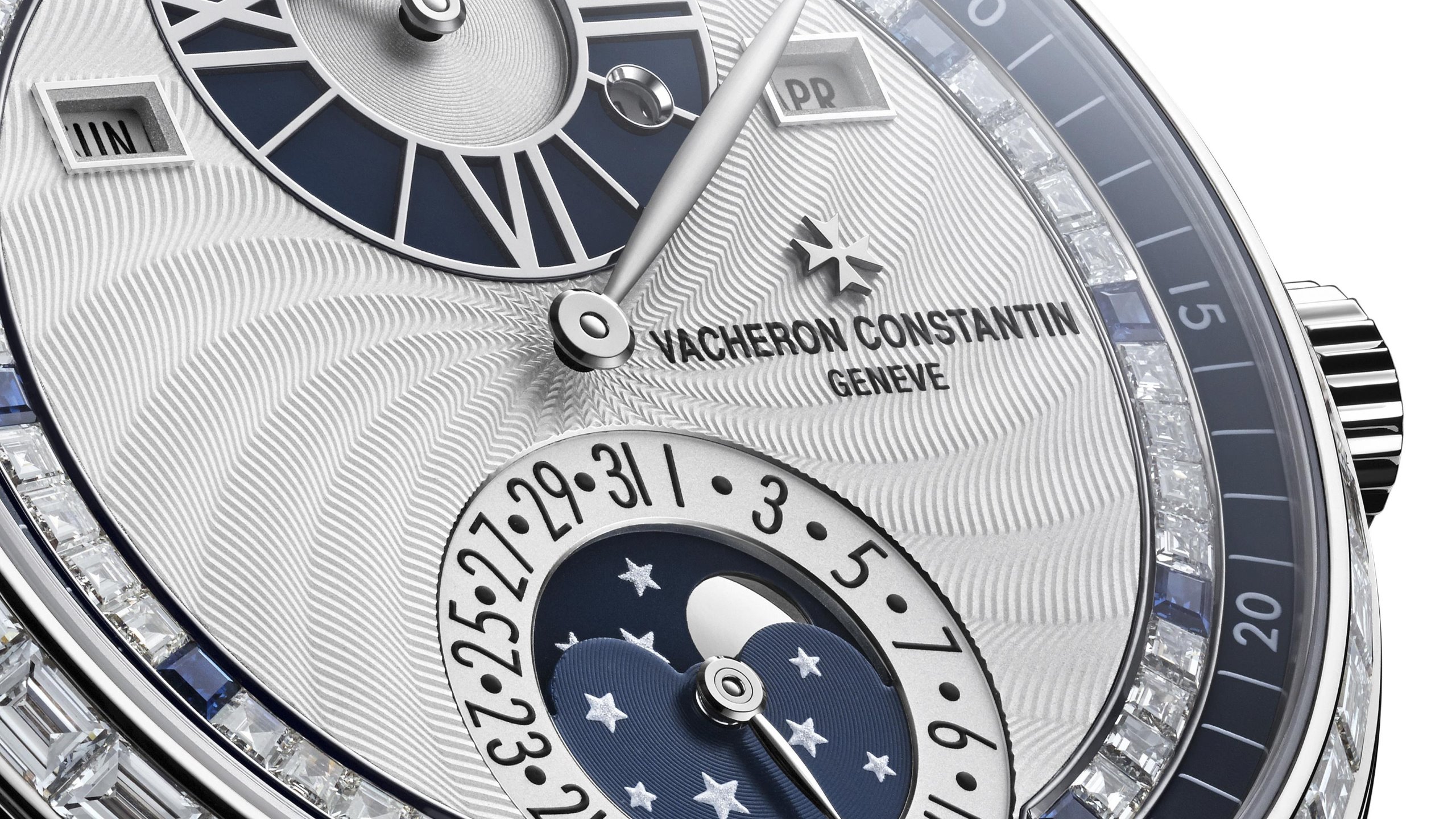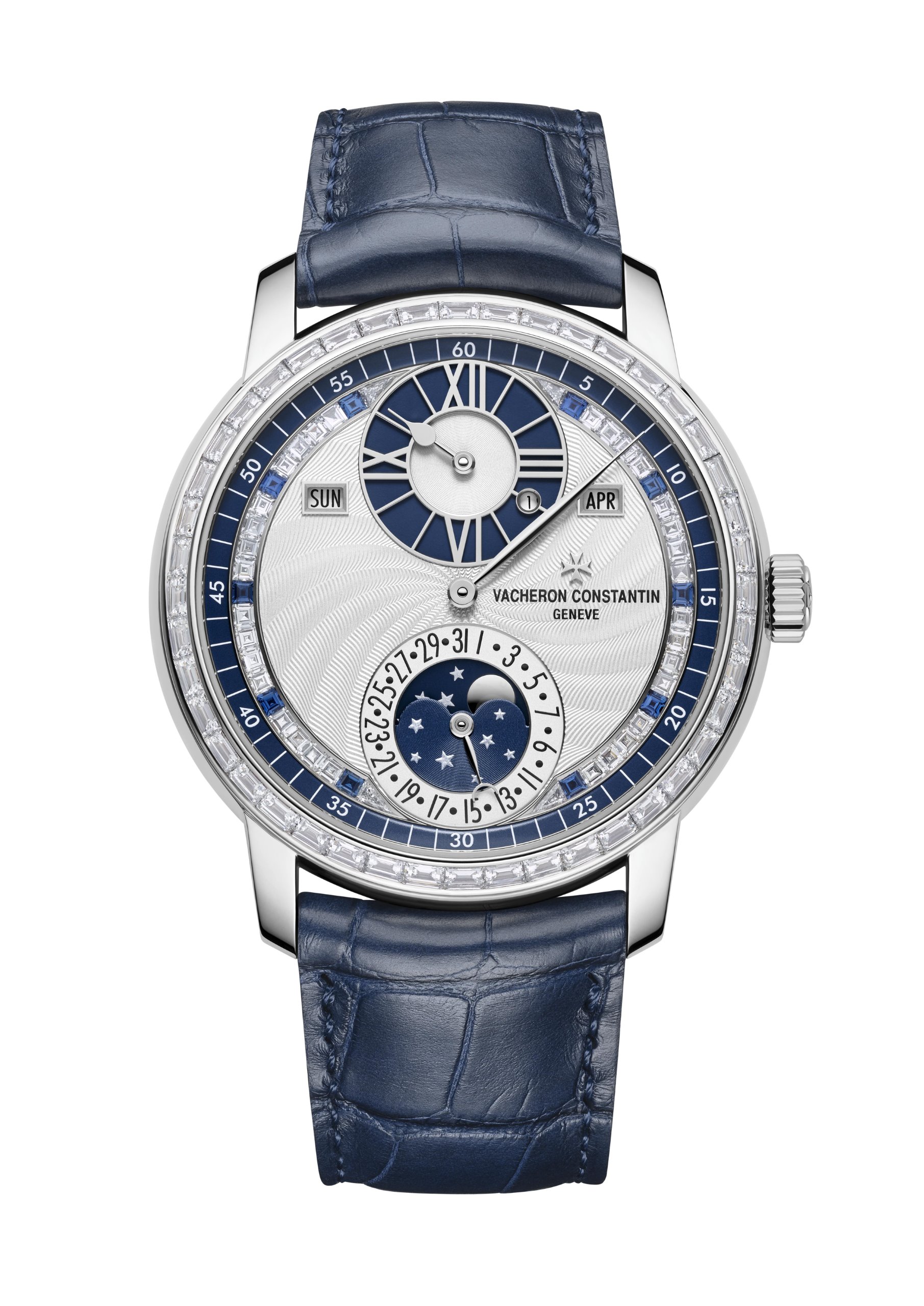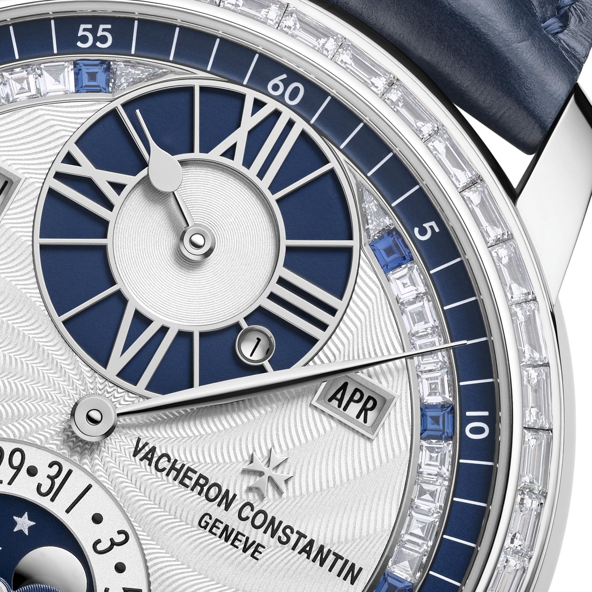 Perfectly illustrating the creative spirit of Vacheron Constantin, this single-piece edition has been preciously embellished by the gifted artist’s hands of artisans. On the dial swept over by white gold hands, the guilloché artist has created a delicate spiral pattern, enhanced by a row of 44 baguette-cut diamonds rimming the bezel. The silver-toned dial is also set with an edging of precious stones facing the minute track, a border composed of 36 baguette-cut diamonds, alternating with 10 sapphires positioned every five minutes. The spark of the sapphires is further accentuated by the two hours and moon-phase subdials, which adopt the same dark blue hue.