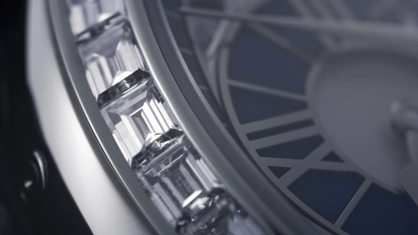 Silver-toned dial hand-guilloché with spiral motif, set with 36 baguette-cut diamonds (0.6 ct) and 10 sapphires (0.2 ct)
