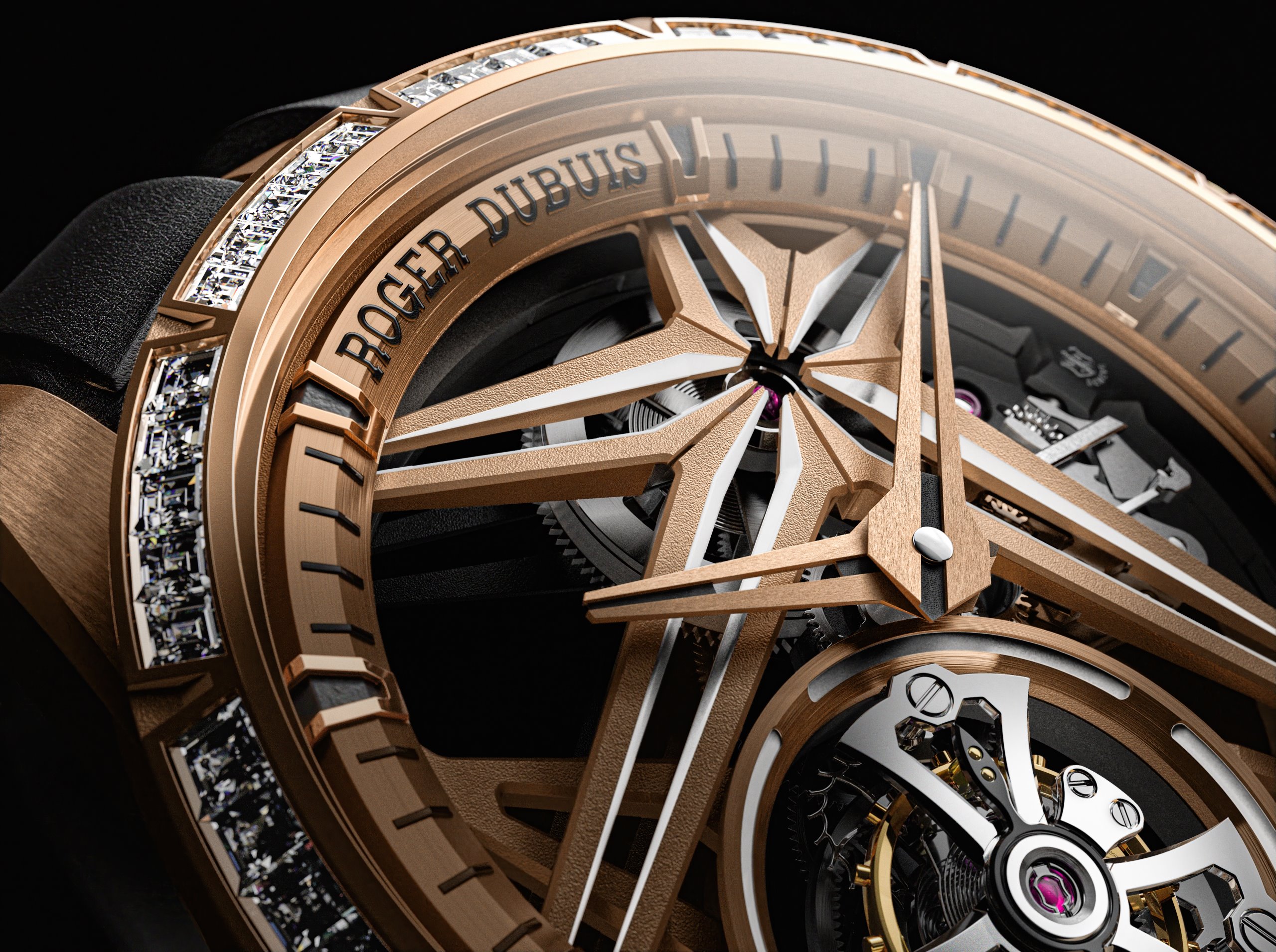 A contemporary masterpiece for the wrist, the new design showcases clean cut lines on both case and movement. Creating the impression of a thinner look and feel, while heightening the sense of transparency and depth, the calibre is rebuilt from bottom to top in an architectural feat that sees the Roger Dubuis star now levitate freely above the barrel. A strong visual identity is created with a signature two-line pattern – seen between the notch on the crown and bezel, the star’s arms, the tourbillon’s cage, the hour’s marking on the flange, the hands – all of which cleverly appear as though they will meet but never do. This dynamic aesthetic is amplified by the Poinçon de Genève, the most demanding signature in fine watchmaking and one that requires the manual decoration of each and every component of the watch, as well as unexpected and antinomic decorations in modern haute horlogerie, such as circular-brushed top surfaces and polished angles that demonstrate Roger Dubuis’ visionary approach.