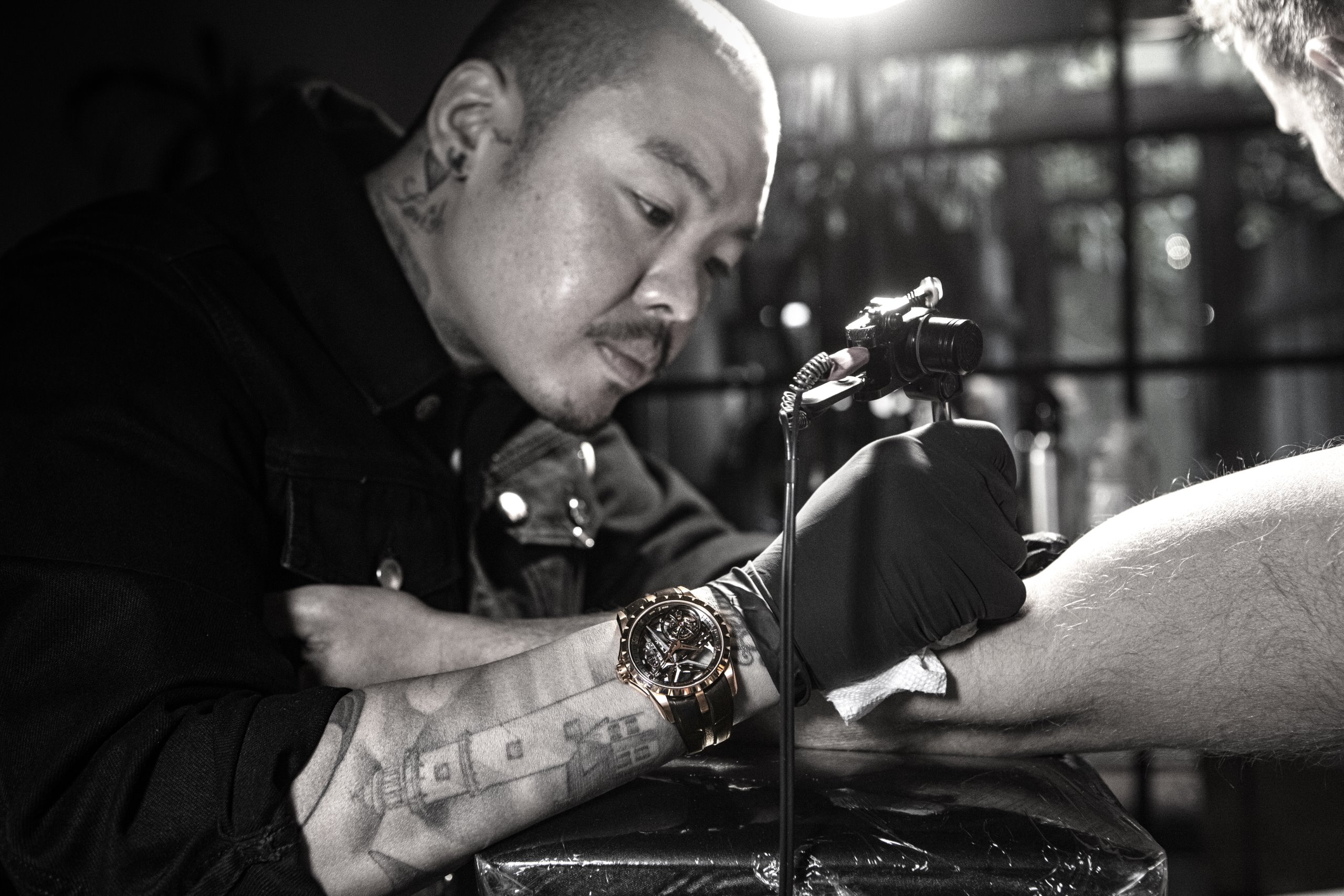A leading name among an influential elite who see tattoos, art and fashion as an indissociable whole, Dr. Woo’s singular approach to needle style has shifted the paradigm for tattoos, taking them from subculture to broad popular appeal. Of the partnership he says: “I’ve taken this path because I don’t know where it leads, and that is exactly why I’m here – to seek the unknown and go out of my comfort zone. Tattooing and watchmaking have that in common: the same attention to detail, a dot vs. a tiny component, assembled perfectly for you to see the bigger picture.”