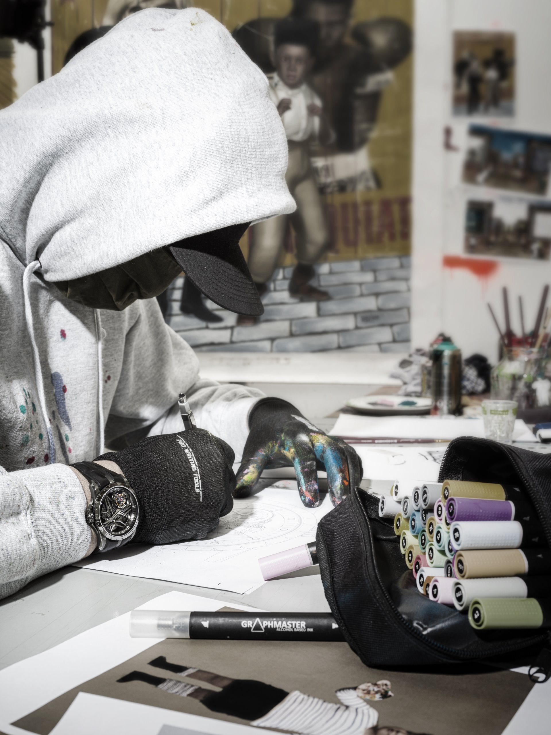 Gully, a well-known graffiti artist, chooses to work exclusively in his own atelier to maintain his anonymity. He uses a wide variety of mixed techniques and materials and explains his artistic concept as one based on conscious appropriation. Telling visual stories of children appearing in splendid settings, he reveals their enchantment with art and particularly with the paintings of the great masters. Speaking to the concept of the tribe, he comments: “Two worlds, a crossing path. I feel driven by the same energy and insatiable envy to come up with something we have never seen before. It comes as a bombshell, provokes surprise, and arouses interest. Bringing different worlds together is my trademark, so I can’t wait to show you the Gully x Roger Dubuis mixture.”