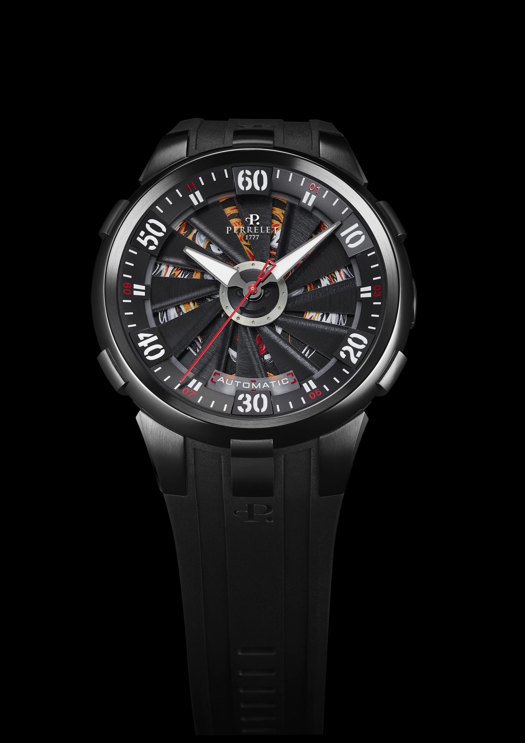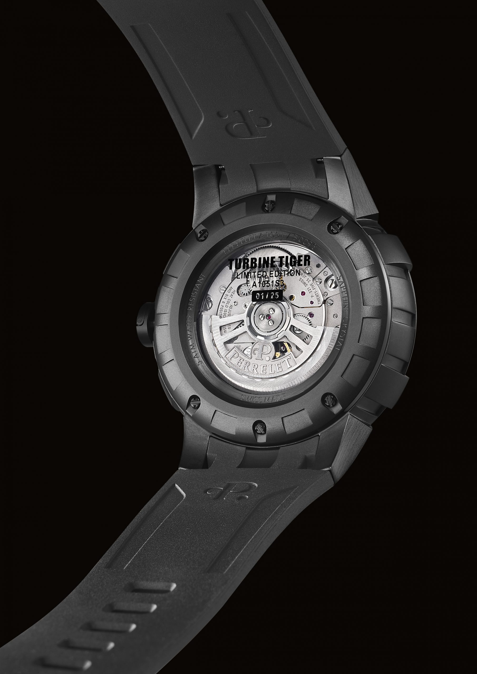 Perrelet “Turbine Tiger” is completed by a black rubber strap embellished with vertical fluting and a black PVD-coated steel pin buckle with the brand logo.