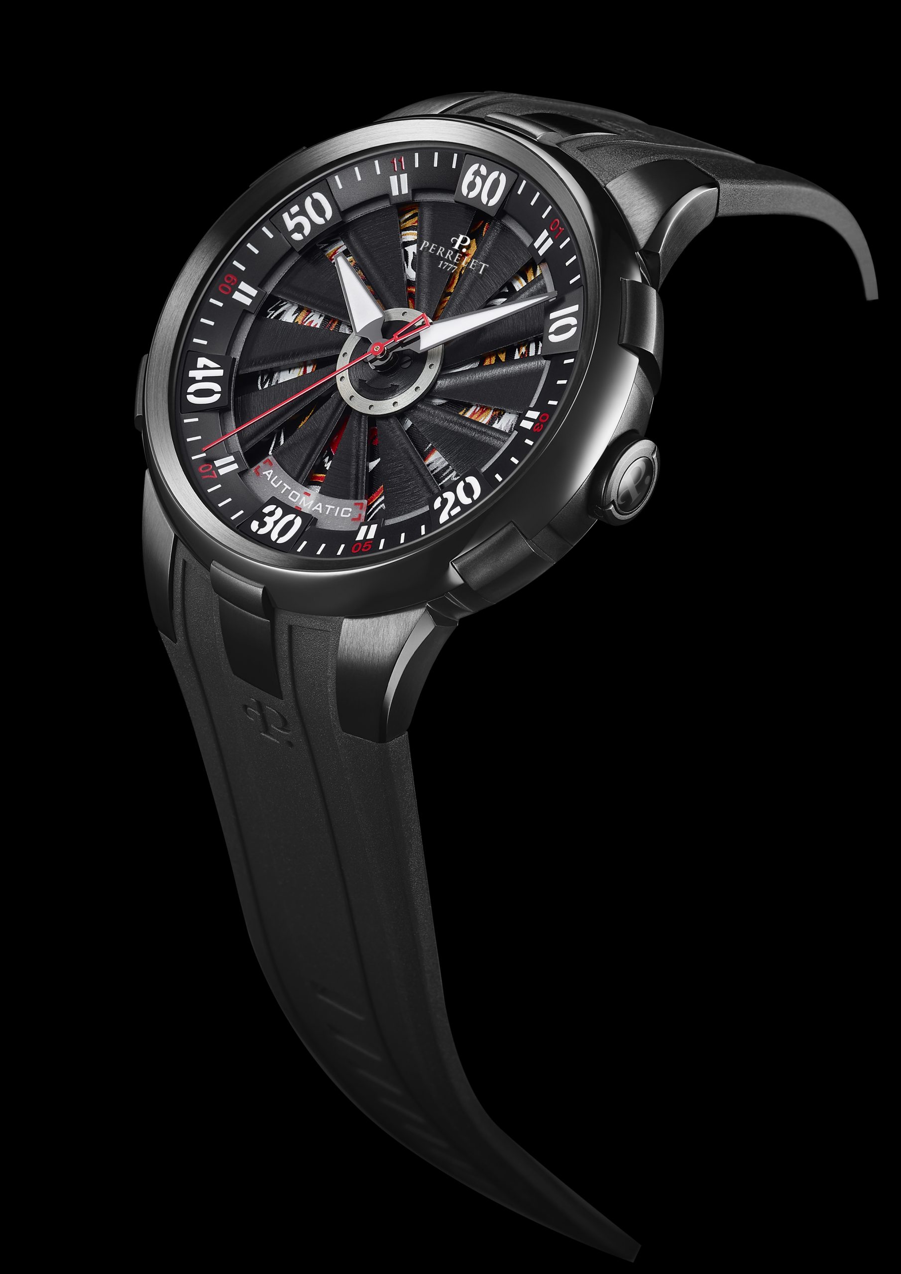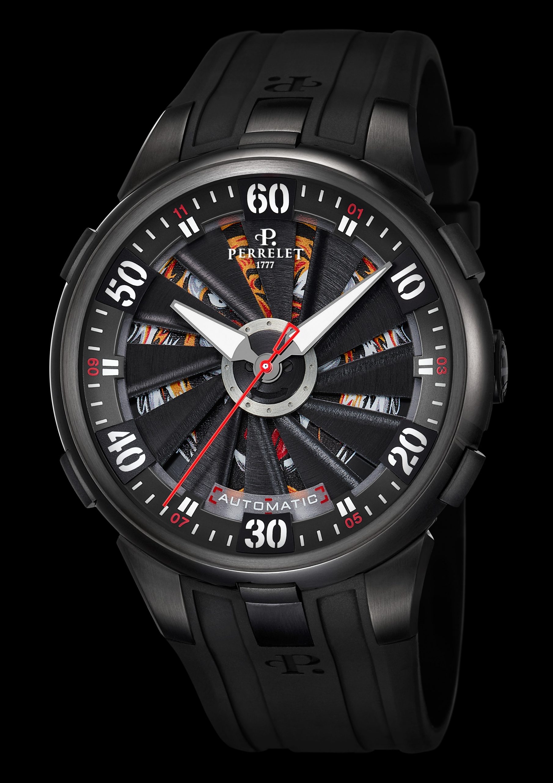 - Black personalised rubber strap with black PVD-coated steel pin buckle, embellished with the Perrelet logo