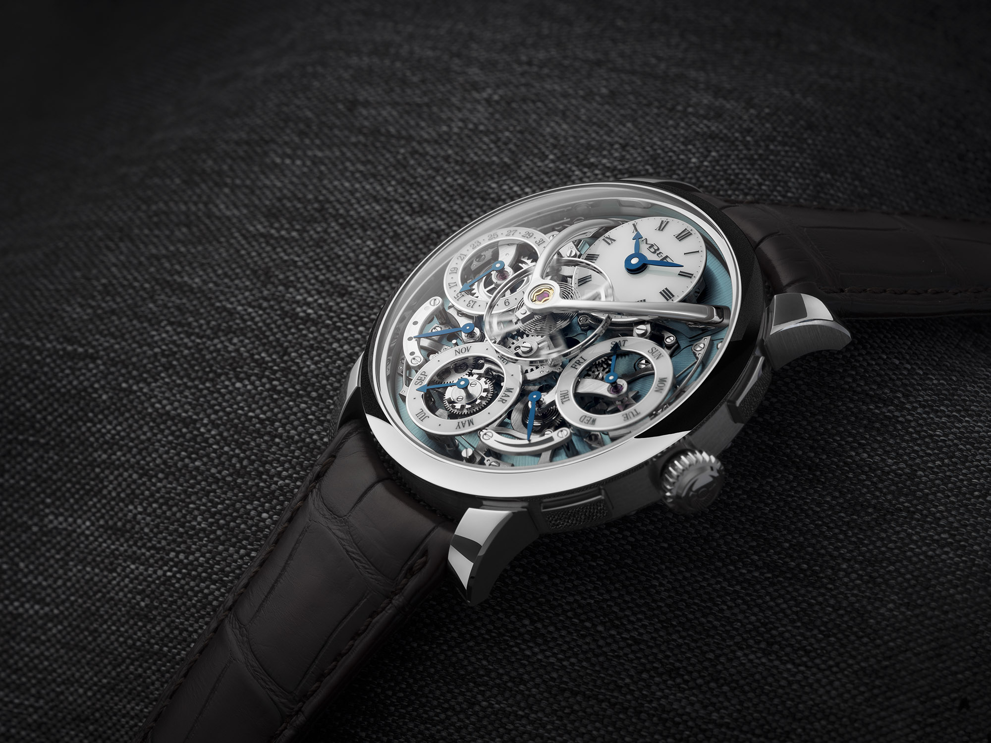 Using an innovative system developed especially for Legacy Machine Perpetual, the subdials appear to “float” above the movement with no visible attachments. The skeletonised subdials rest on hidden studs, which is technically impossible with traditional perpetual calendar mechanisms because they would block the movement of the grand levier.