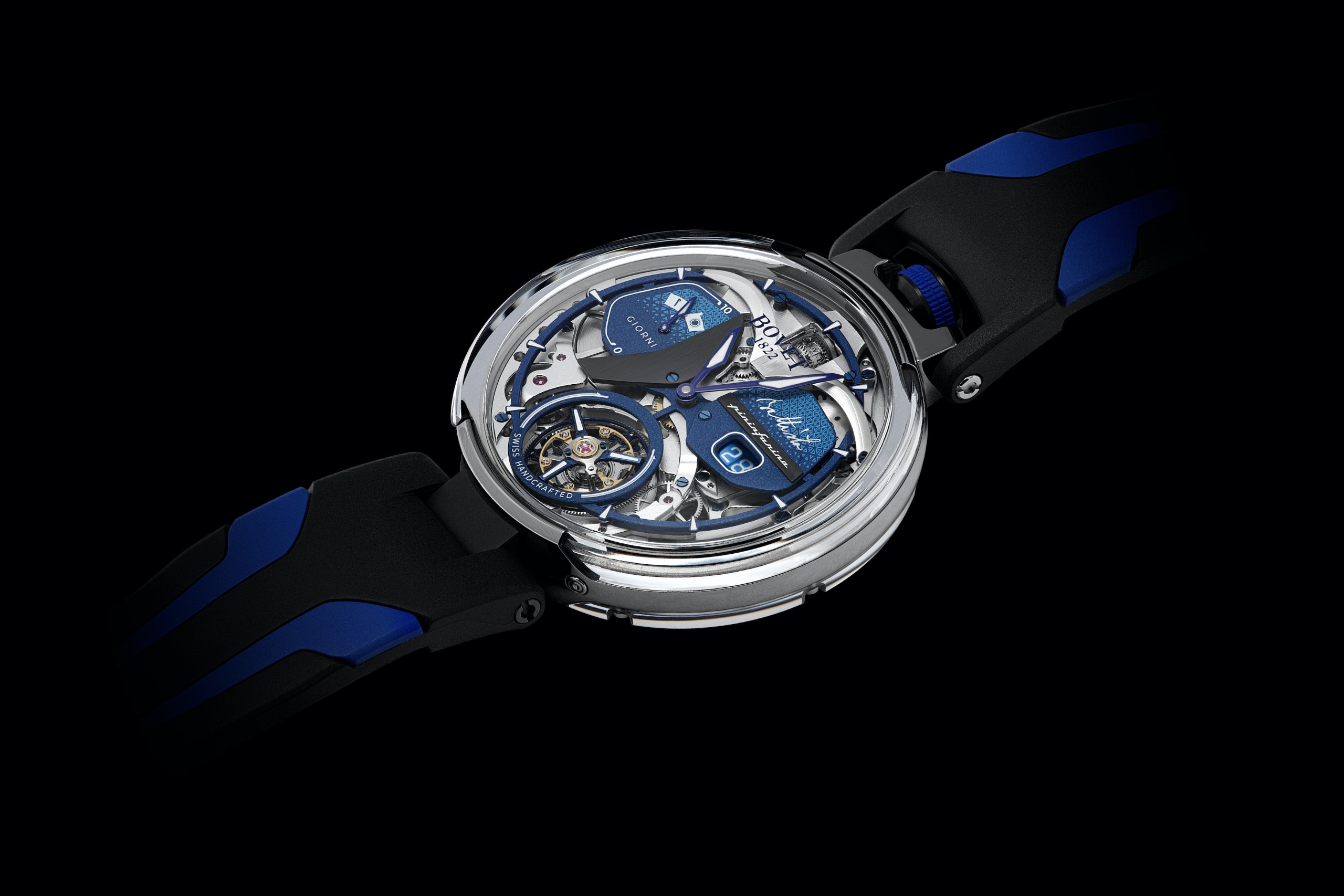 Further references to Battista’s design can be found throughout the face of the timepiece. Above the two main dials, the flying bridge resembles Battista’s curves, and the “V” in BOVET, while the tourbillon cage is inspired by its Impulso wheels of the Battista with their centre-lock technology. The hands of the timepiece and the hour-indication ring are a reference to the curves of Battista’s exterior.