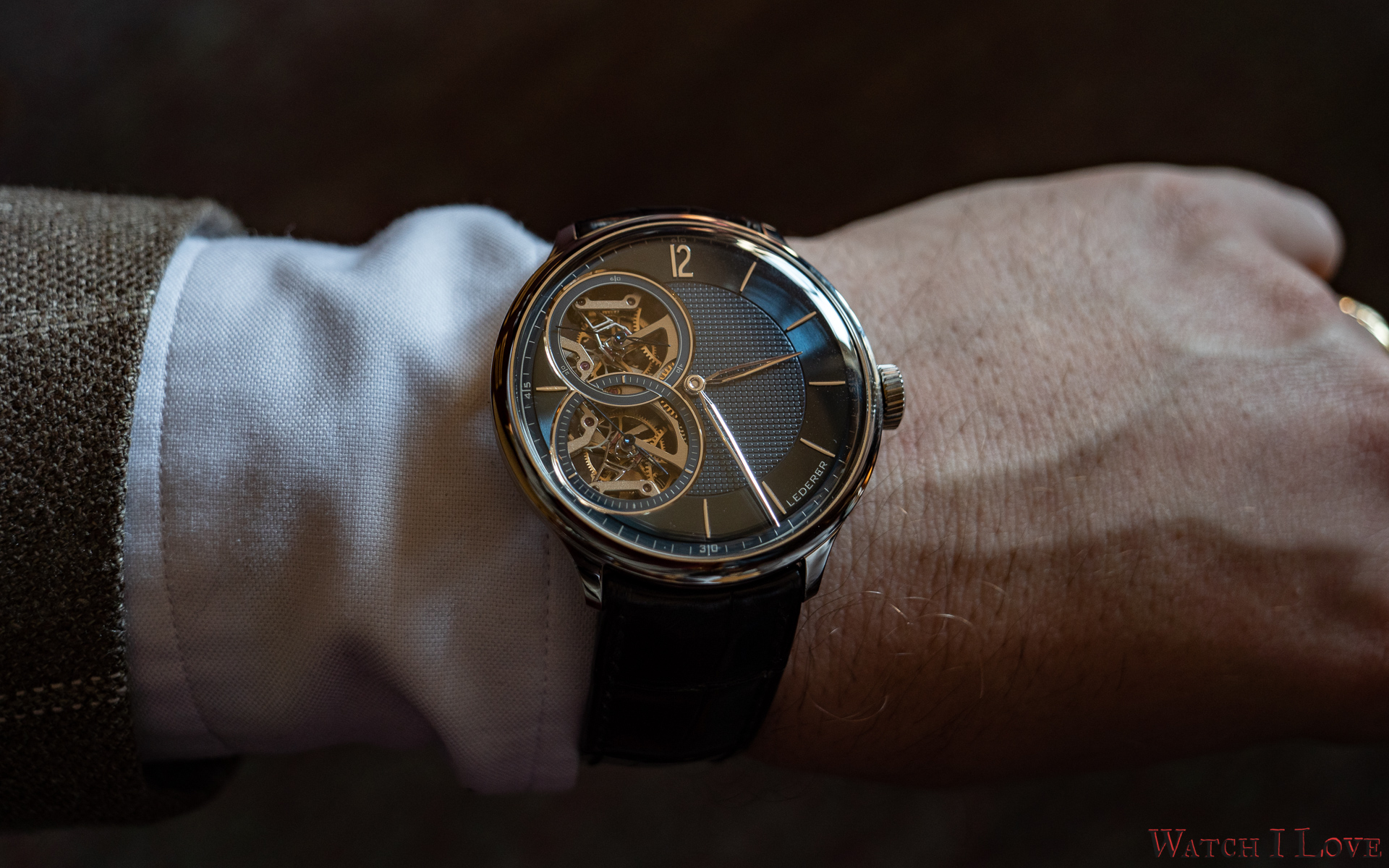 For the final version, Bernhard Lederer opted for skeletonised and faceted leaf hands, in my opinion much more suitable for this elegant presence as the sporty SuperLuminova filled seen last year. The hands and the indexes are manufactured in white gold, matching the case material.