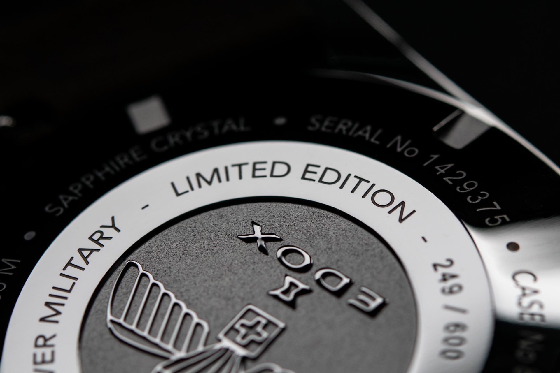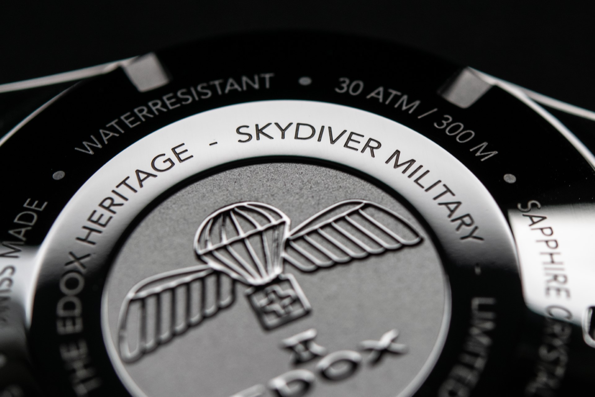 But the materials and construction of the contemporary Edox SkyDiver Limited Edition are pure 21st century. Military styling runs right through the SkyDiver’s DNA, from its semi-matt finish dial to the solid case back proudly portraying the emblem of a paratrooper unit.