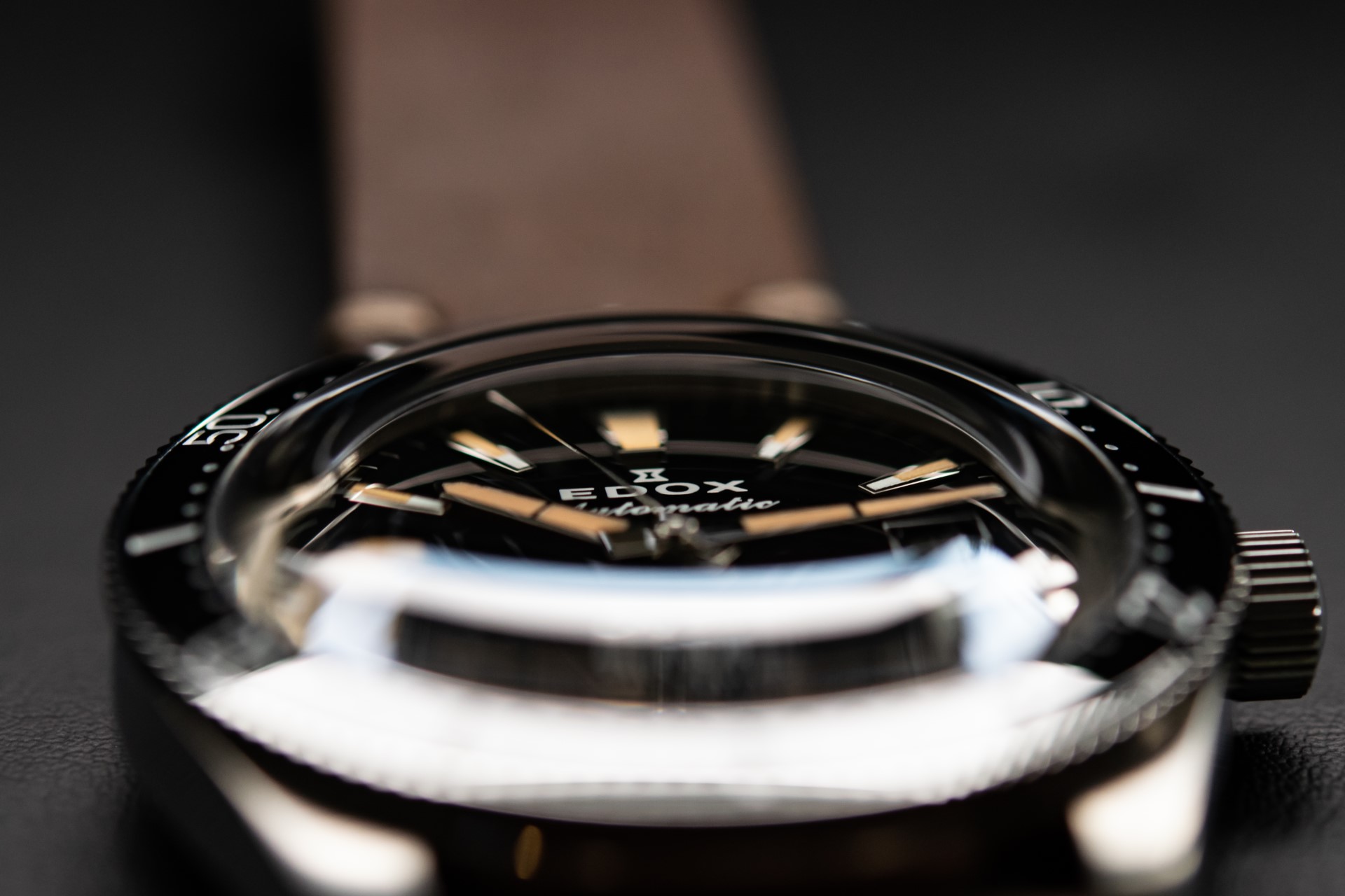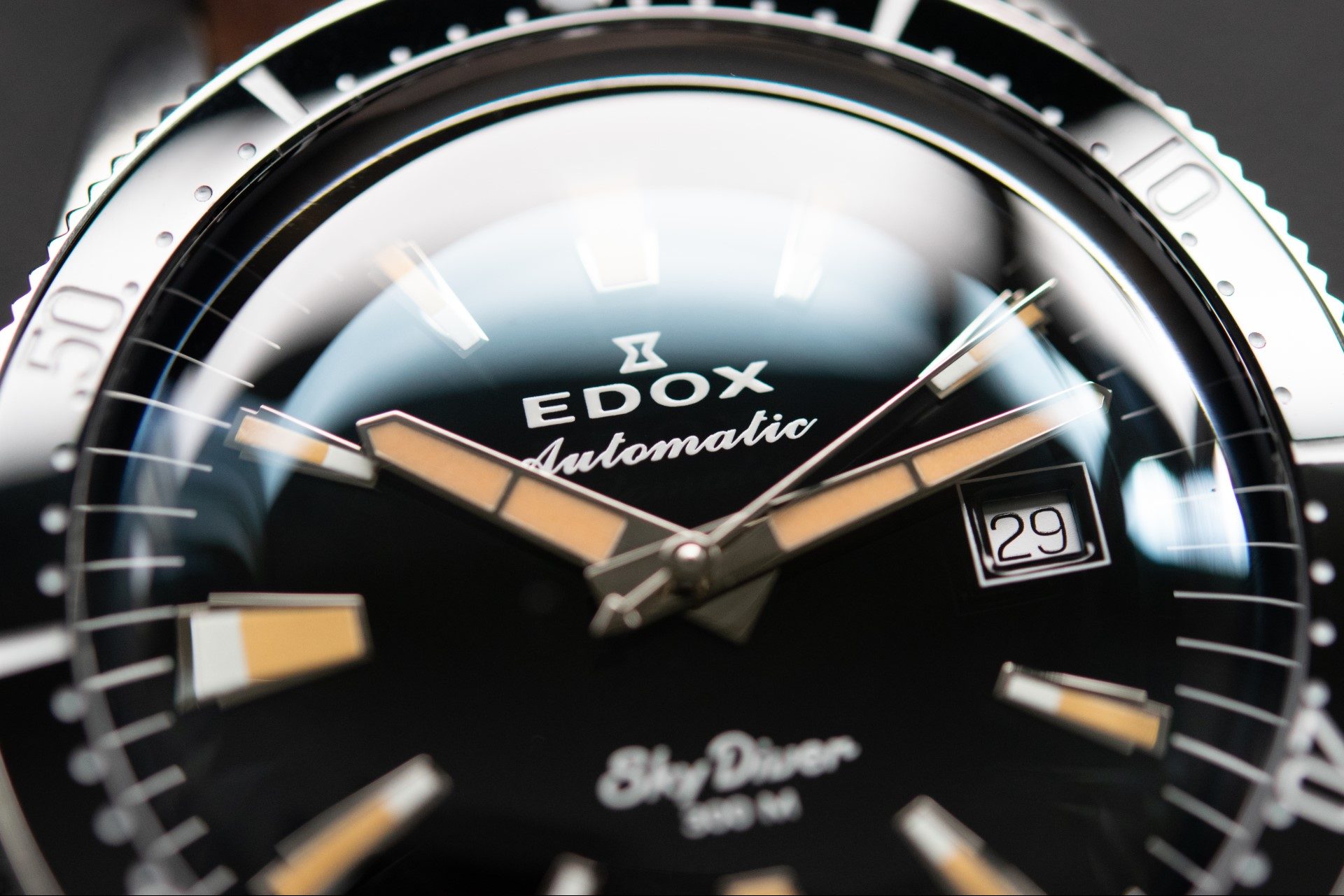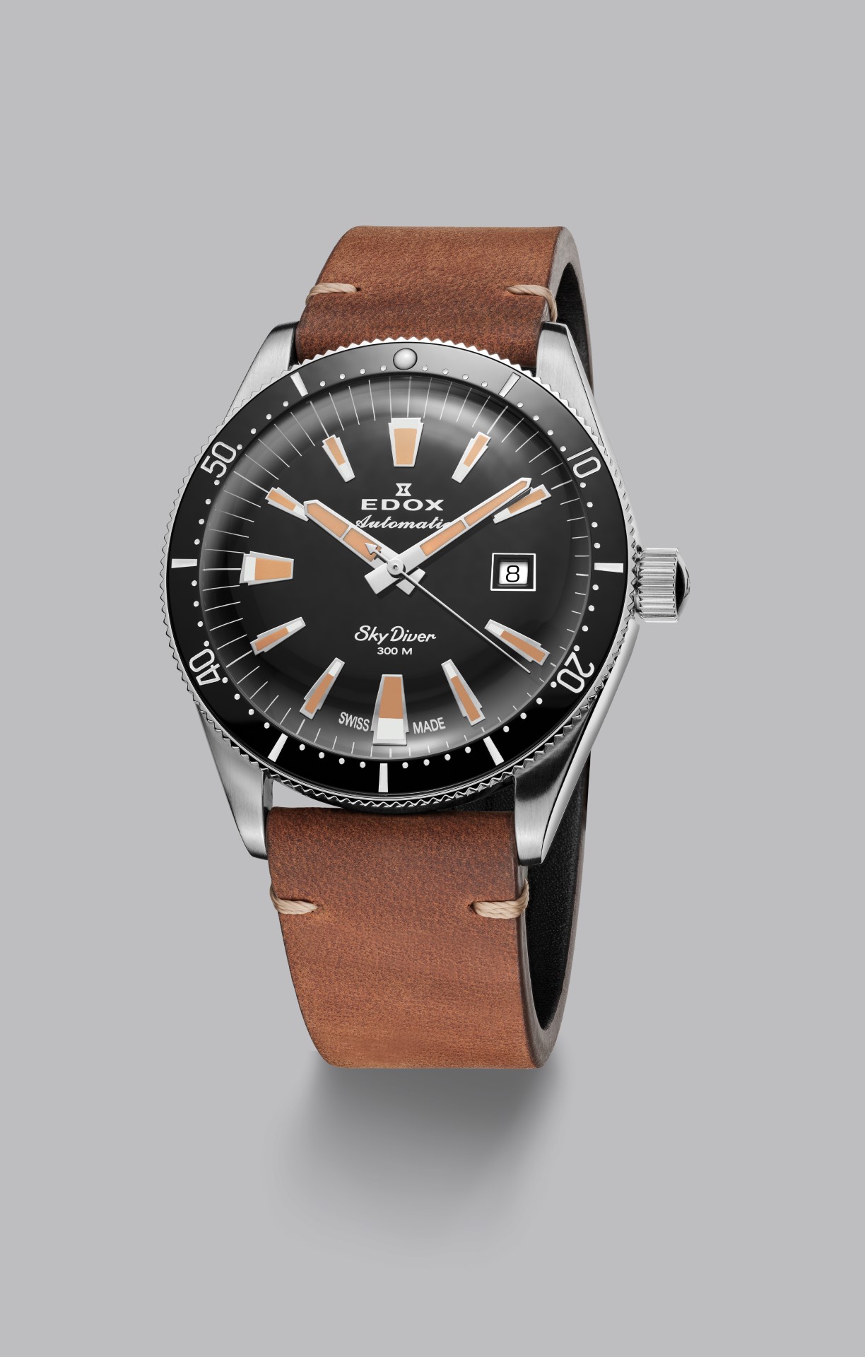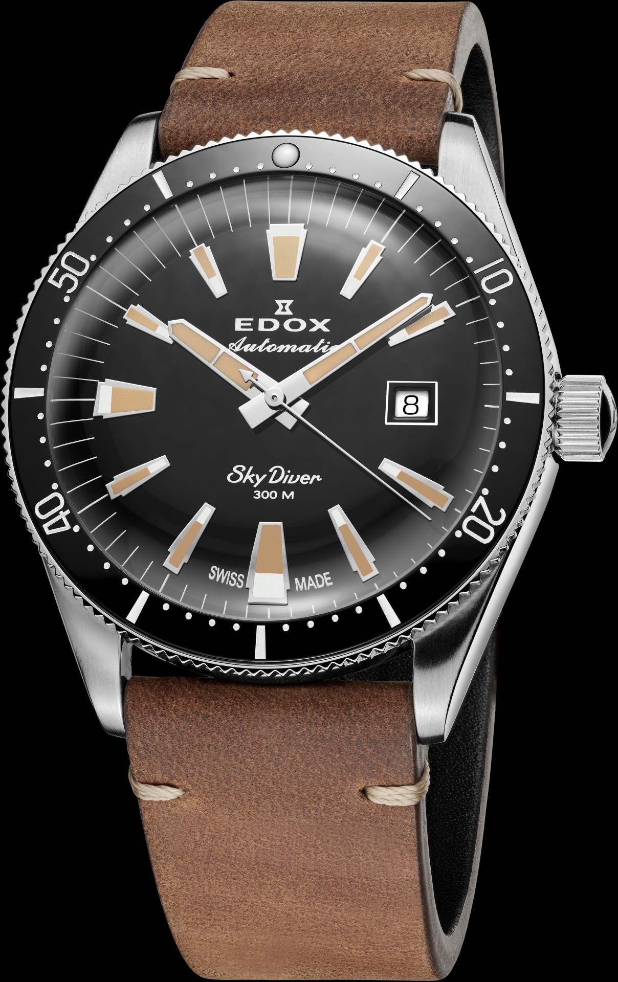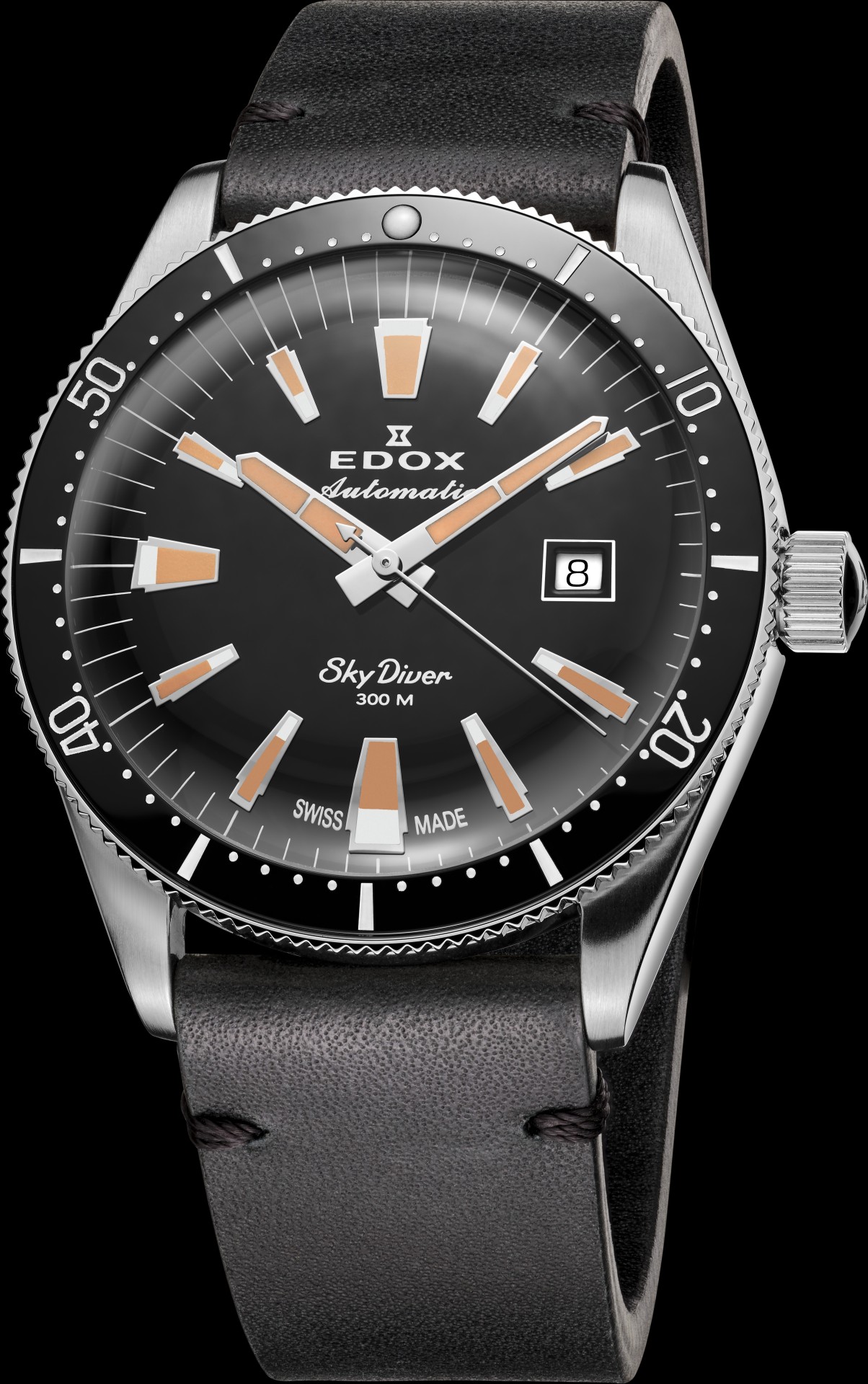 The beautiful case, black dial, striking indices, oversized crown and domed scratch-resistant sapphire crystal faithfully reflect an Edox SkyDiver watch designed by Edox in the 1960s. The black dial reflects the precision instruments that once accompanied adventurers conquering land, sea or air – the Fly, Drive and Dive challenge that suit Edox watches to a tee.