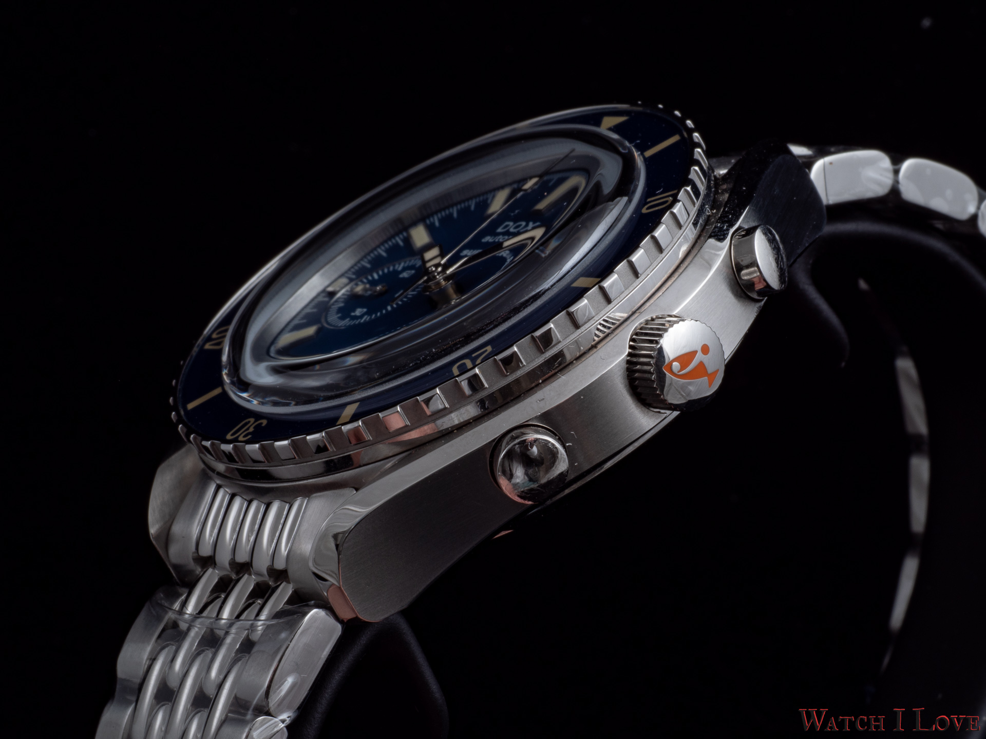 The short chrono-pushers make a nice figure on the right side of the case. A nice touch is represented by the partially protected screwed crown that features the orange lacquered Doxa logo. The watch is enriched further with a sapphire insert in the flat bezel. The domed sapphire crystal contributes to a professional (but also vintage) look.