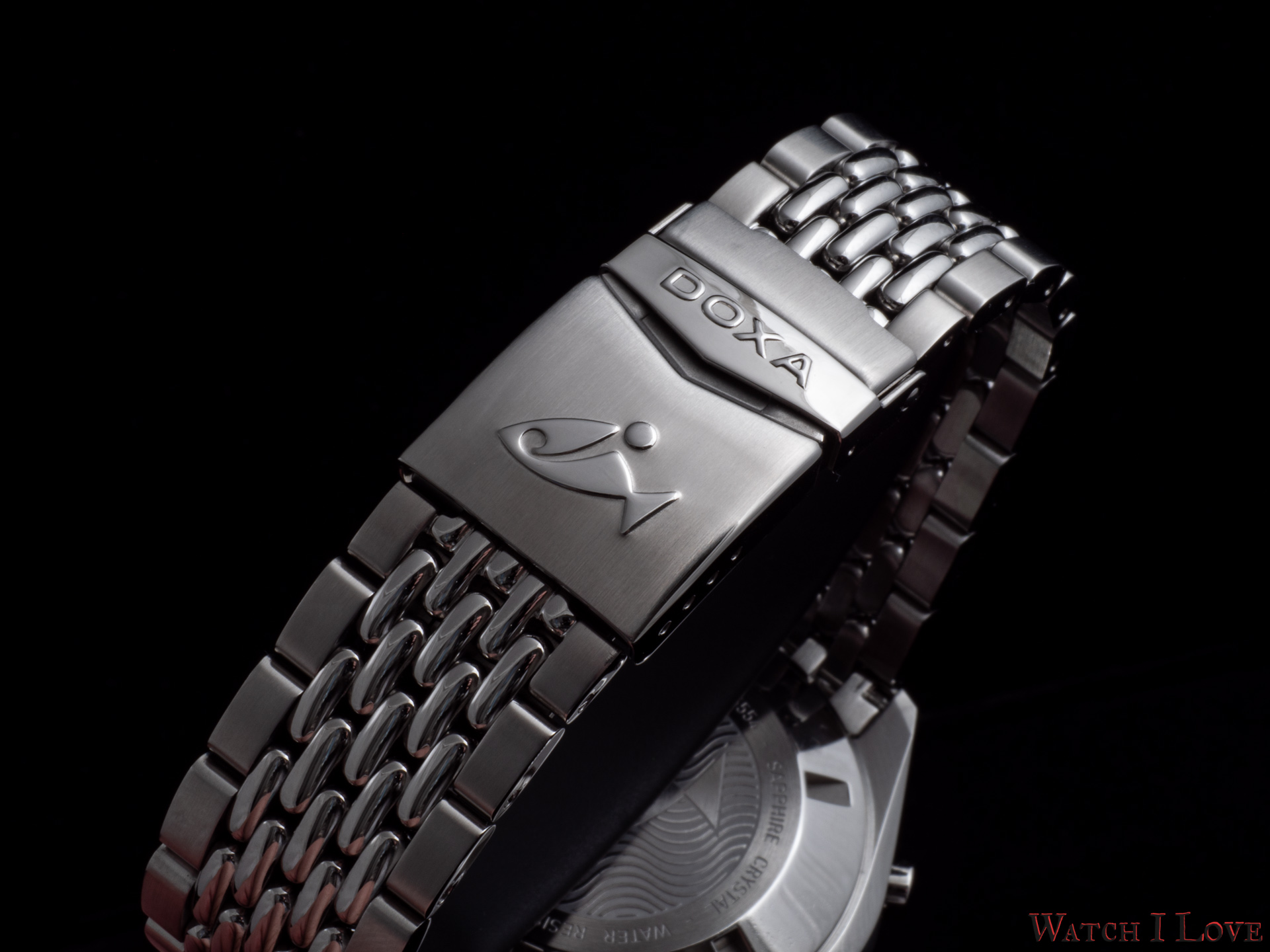 - Stainless steel ‘rice bead’ bracelet with a deployant clasp featuring a diver’s extension and the ‘DOXA fish’ symbol.