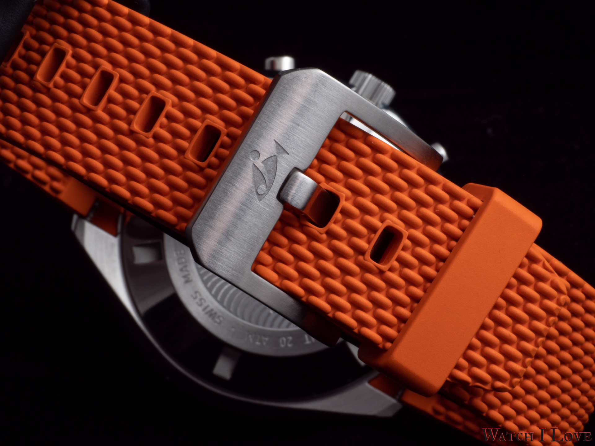 The rubber strap is available in orange (Doxa‘s traditional colour), black, blue, aquamarine and yellow. The pattern imitates the rice beads of the metal bracelet but in a finer and subtler design. The straps come with a brushed pin buckle with an engraved logo.